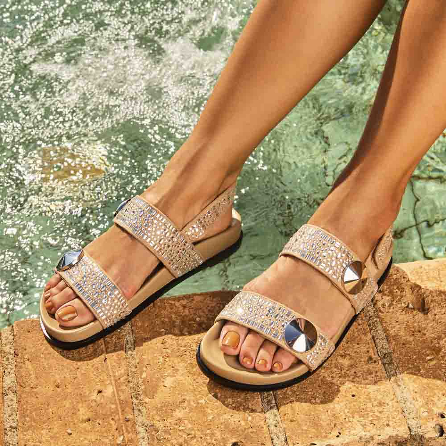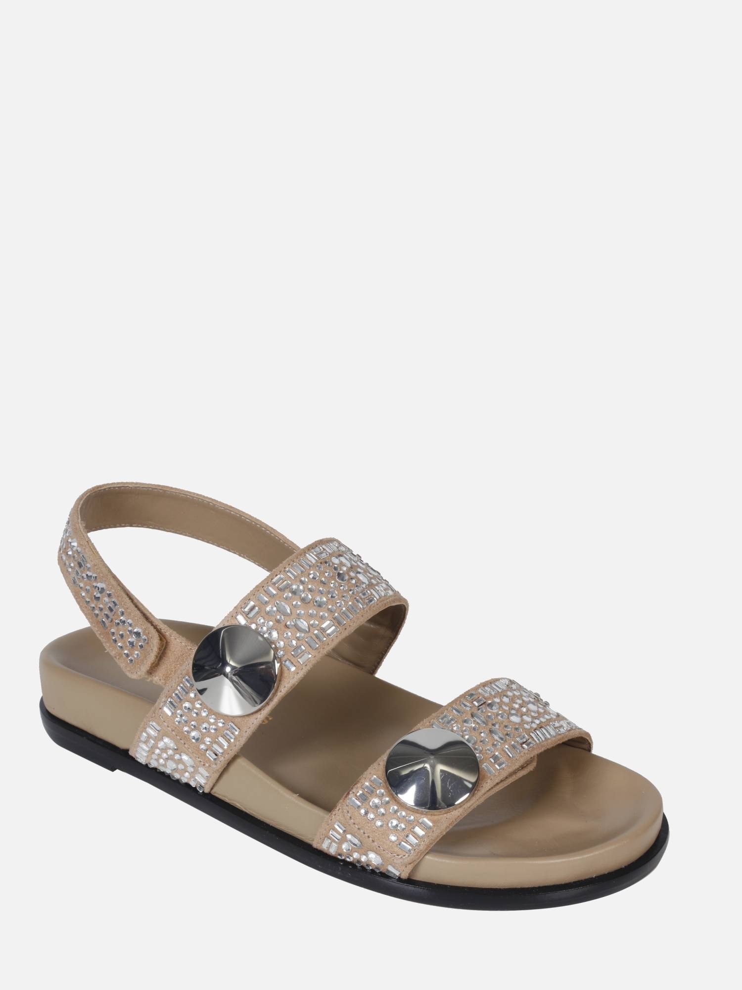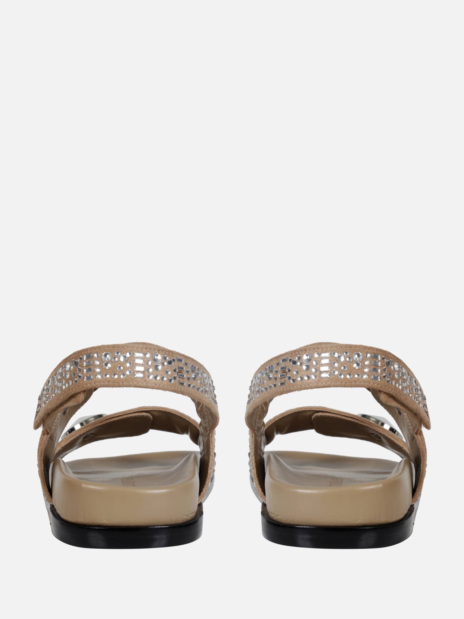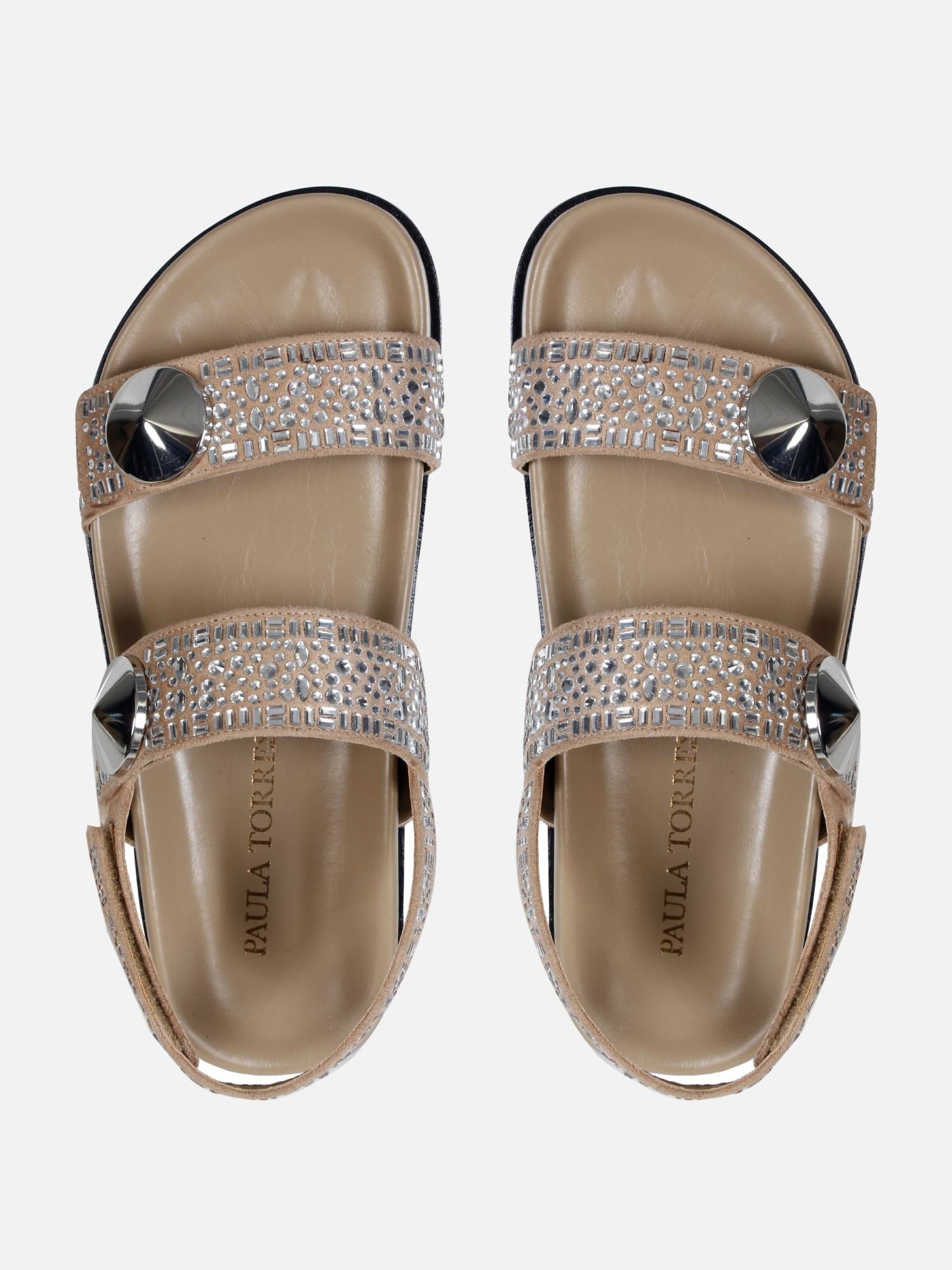 A Papete Ella é produzida em camurça e couro. Duas tiras largas com a aplicação de cristais sobre a camurça em diferentes formatos finalizadas pelo clássico botão Paula Torres em prata. Fechamento por velcro na tira traseira. Palmilha anatômica revestida em couro e vira delicada.