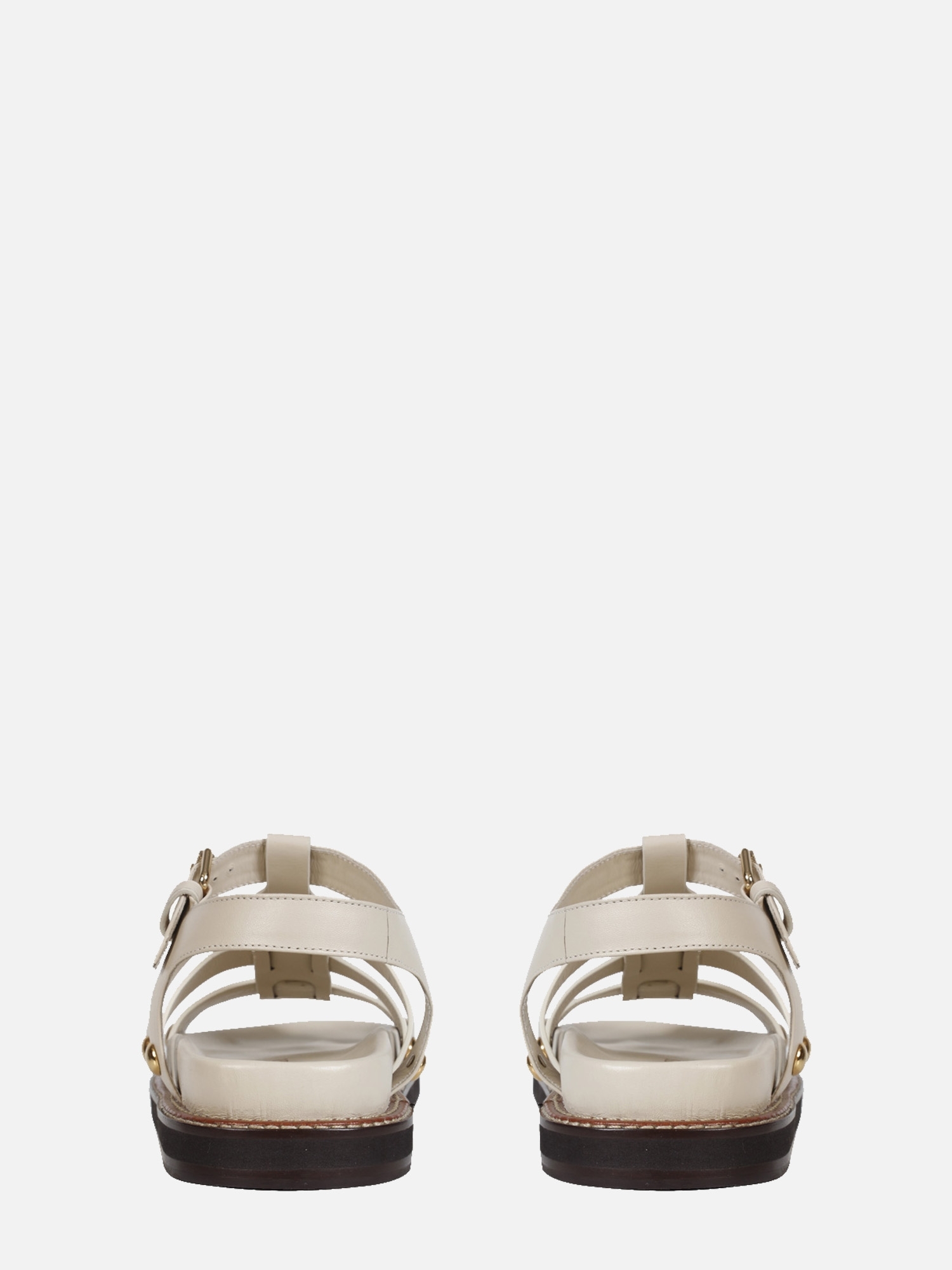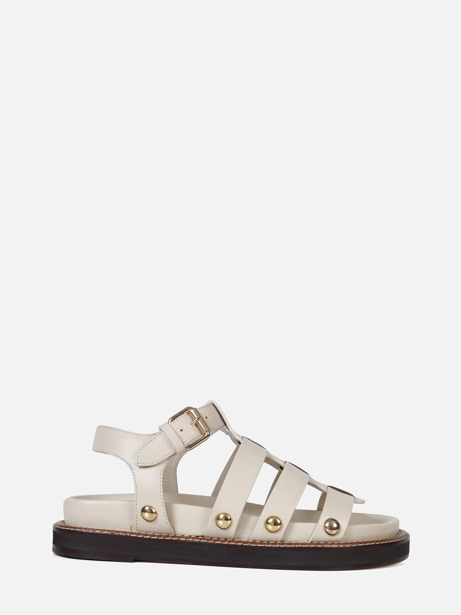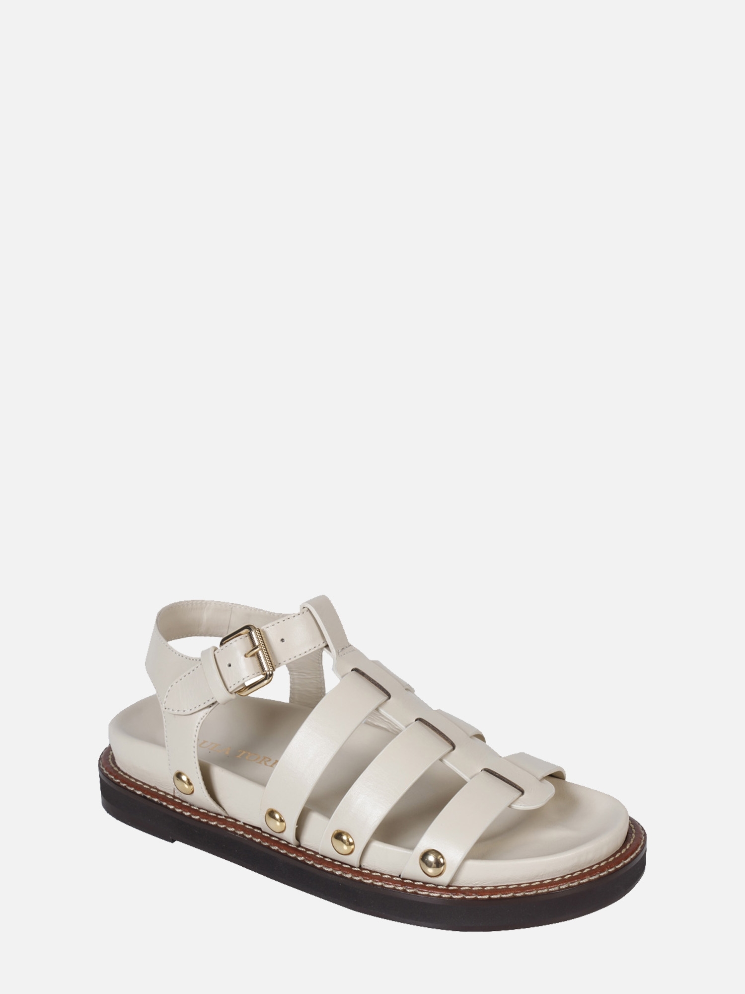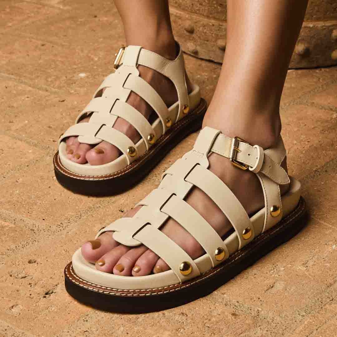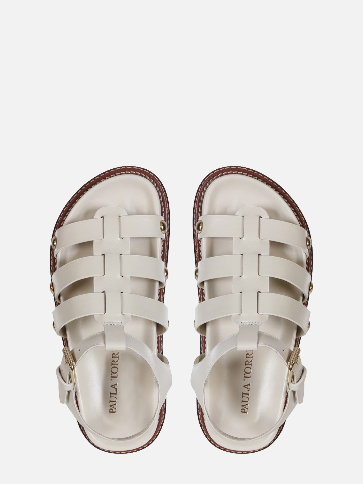 A Papete Gal é feita em couro de alta qualidade. O modelo apresenta bico arredondado e palmilha anatômica para conforto. Na parte superior, tiras largas se sobrepõem à tira central, finalizadas por rebites decorativos. O fechamento é realizado por fivela lateral. A vira em couro possui pesponto duplo contrastante, e solado também em couro, conferindo mais durabilidade a peça.