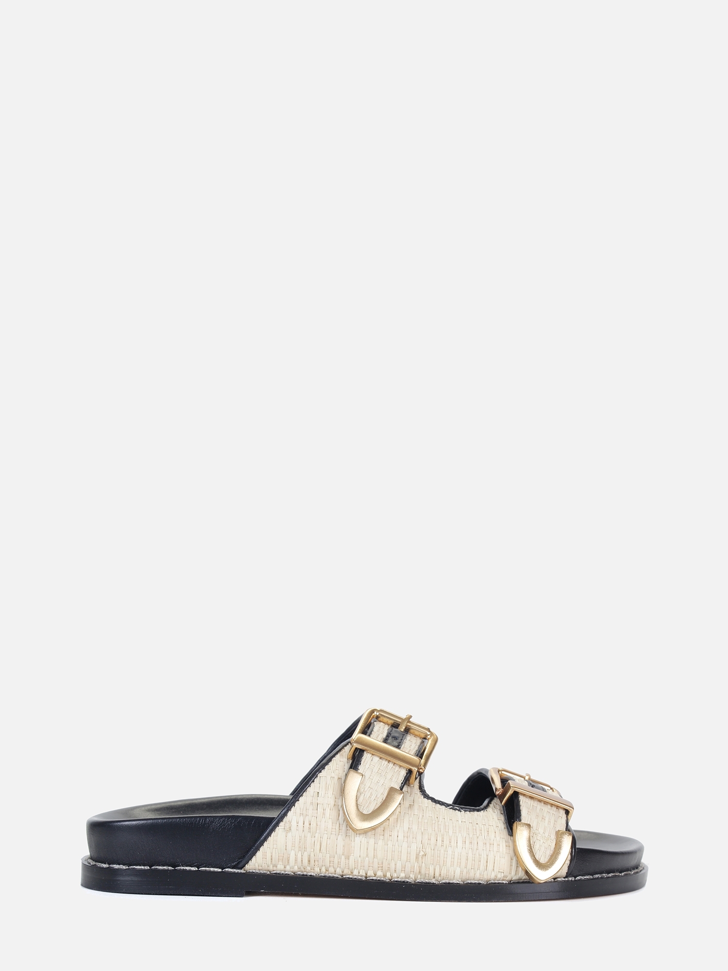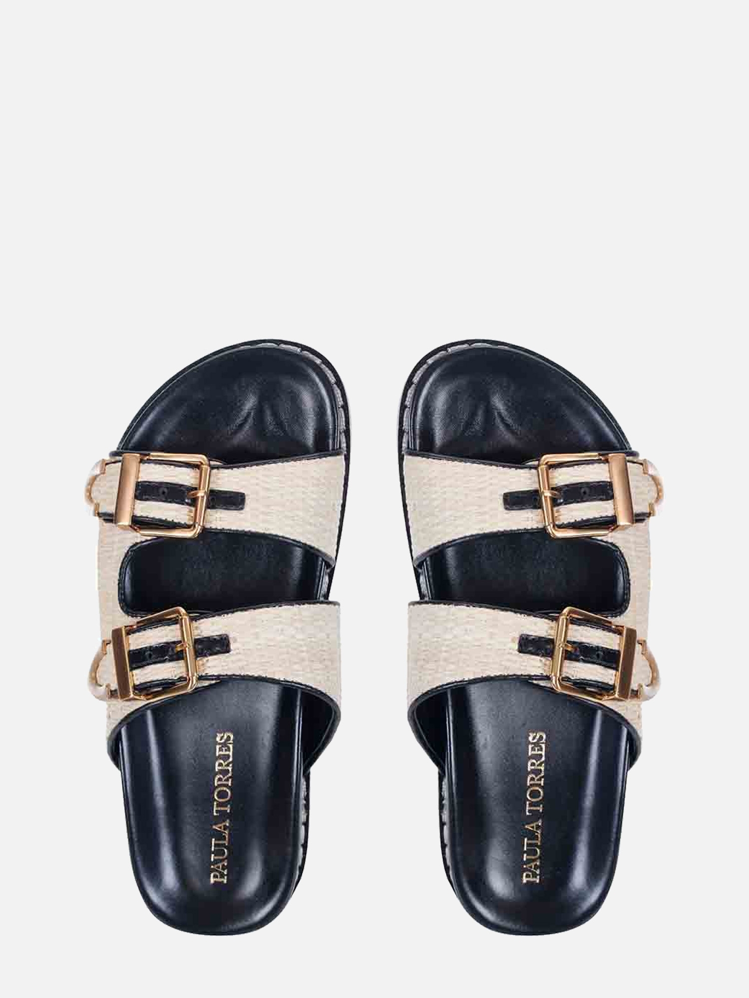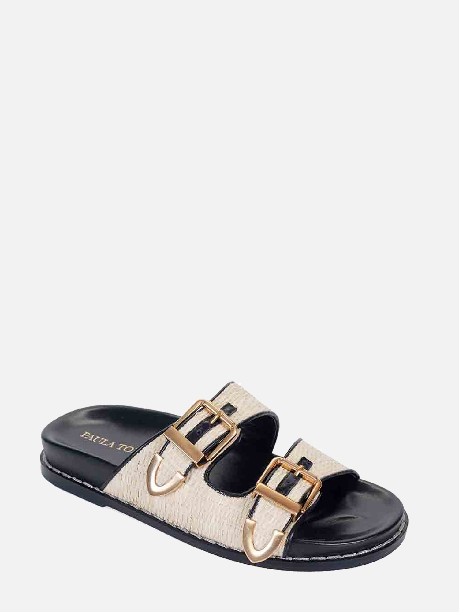 Em parceria com a marca de beachwear Água de Coco, apresentamos a papete Jeri. O modelo foi desenvolvido com palha natural produzida de forma artesanal no Ceará. Conta com duas tiras que se estendem pela lateral, equipadas com fivelas de banho dourado para ajuste sobre o pé. A palmilha anatômica é revestida em couro metalizado, trazendo um contraste elegante de materiais, e a vira possui pesponto contrastante, adicionando um toque de sofisticação ao design.