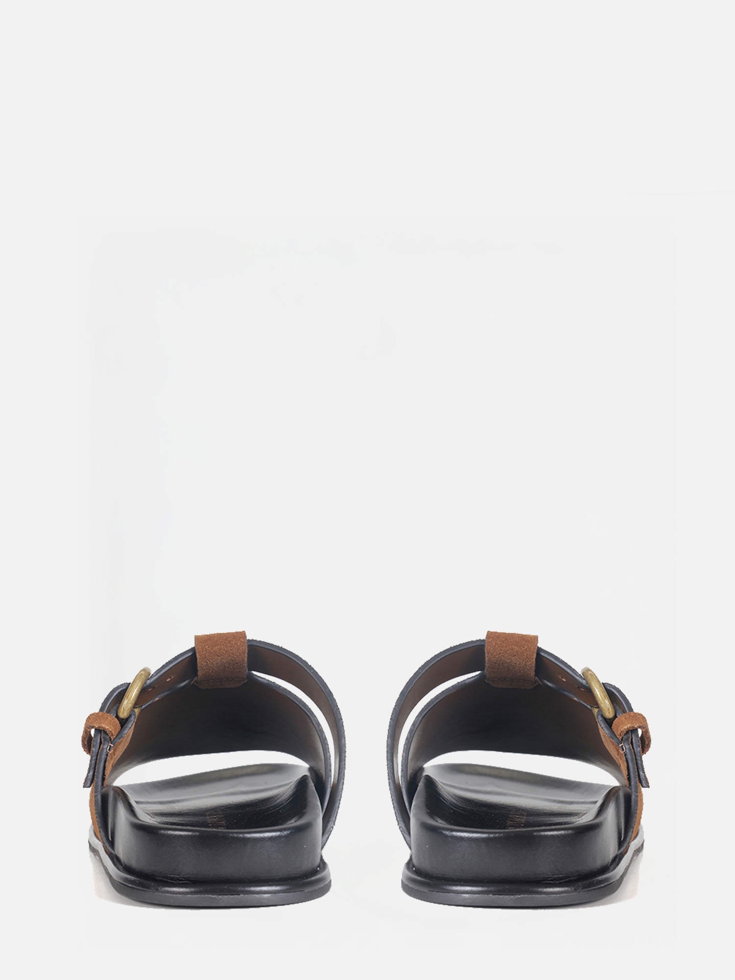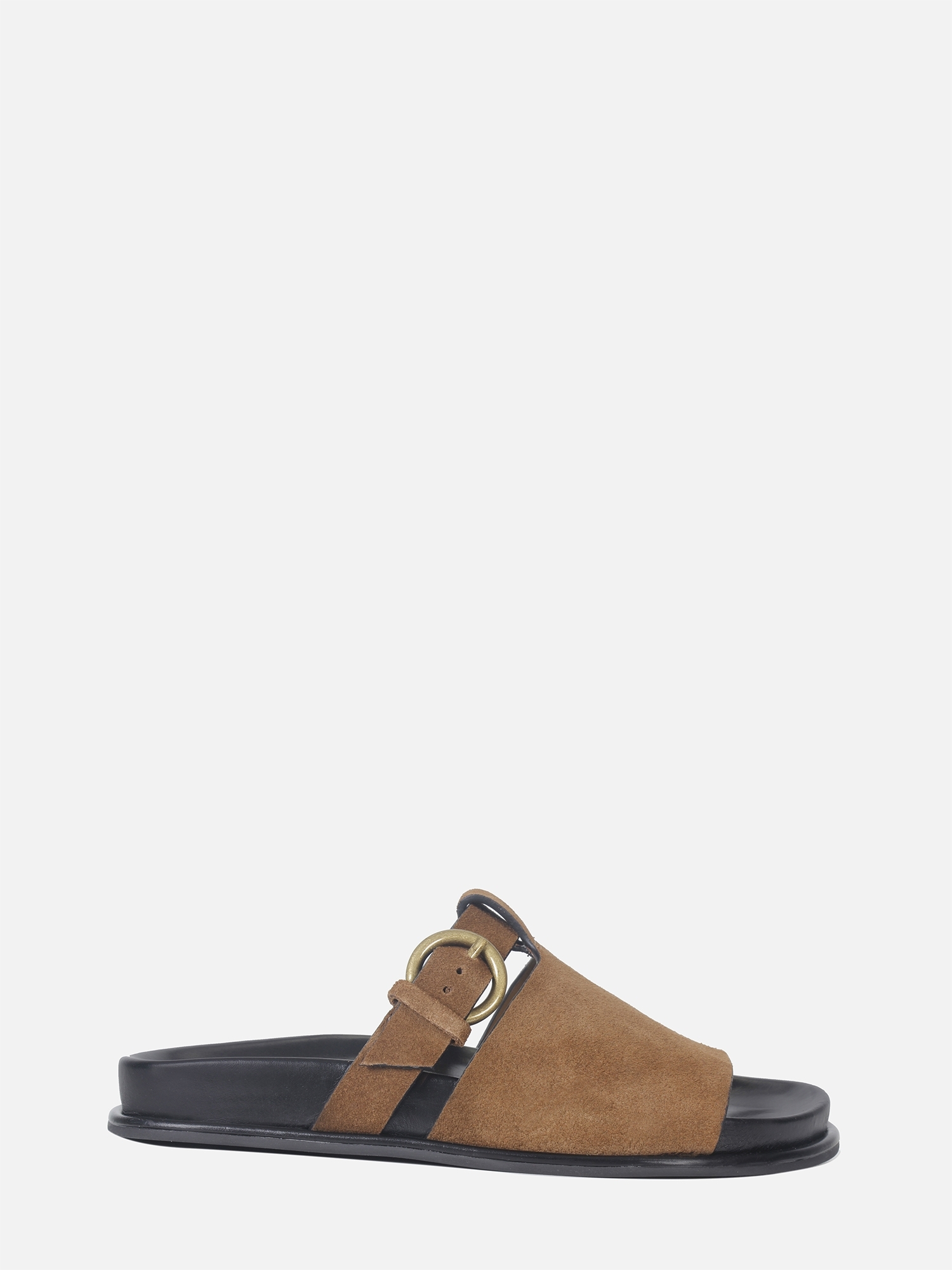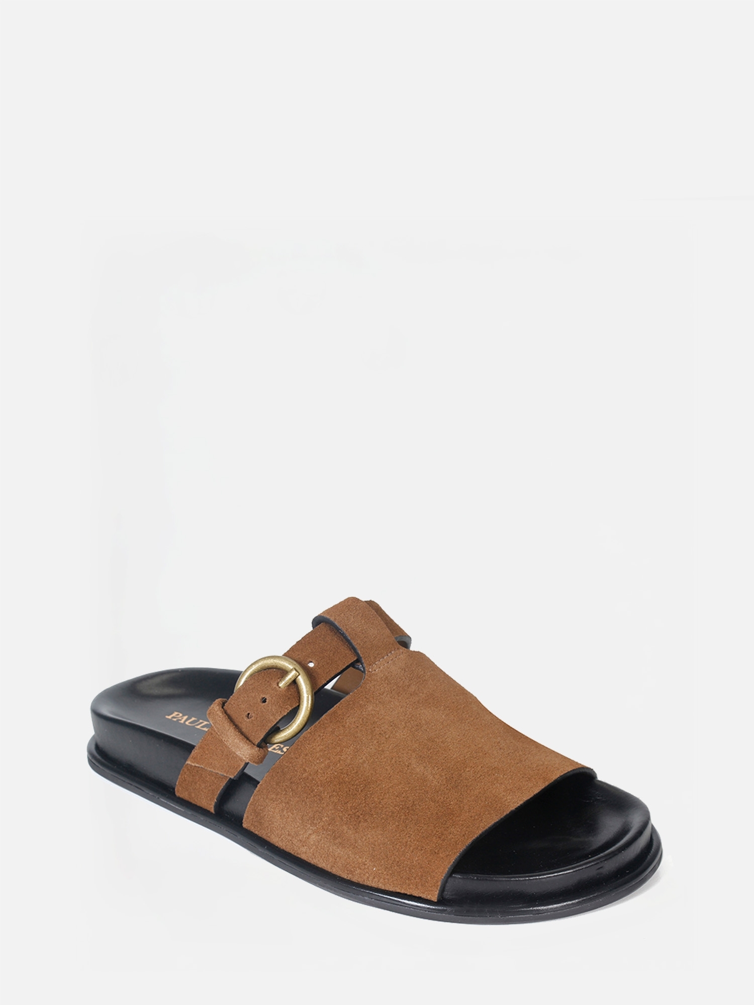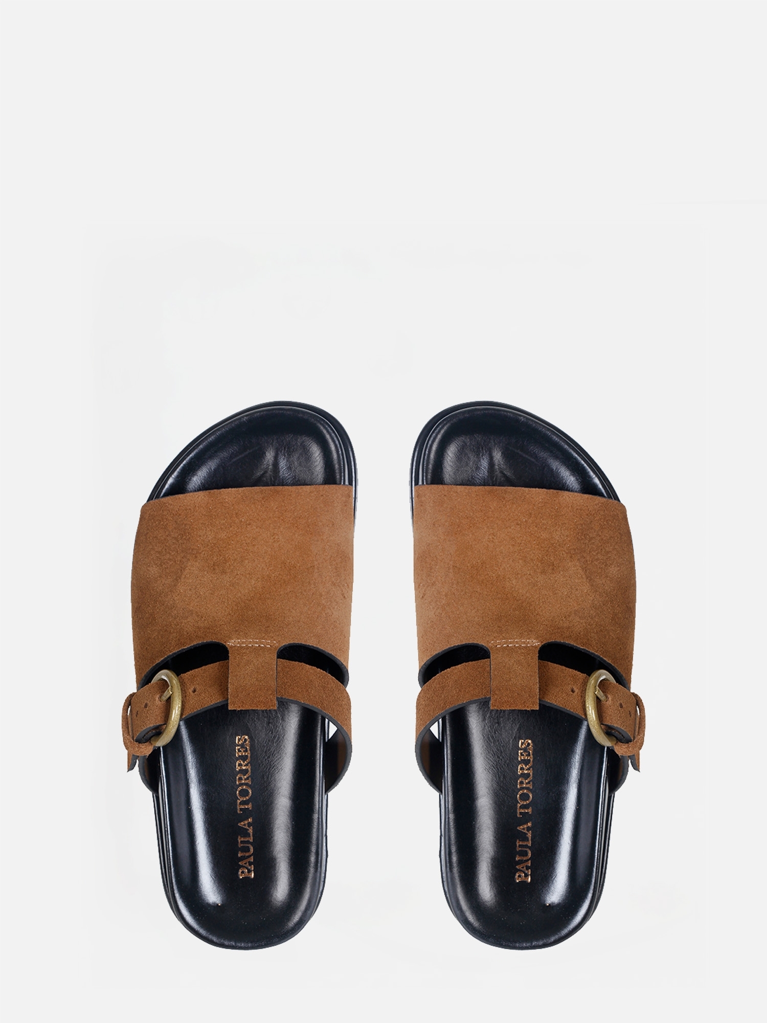 A Papete Lucy é confeccionada em camurça e couro, combinando sofisticação e conforto. O modelo conta com uma palmilha anatômica revestida em couro e um solado emborrachado, garantindo maior estabilidade e segurança ao caminhar. O cabedal apresenta duas tiras em camurça: uma tira mais larga com passante, para a tira mais fina, equipada com uma fivela ajustável.