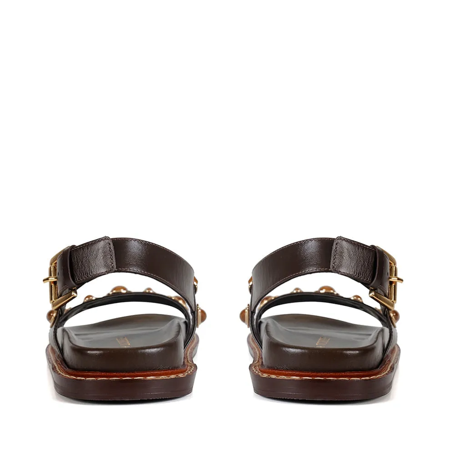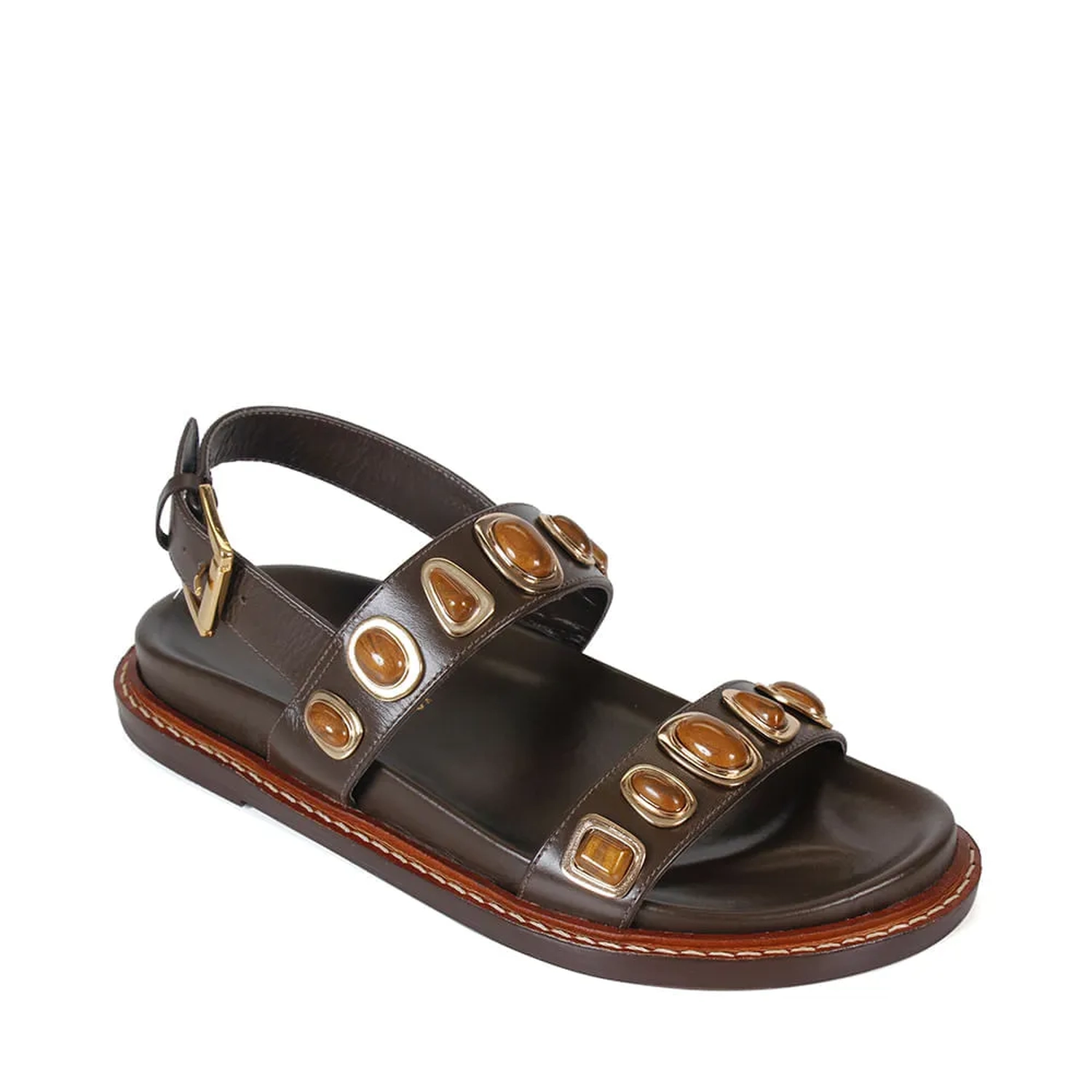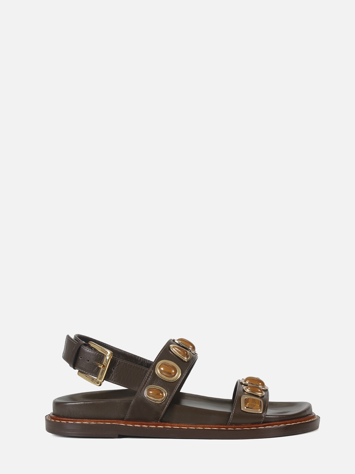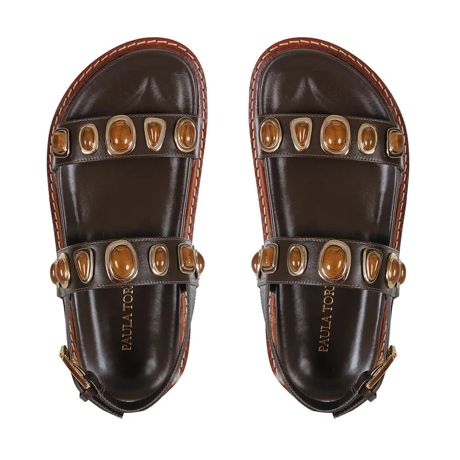A Papete Millena é produzida em couro. O modelo apresenta bico arredondado e palmilha anatômica para conforto. Duas tiras largas com a aplicação de pedras resinadas em formatos orgânicos sobre metais com banho dourado. Fechamento por tira no calcanhar com fivela lateral para ajuste. Vira em couro com pesponto contrastante e solado também em couro proporcionando durabilidade e sofisticação ao sapato.