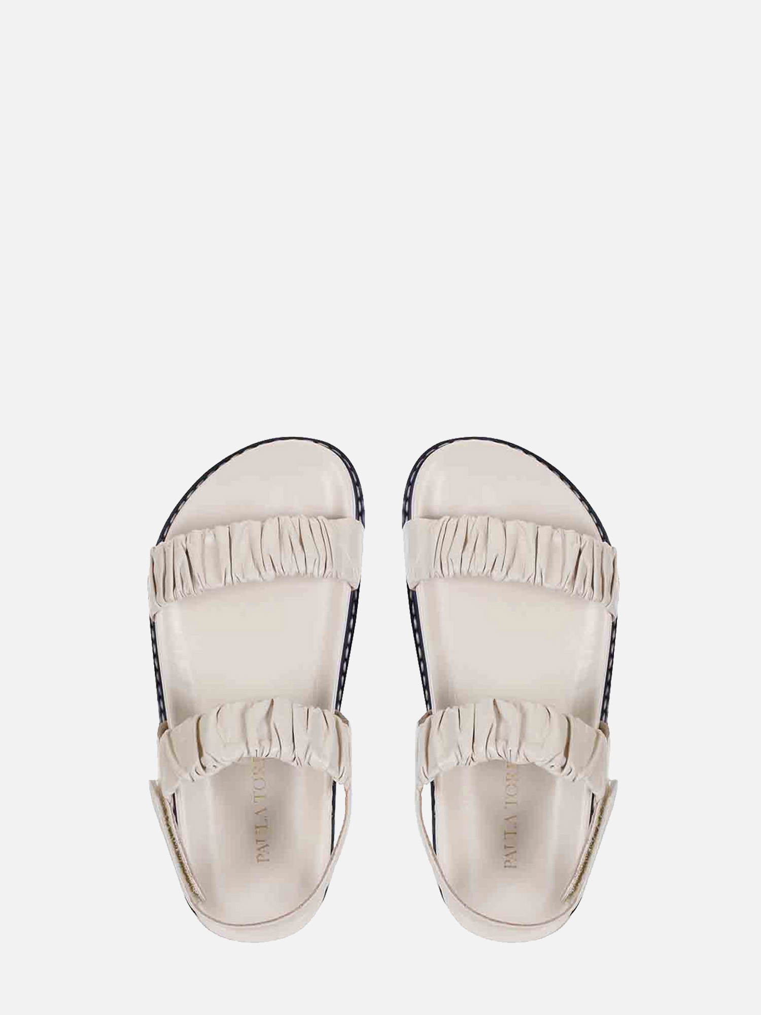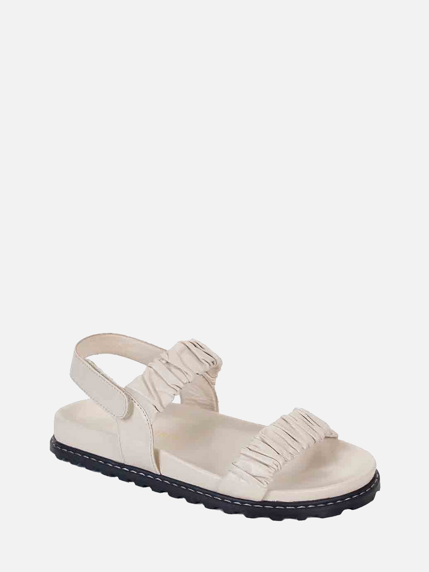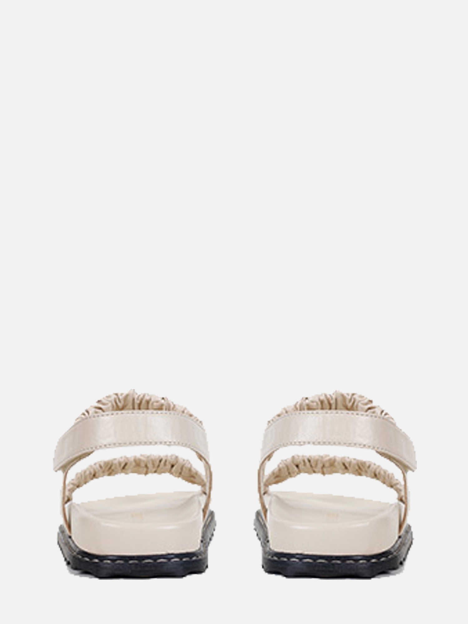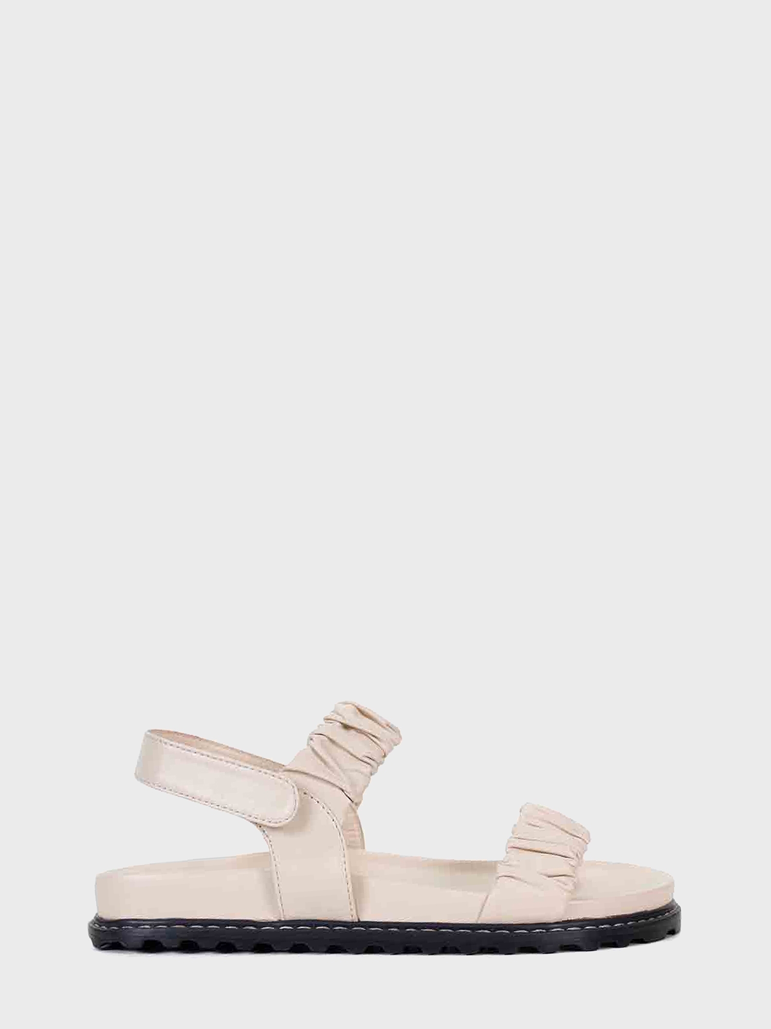 A Papete Serena é produzida em couro. A peça tem duas tiras largas na parte de cima com couro franzido. Fechamento por velcro na tira traseira. Palmilha anatômica com vira pespontada e solado tratorado em borracha.