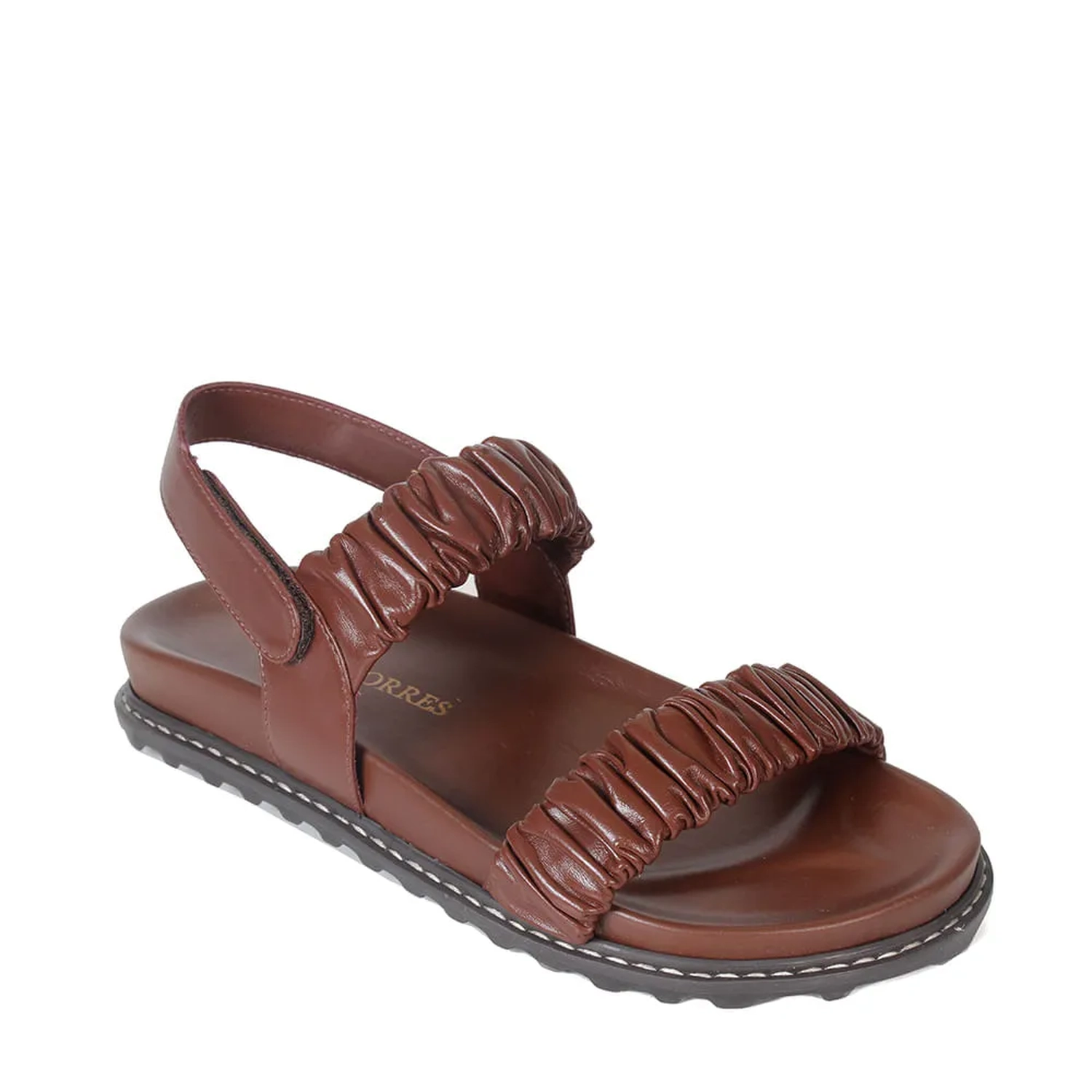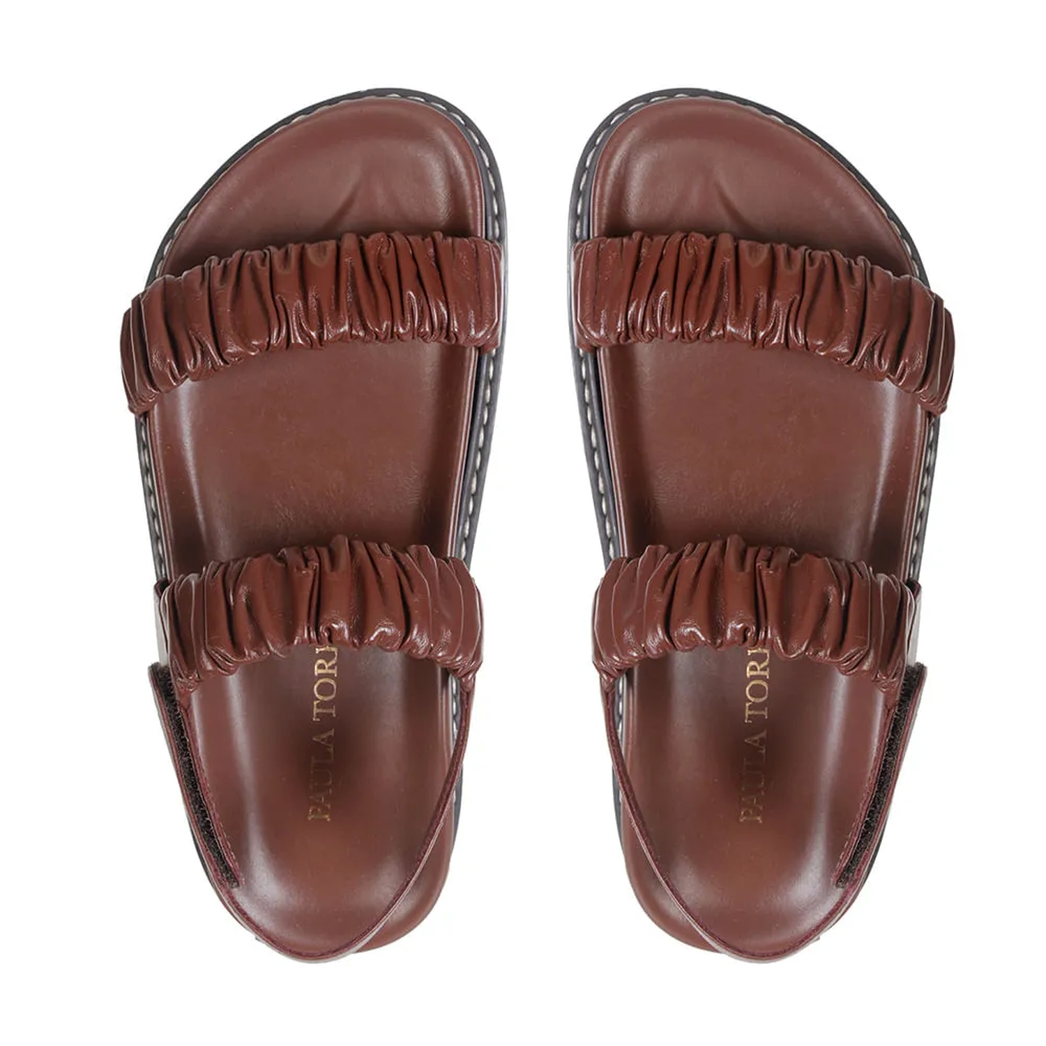 A Rasteira Serena é produzida em couro. A peça tem duas tiras largas na parte de cima com couro franzido. Fechamento por velcro na tira traseira. Palmilha anatômica com vira pespontada e solado tratorado em borracha.