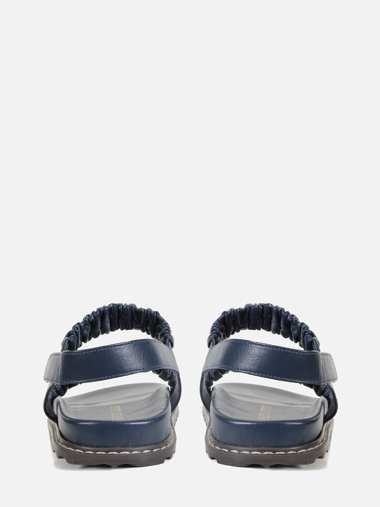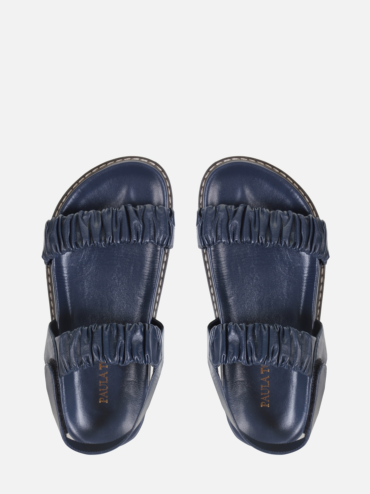 A Papete Serena é produzida em couro azul marinho de alta qualidade, com tiras largas em couro franzido que atualizam o modelo com uma estética contemporânea. O estilo papete garante conforto e praticidade, enquanto o fechamento em velcro no calcanhar facilita o ajuste. A palmilha anatômica proporciona suporte extra para o pé, e o solado tratorado emborrachado garante estabilidade com leveza e flexibilidade.