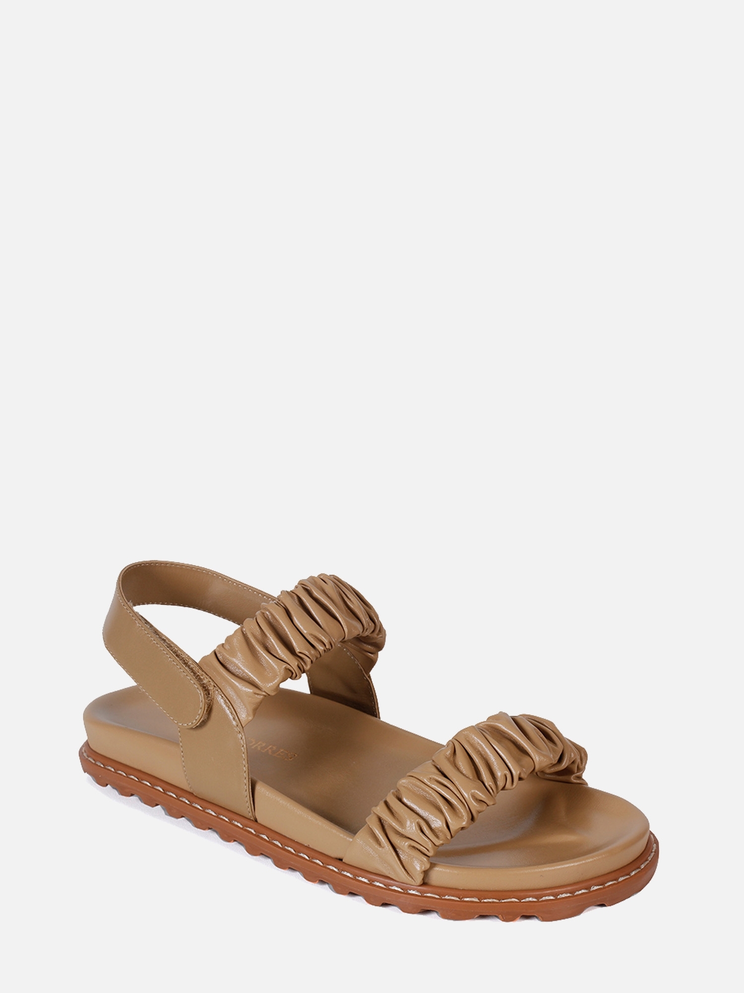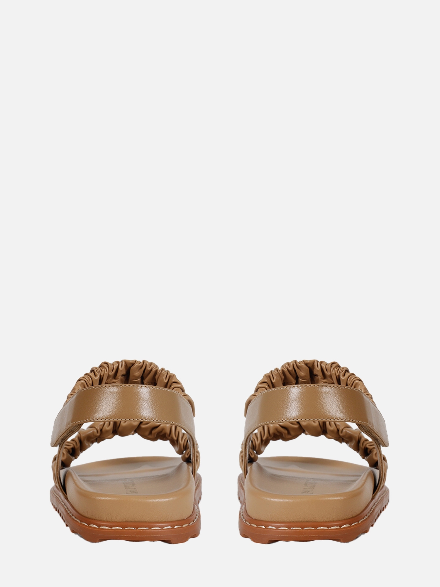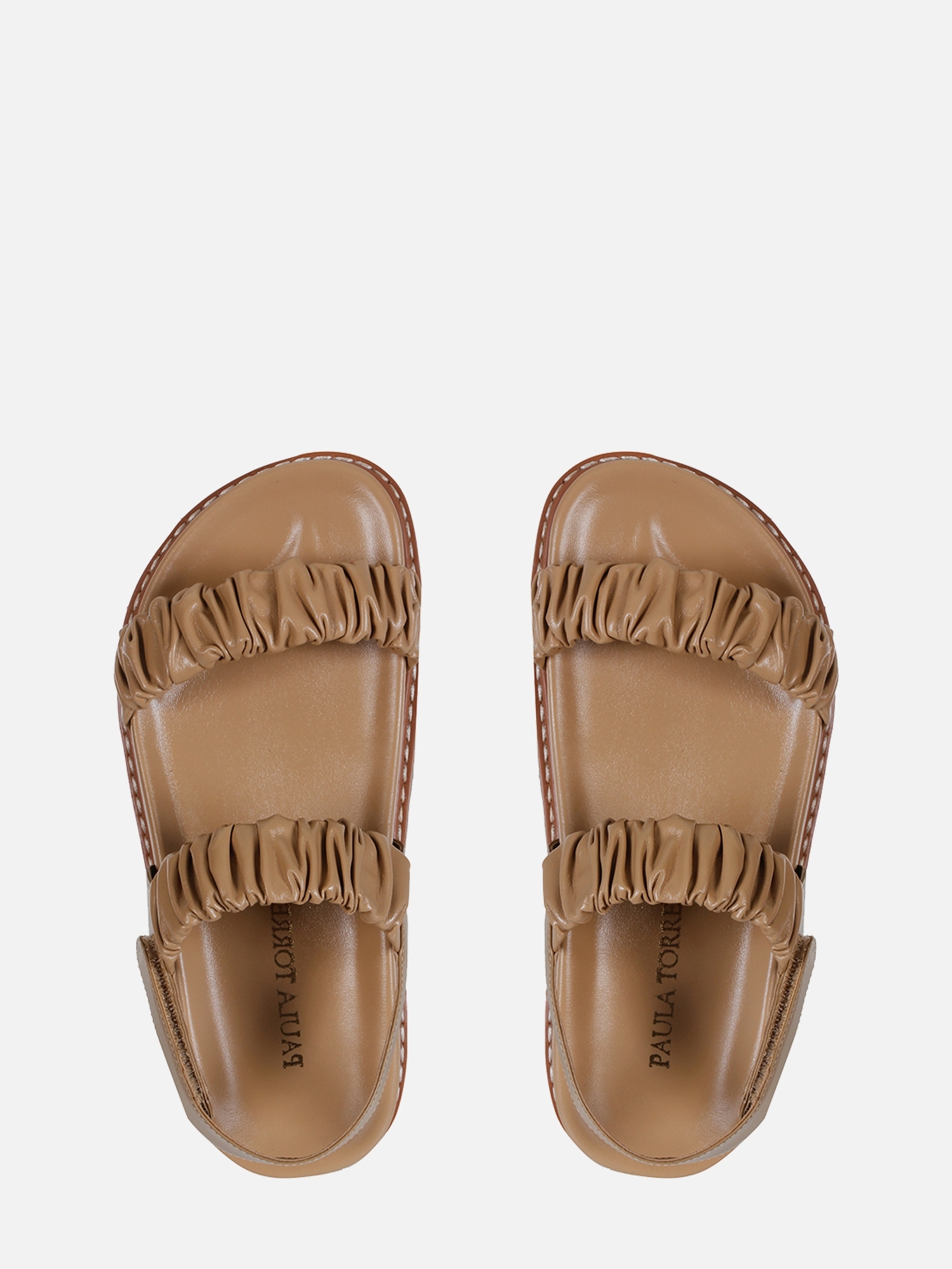 A Papete Serena é produzida em couro. A peça tem duas tiras largas na parte de cima com couro franzido. Fechamento por velcro na tira traseira. Palmilha anatômica com vira pespontada e solado tratorado em borracha.