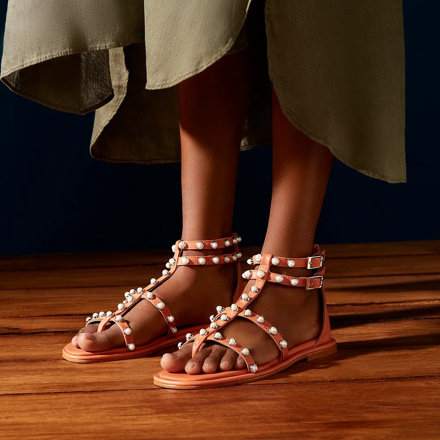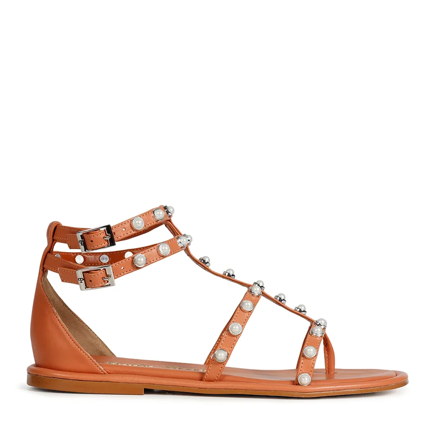 A Rasteira Alexa é confeccionada em couro. Modelagem estilo gladiadora com bico redondo. As aplicações de pérolas sobre as tiras revestidas em couro realçam a feminilidade e trazem um conceito novo. O fechamento lateral é realizado por duas fivelas. Aposte nesse modelo para tornar seus looks inesquecíveis!