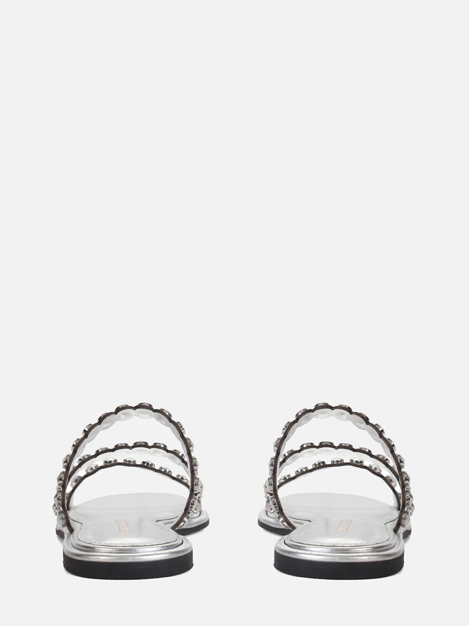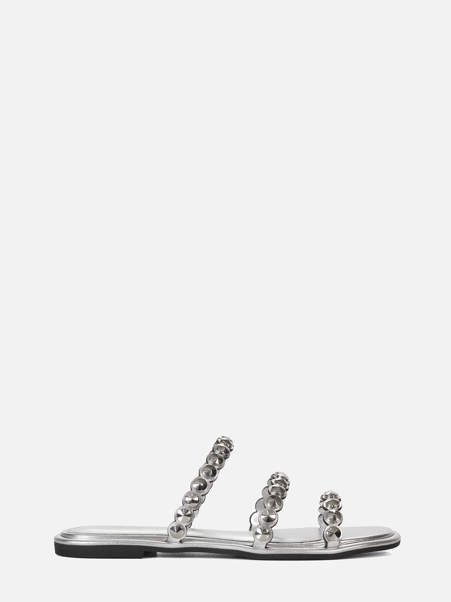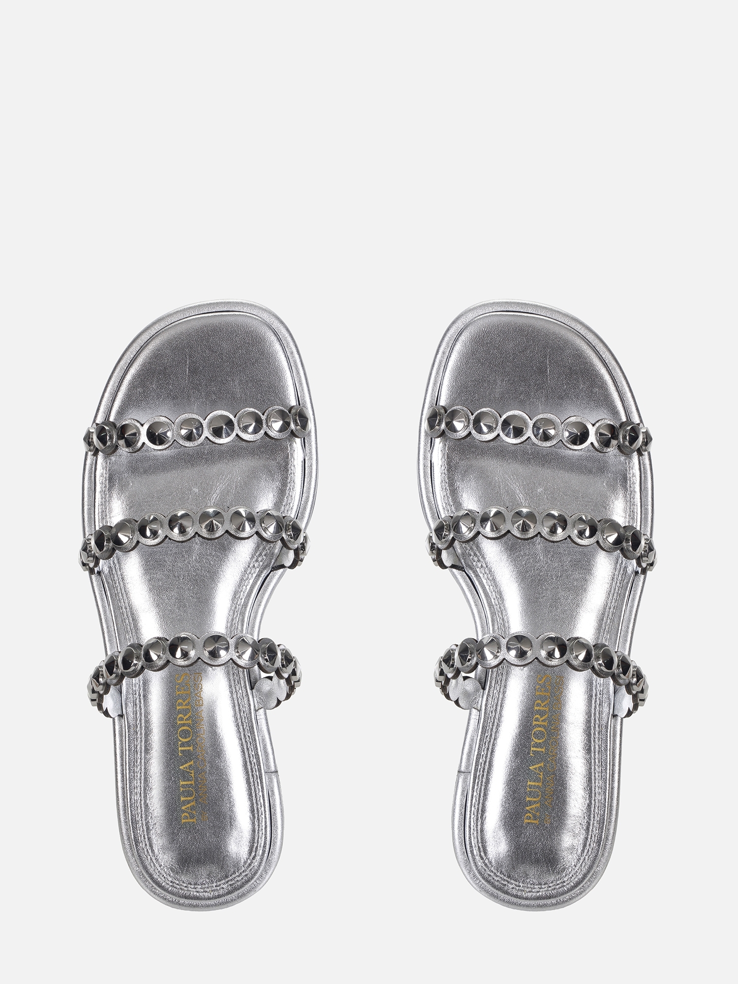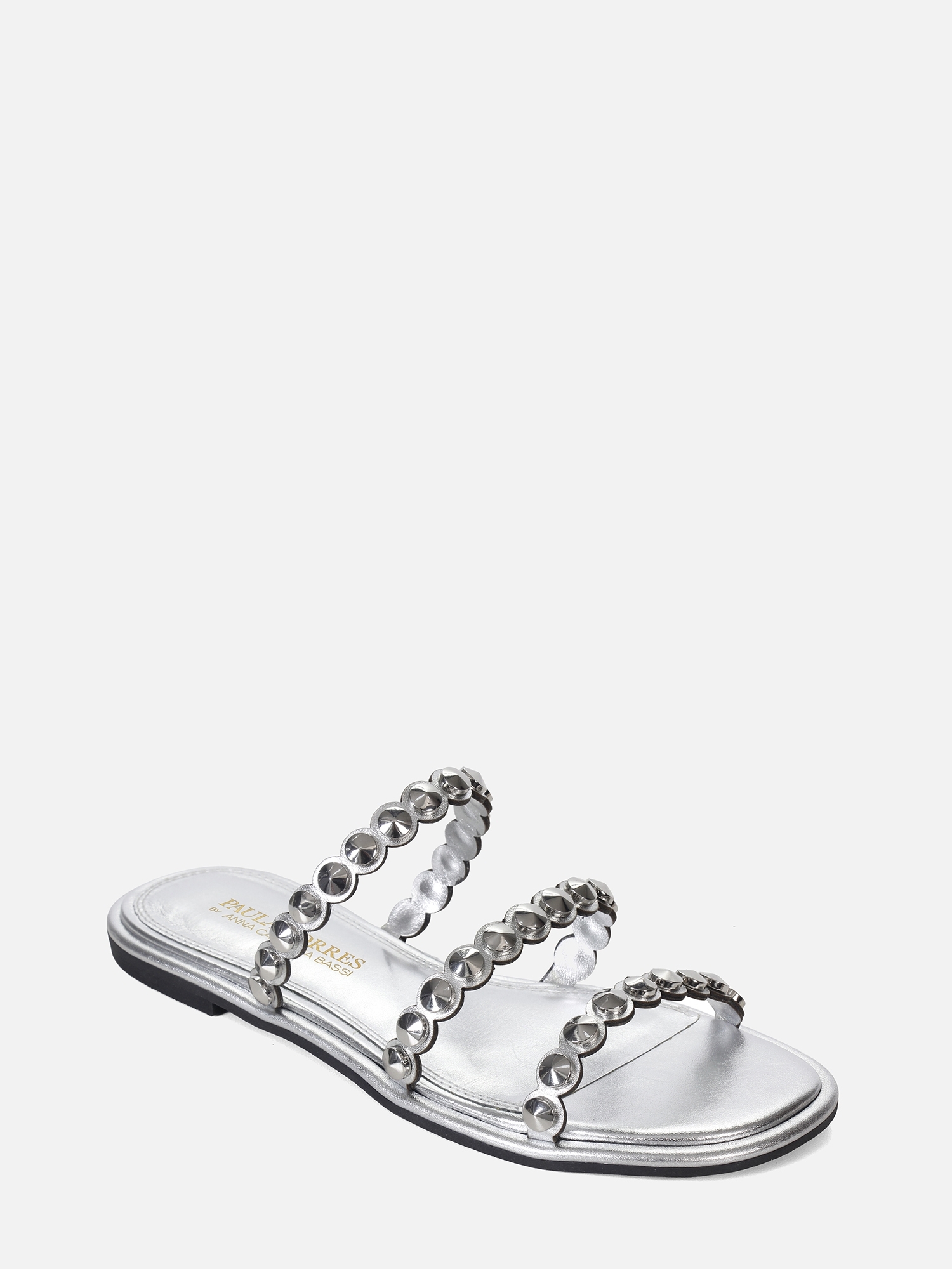 A Rasteira Anna Prata destaca-se pelo seu visual delicado e sofisticado. O design conta com três tiras finas posicionadas sobre o peito do pé, cada uma decorada com minibotões Georgia em prata, que acrescentam um brilho sutil e um toque de personalidade ao modelo, confeccionado em couro metalizado.