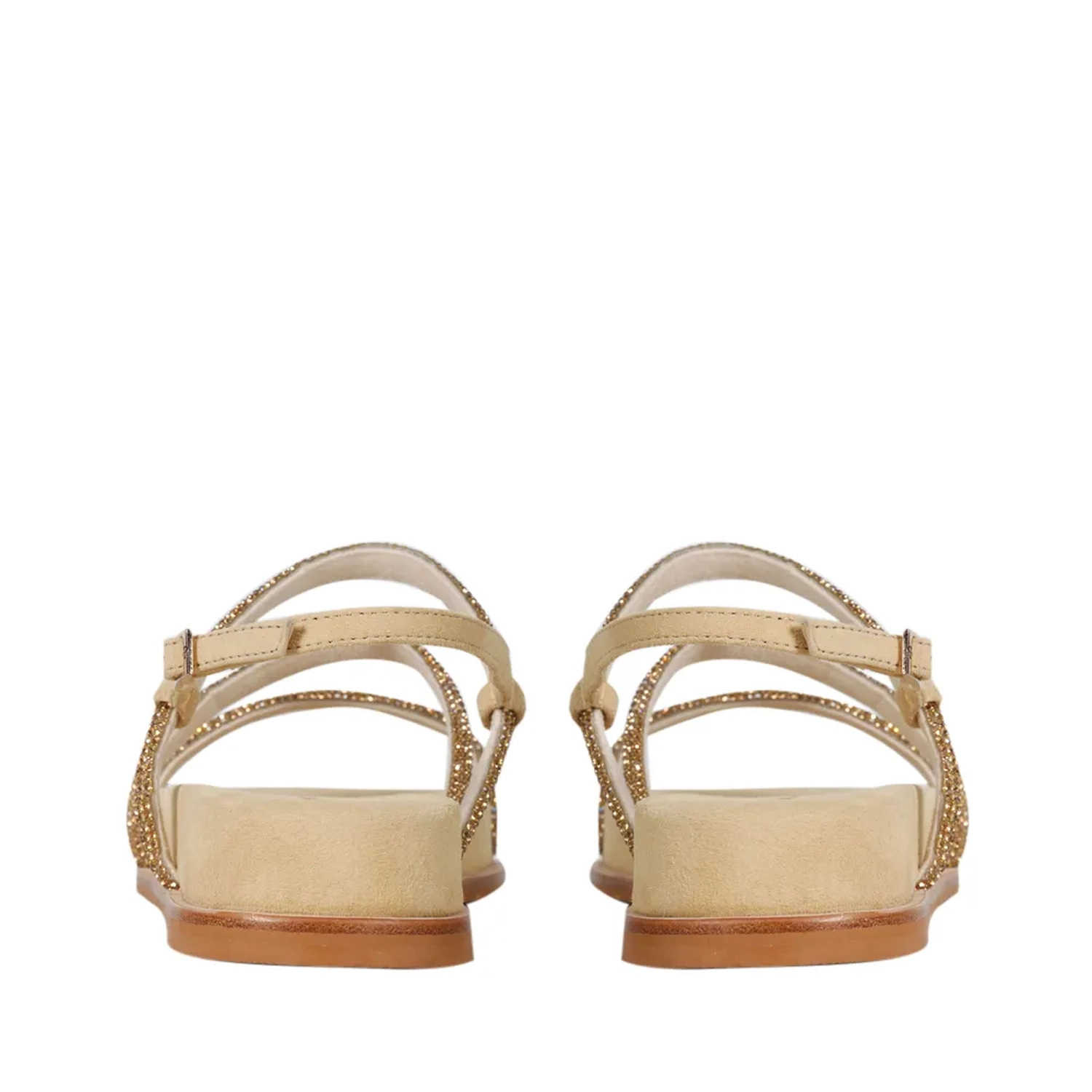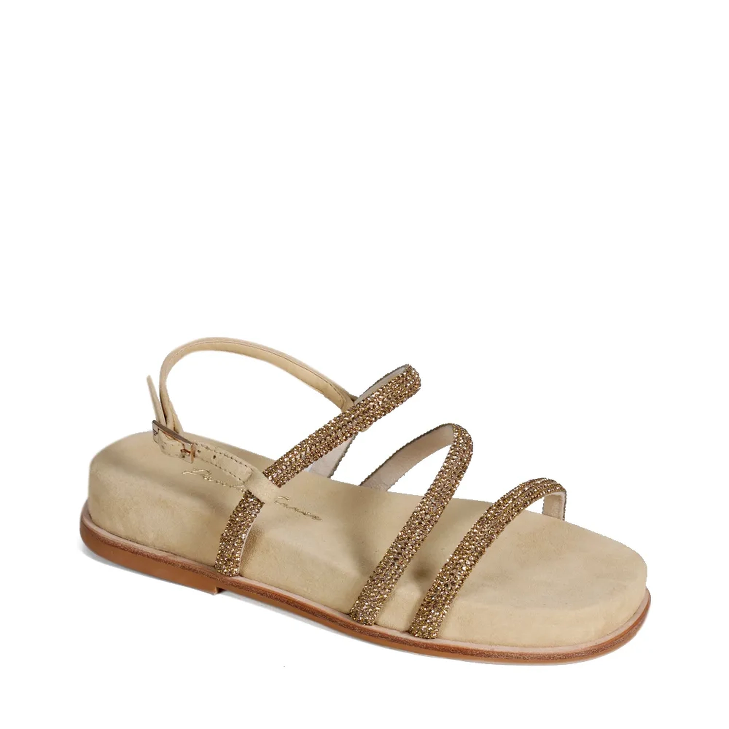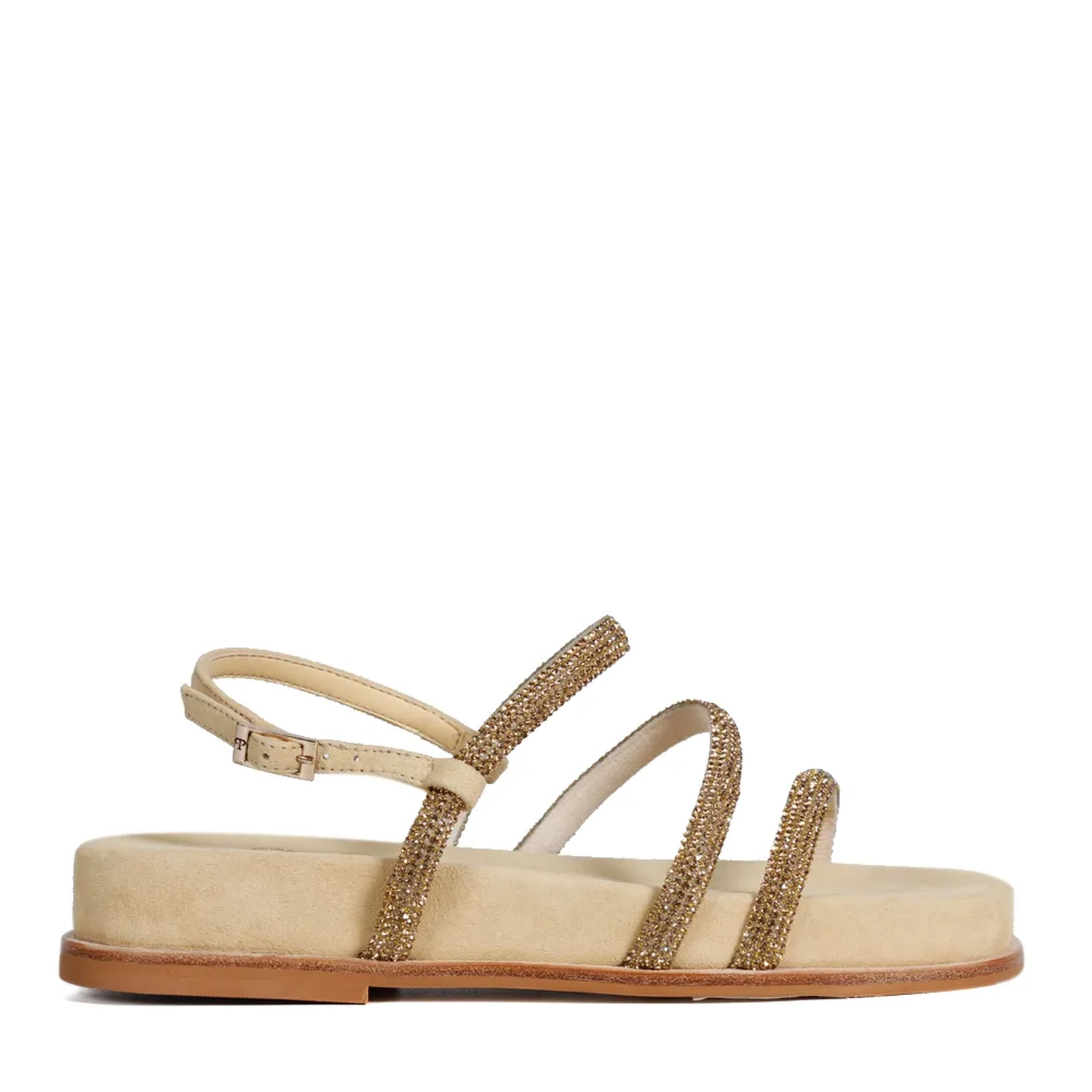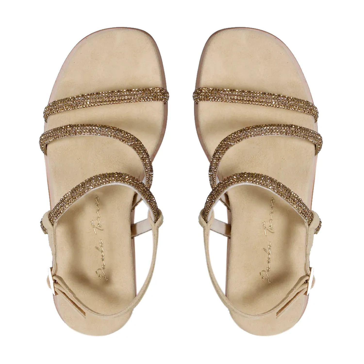 A Rasteira Annie é confeccionada em camurça. Modelagem em bico quadrado e de fácil calce. O diferencial deste modelo são as três tiras acolchoadas com cristais embutidos. Fechamento lateral por fivela. As texturas da camurça e dos critais criam um aspecto único Paula Torres, tornando o modelo confortável e sofisticado. Qualidade única Paula Torres, com muito glamor e praticidade.