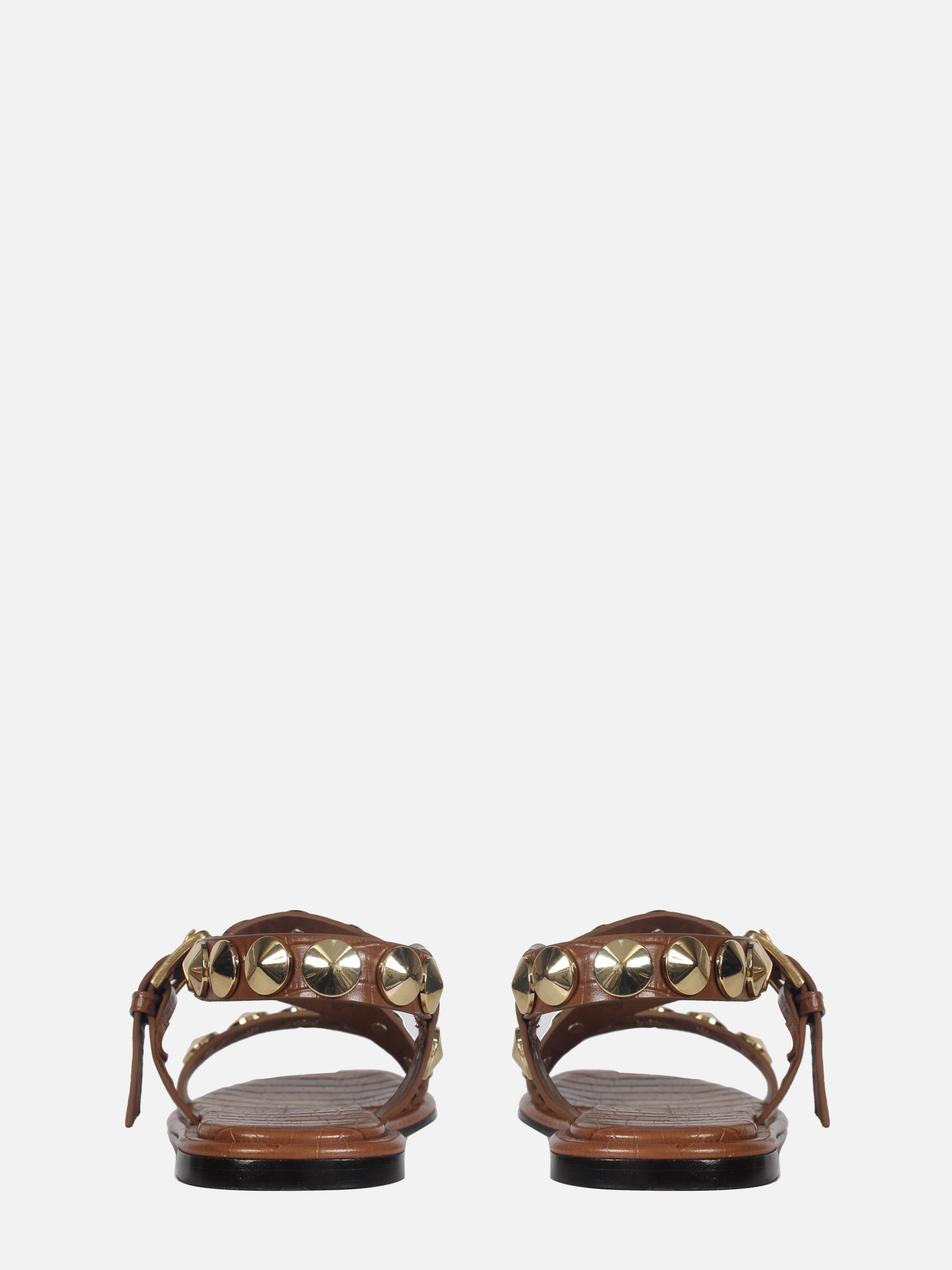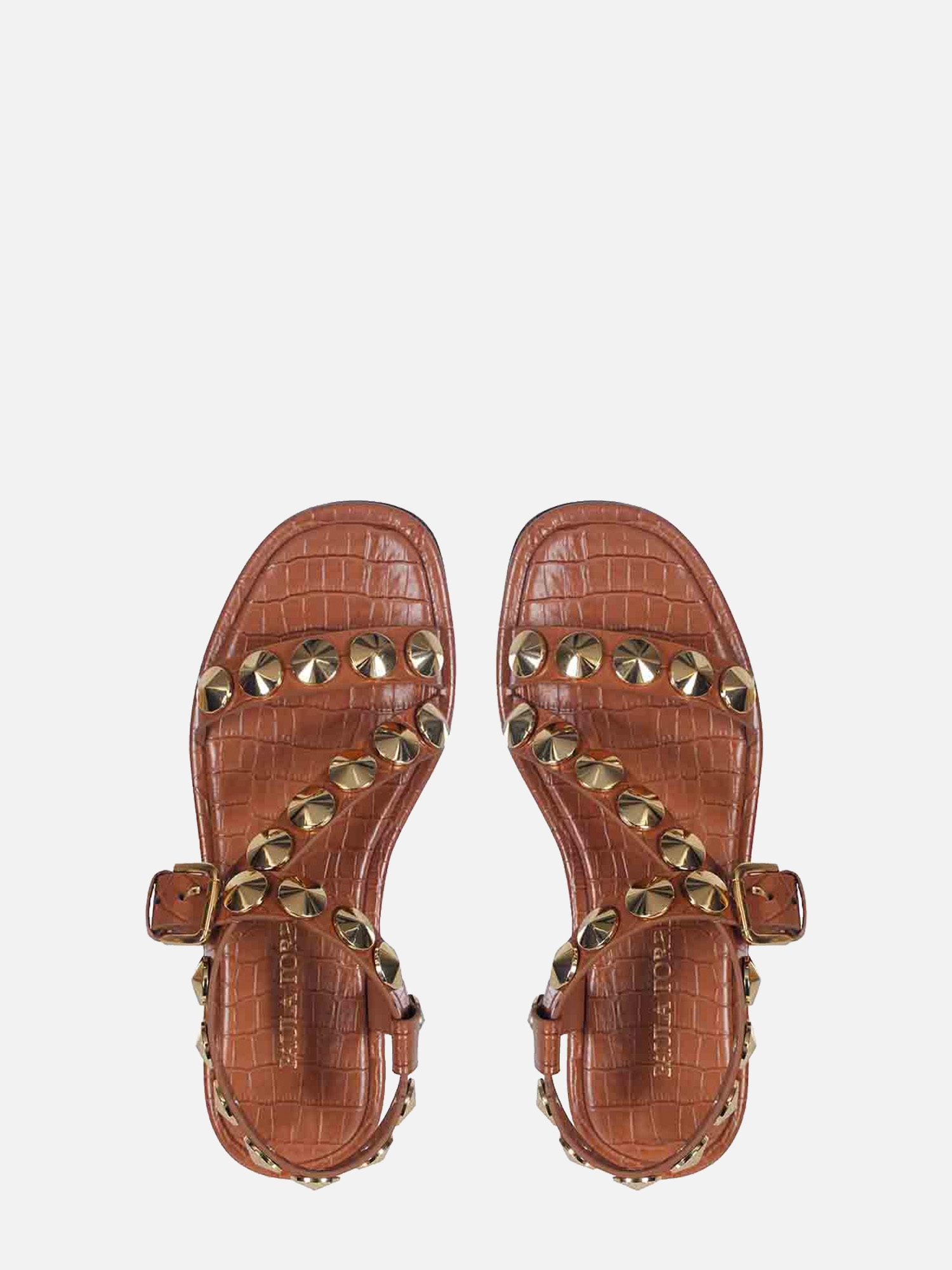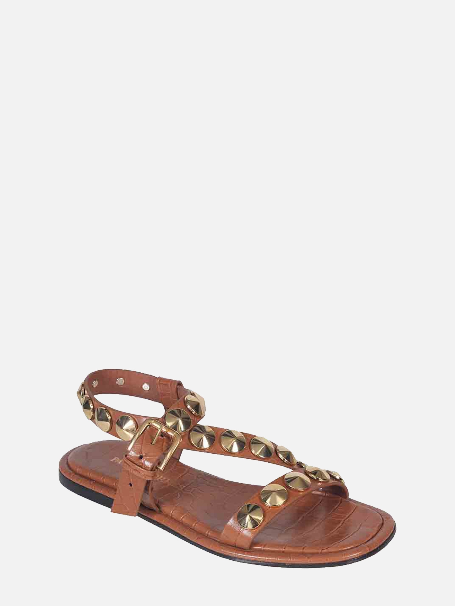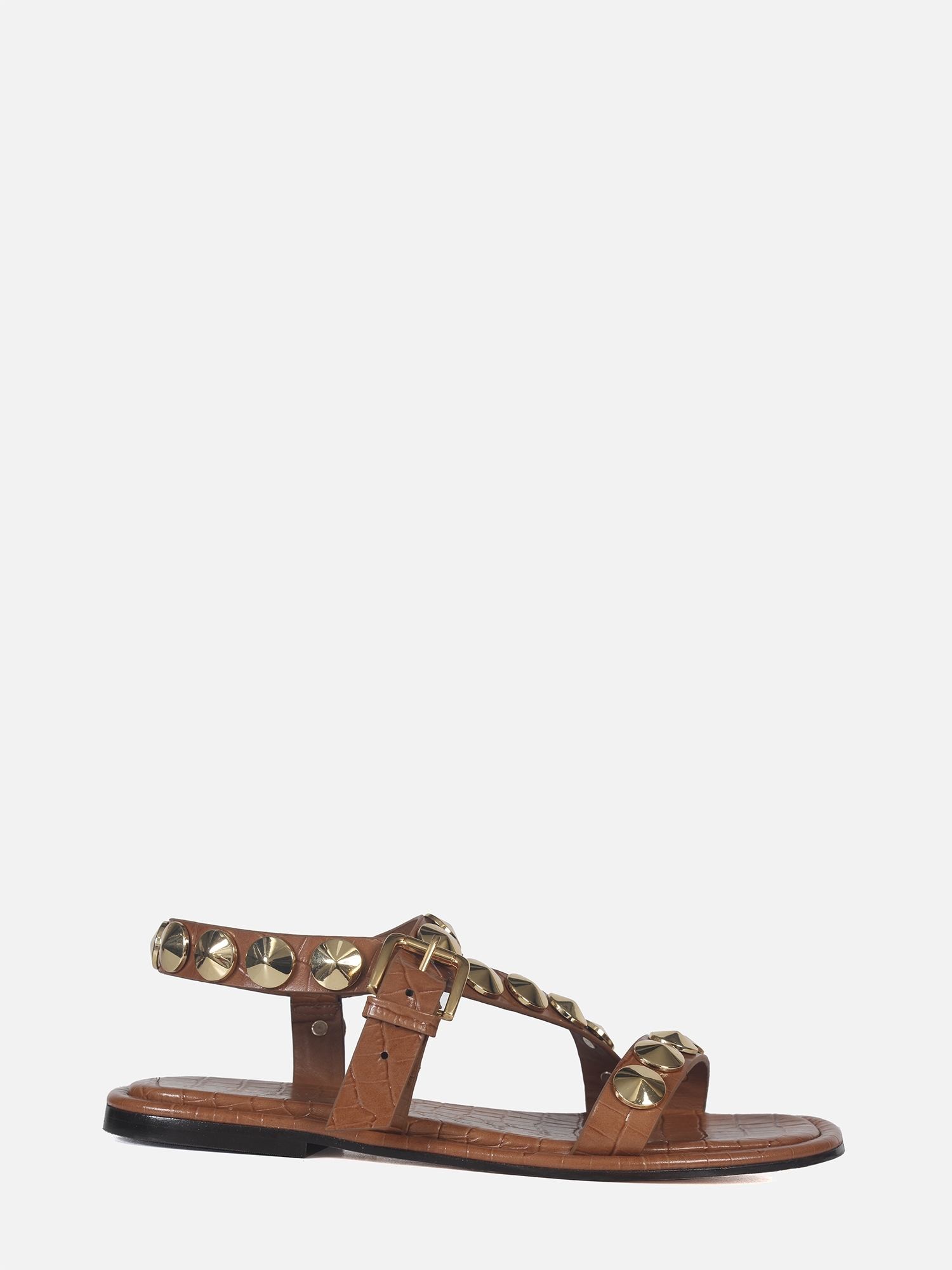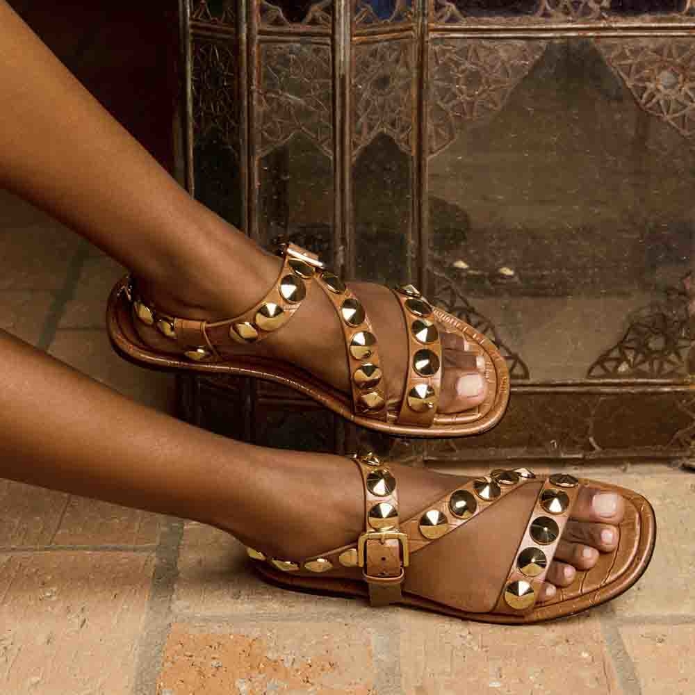 A Rasteira Antônia é produzida em couro com estampa croco. Este calçado apresenta tiras largas que se posicionam sobre o peito do pé, adornadas com botões Georgia em banho dourado. O fechamento é realizado por uma fivela, com uma tira que envolve o calcanhar e se finalizada na lateral. A vira é forrada com o mesmo couro utilizado no cabedal, enquanto o solado também é confeccionado em couro, garantindo conforto e sofisticação ao modelo.