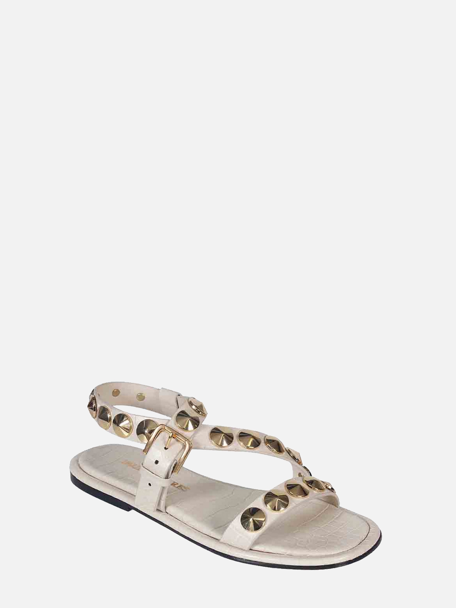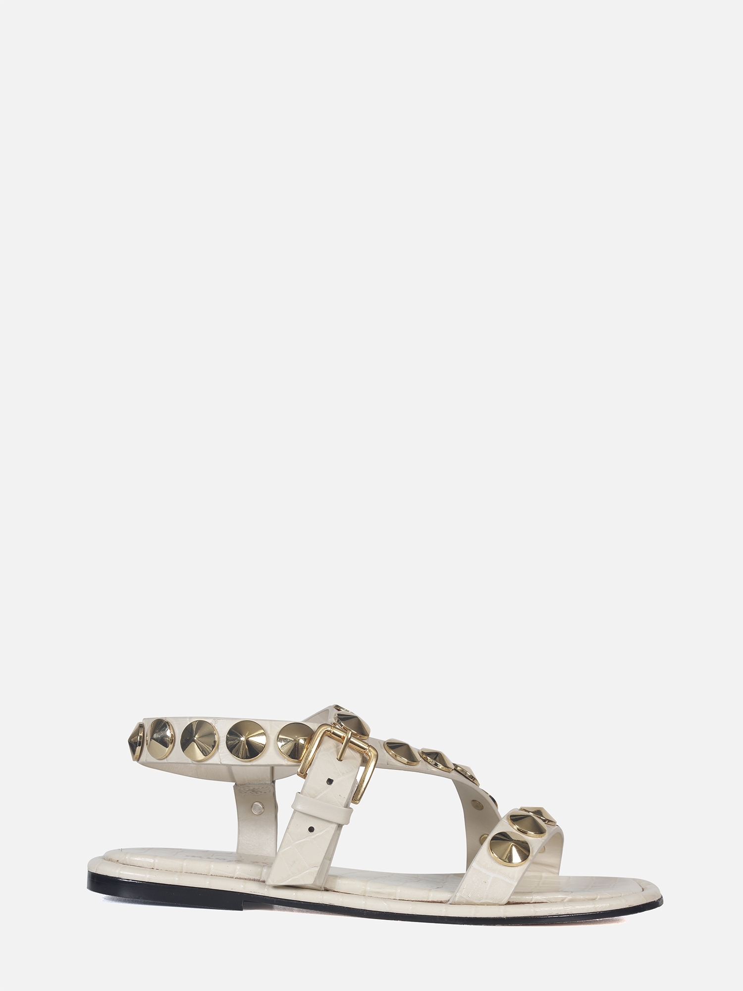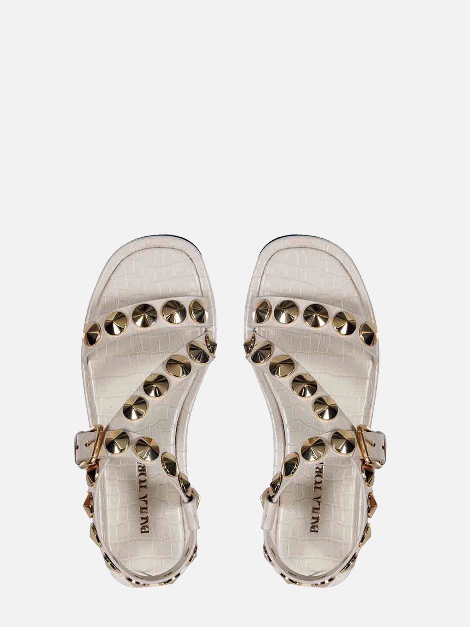 A Rasteira Antônia é produzida em couro com estampa croco. Este calçado apresenta tiras largas que se posicionam sobre o peito do pé, adornadas com botões Georgia em banho dourado. O fechamento é realizado por uma fivela, com uma tira que envolve o calcanhar e se finalizada na lateral. A vira é forrada com o mesmo couro utilizado no cabedal, enquanto o solado também é confeccionado em couro, garantindo conforto e sofisticação ao modelo.