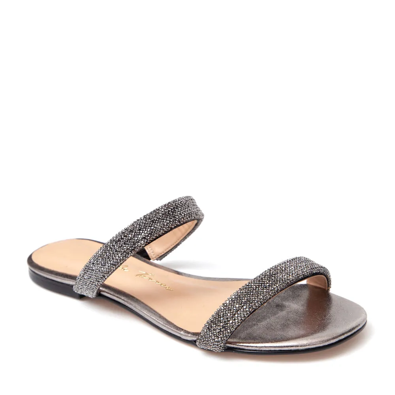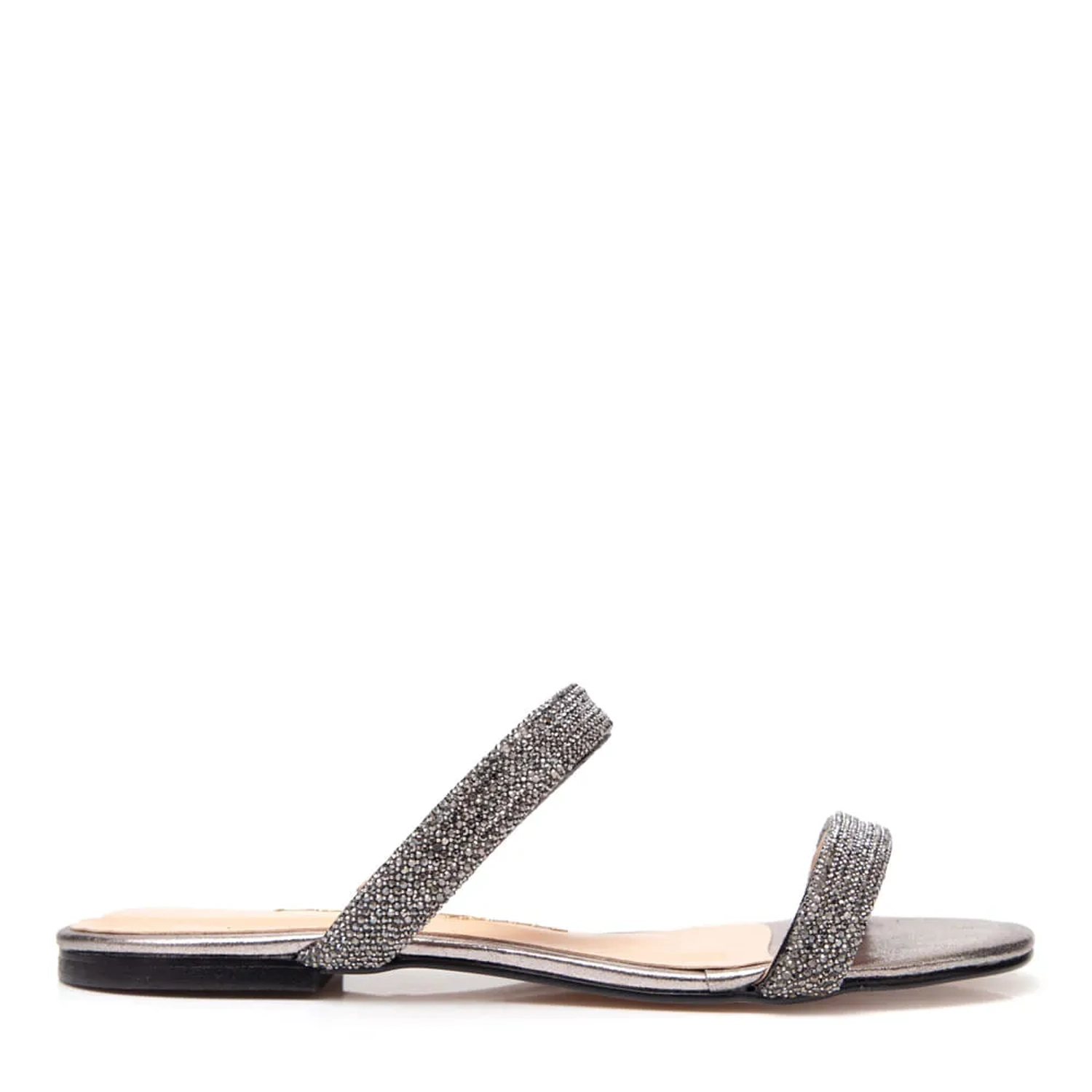 A Rasteira Arya é produzida com couro metalizado. O modelo possui duas tiras largas acolchoadas com aplicação de cristais. Bico arredondado e salto flat oferecendo um blend do sofisticado e confortável;