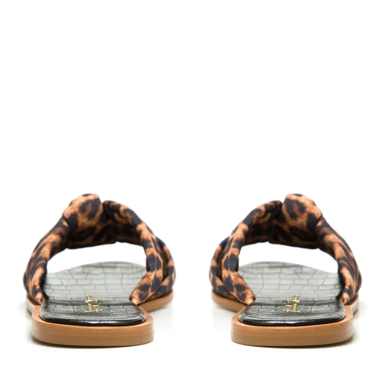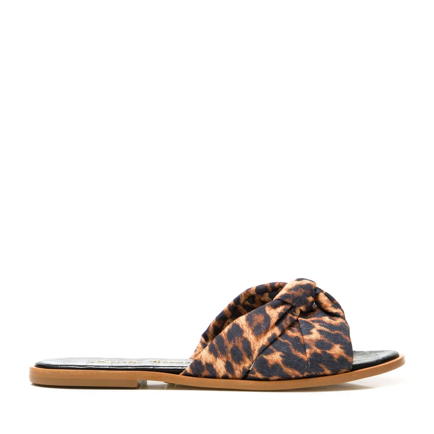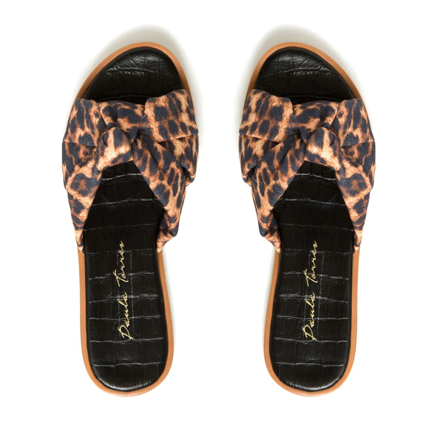 A rasteira Barcelona é produzida em tecido com estampa animal. Modelagem flat e cabedal de tiras largas com detalhe em nó e bico arredondado. É a junção perfeita entre o moderno e todo conforto presente no DNA Paula Torres.