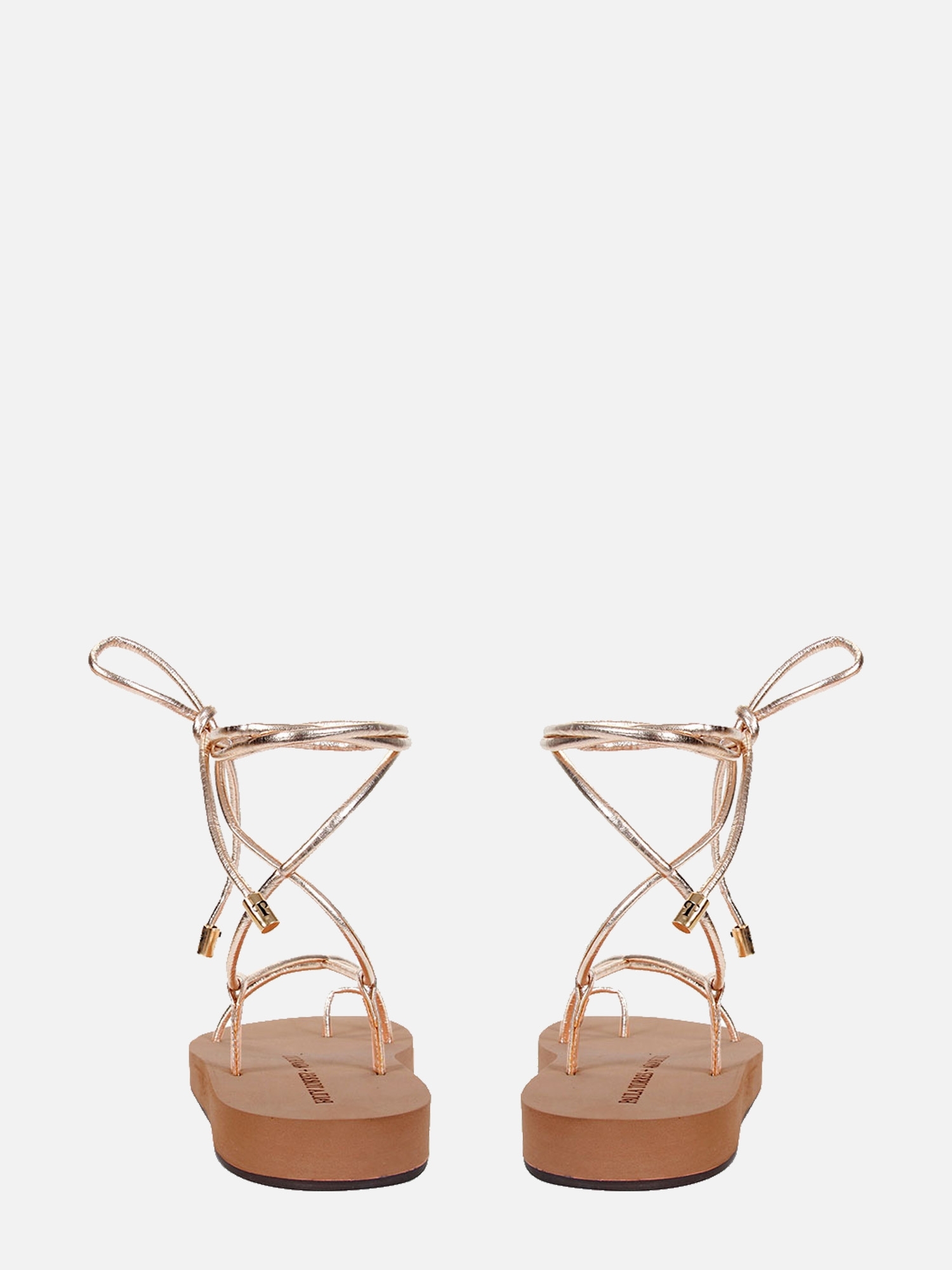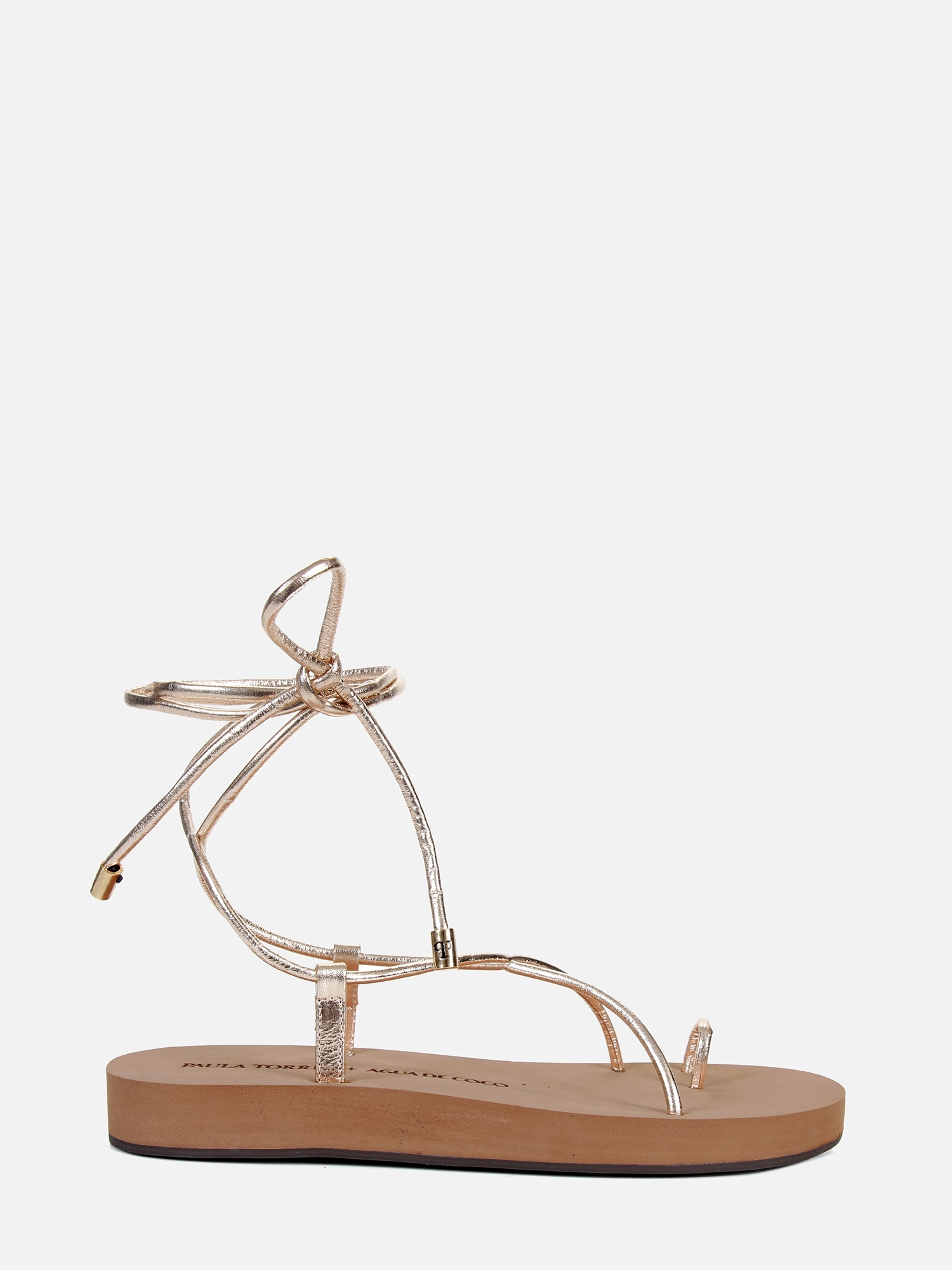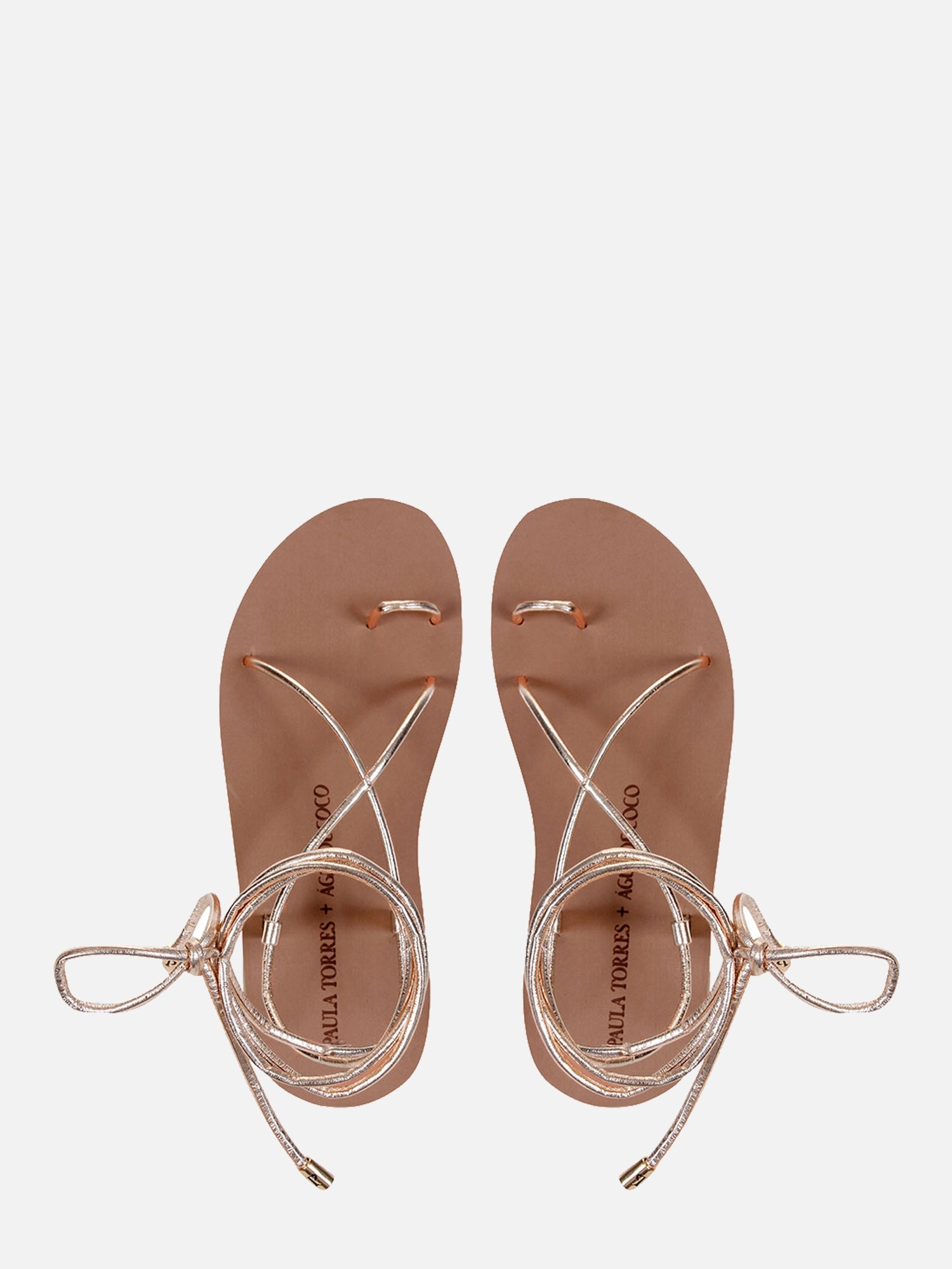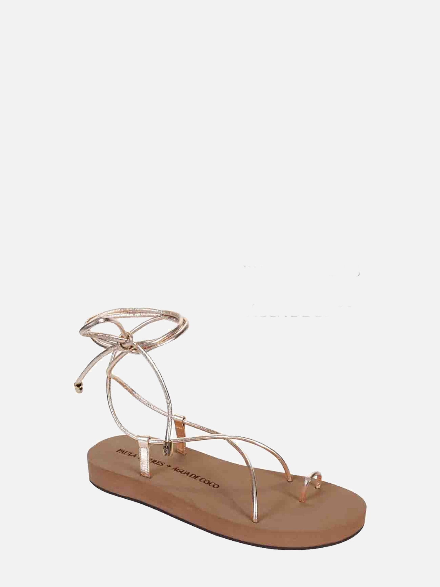 Em parceria com a marca de beachwear Água de Coco apresentamos a Rasteira Canoa. O modelo foi desenvolvido com tiras finas de couro metalizado, uma envolvendo o dedão e outras duas que se cruzam sobre o peito do pé, terminando em uma delicada amarração no tornozelo. A palmilha é feita de EVA extremamente macio e flexível, garantindo conforto durante o uso, enquanto o solado de borracha proporciona maior estabilidade e durabilidade.