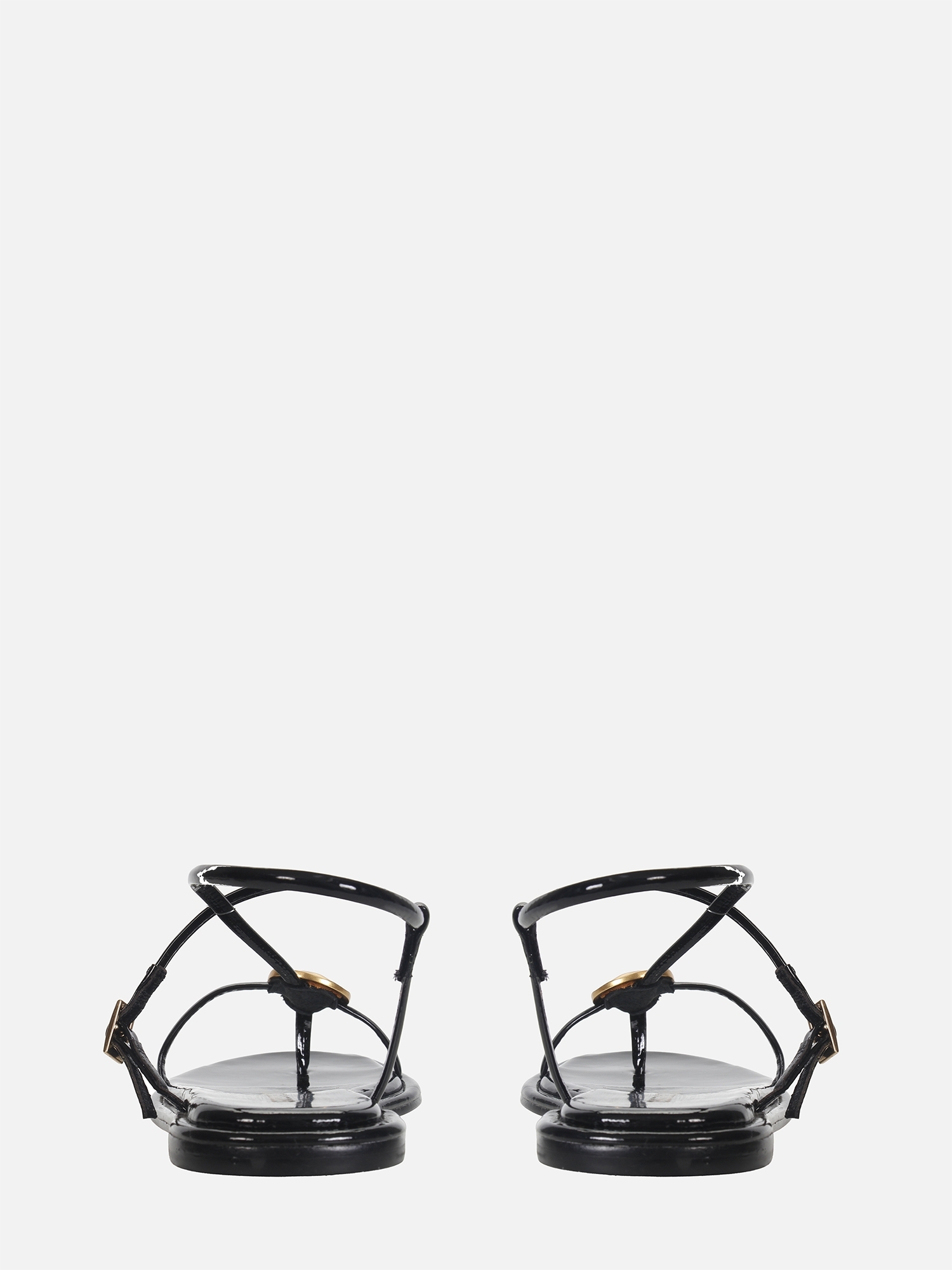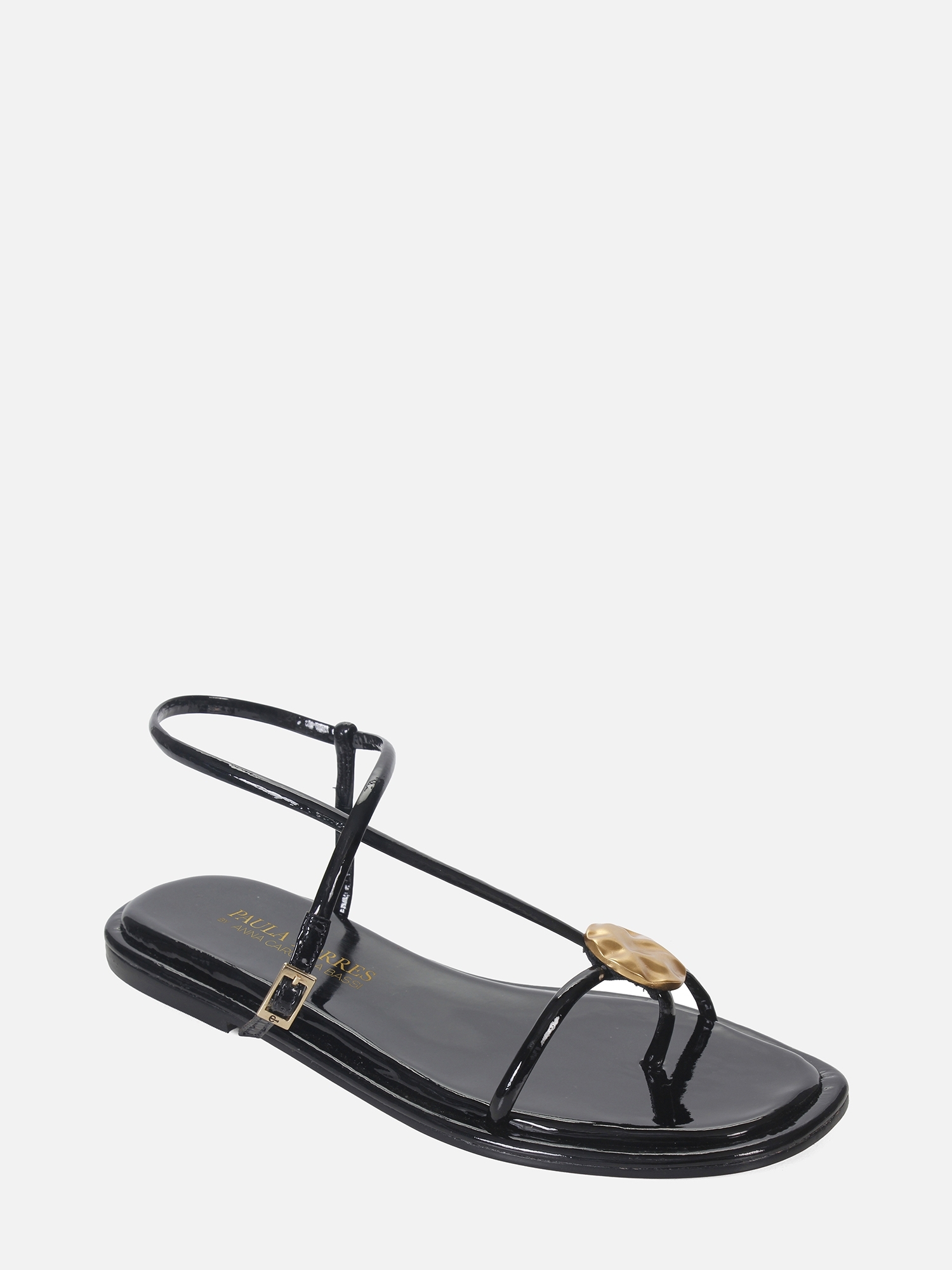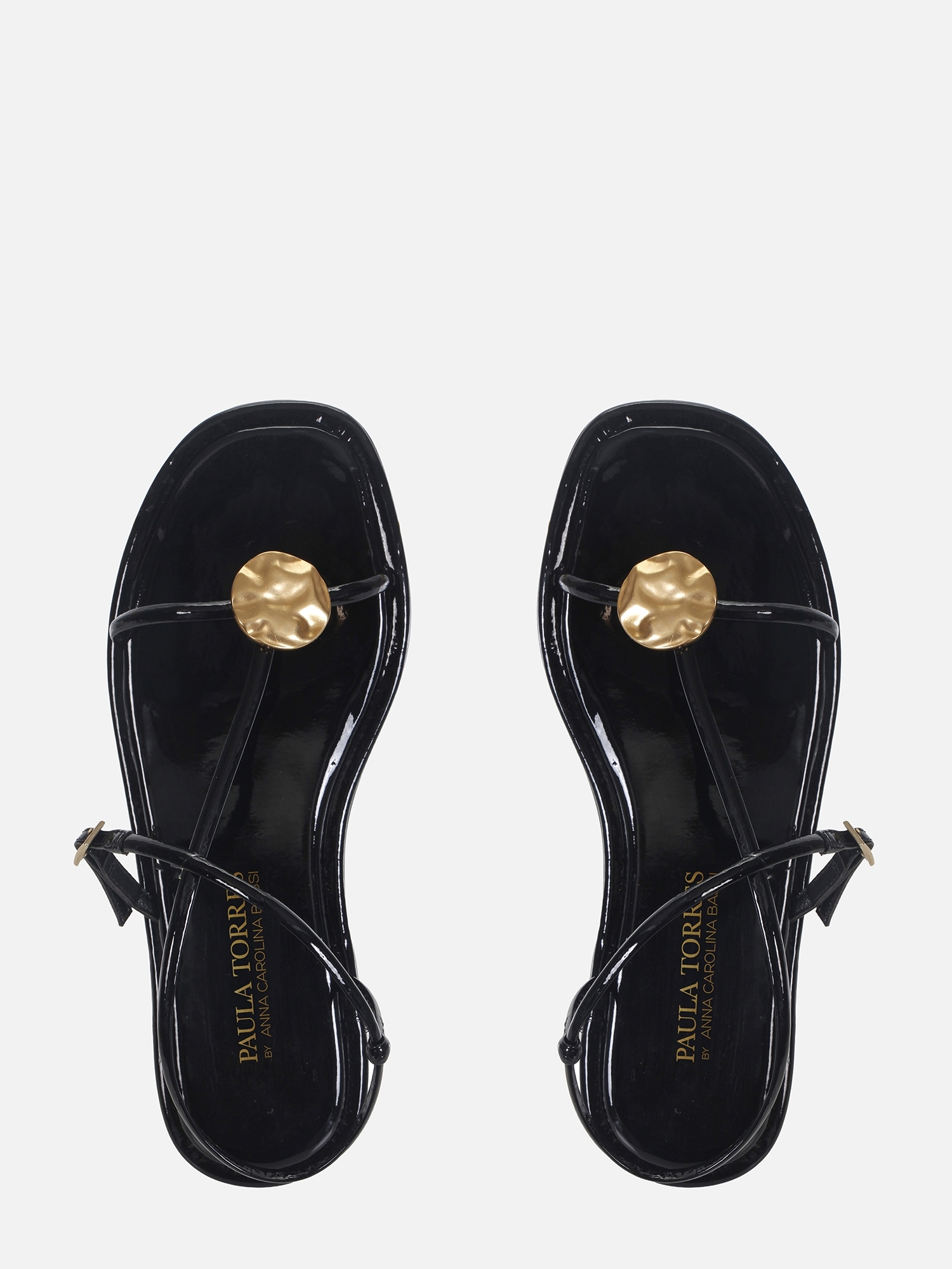 A Rasteira Carol Preta, confeccionada em verniz, apresenta um design minimalista, sofisticado e moderno. Seu destaque fica por conta da aplicação central em metal com acabamento orgânico, que realça o visual contemporâneo. As tiras finas com fechamento ajustável completam o modelo.