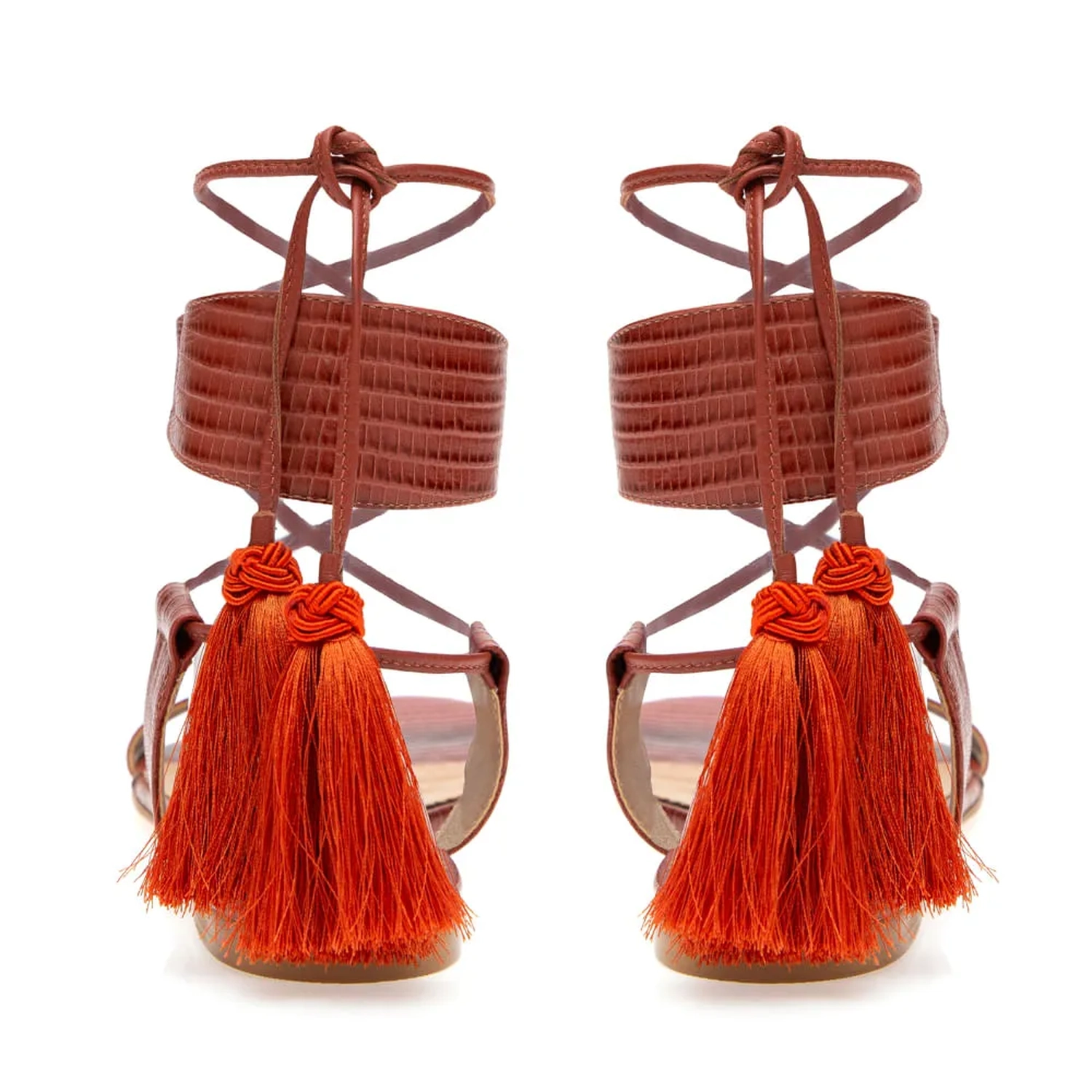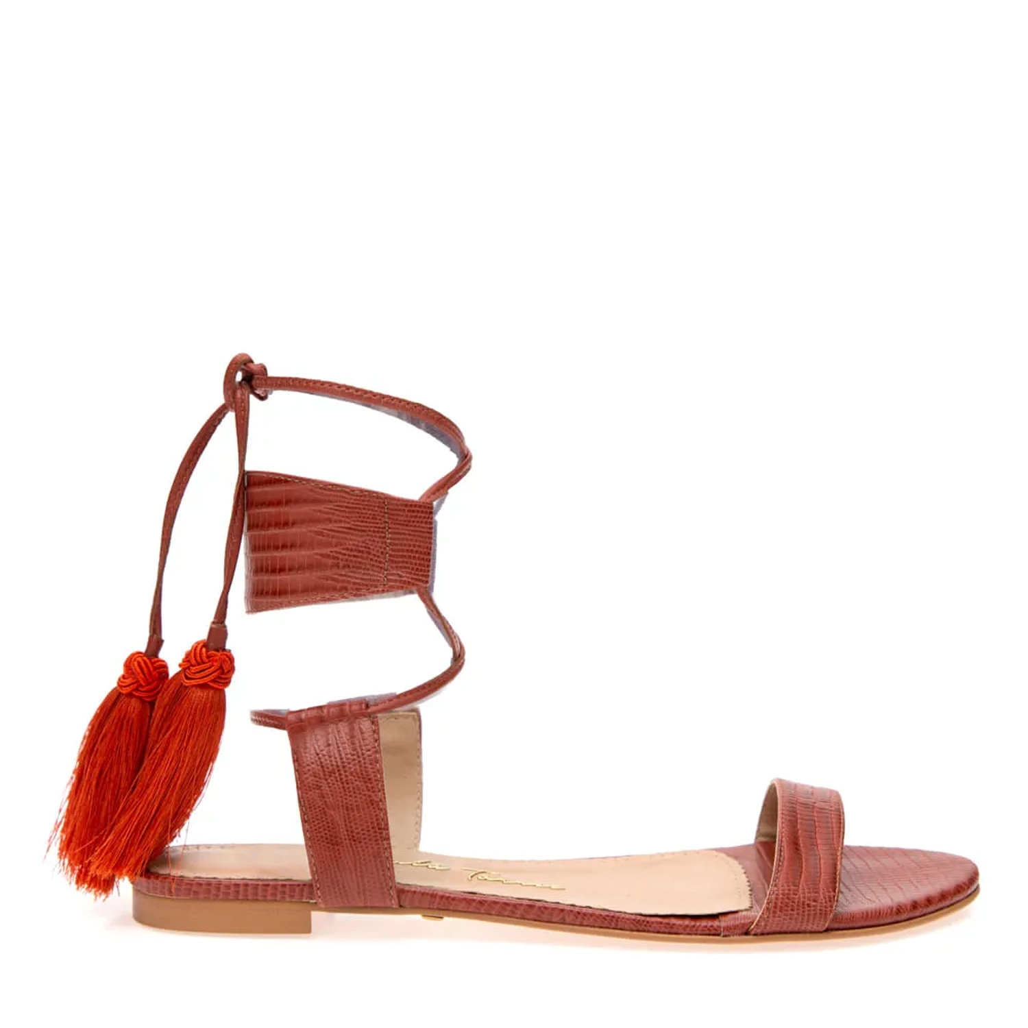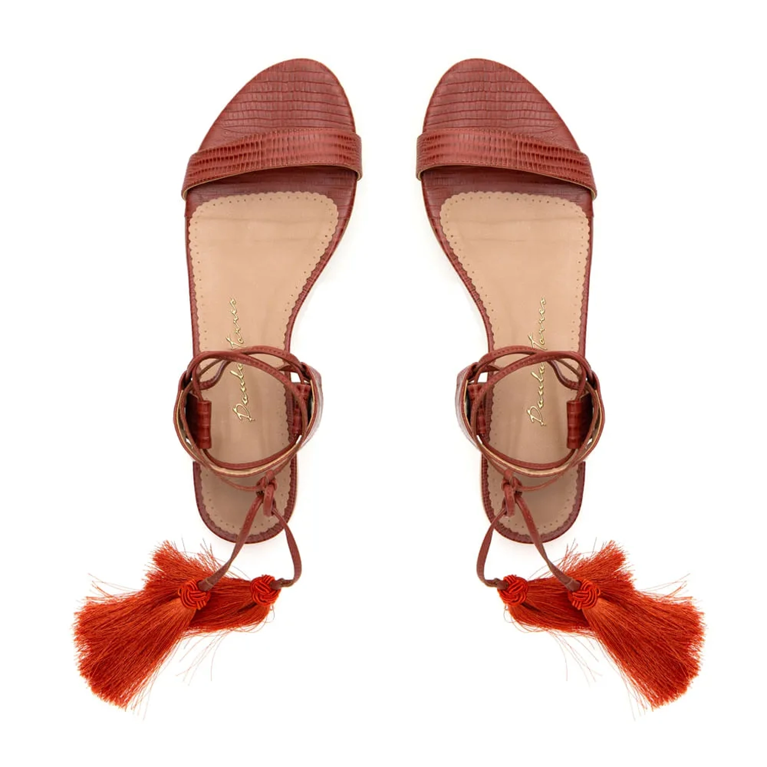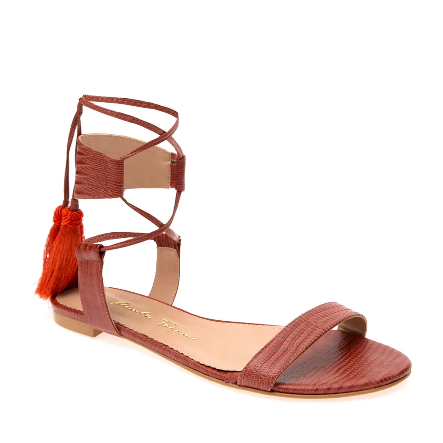 A Rasteira Clarke é confeccionada em couro. Modelagem em bico redondo e estampa mini lezard. Cabedal composto por uma tira de couro de mesma estampa e cor do acolchoado da palmilha. Fechamento por amarração, trazendo as tiras finas de couro dispostas de maneira que remetem ao fechamento de sapatilhas de balé. As tiras são finalizadas em barbicacho. Modelo confortável que carrega elegância e estilo Paula Torres.