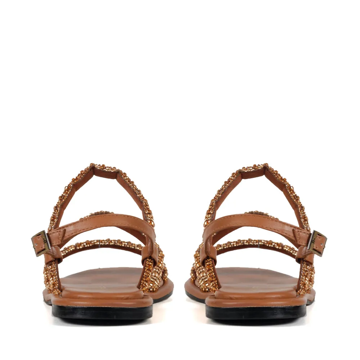 A Rasteira Estelle é confeccionada em couro. Modelagem em bico quadrado, levemente arredondado nas extremidades, e cabedal composto por três tiras. O diferencial da peça são as aplicações de cristais sobre as tiras de couro, trazendo glamour e sofisticação. Fechamento lateral por fivela na aluta do tornozelo.