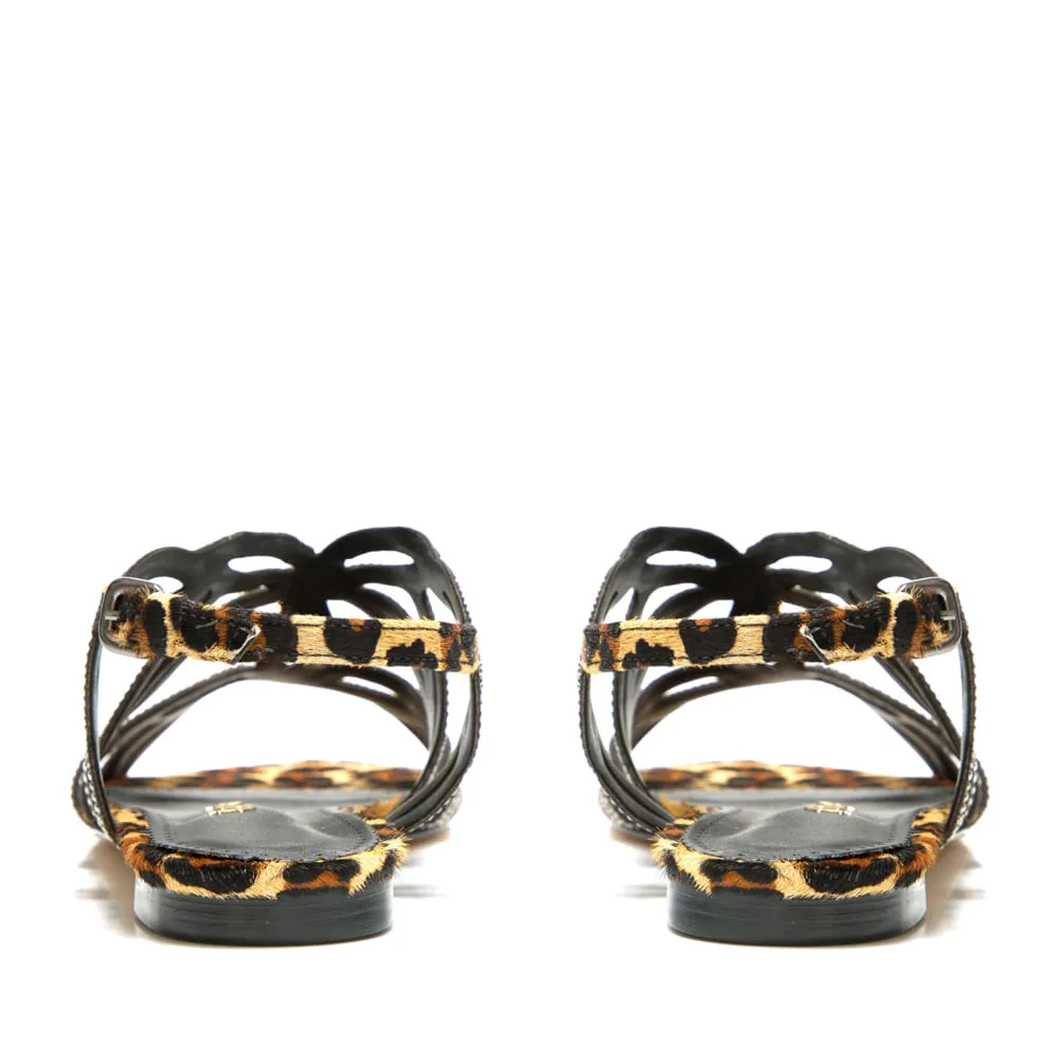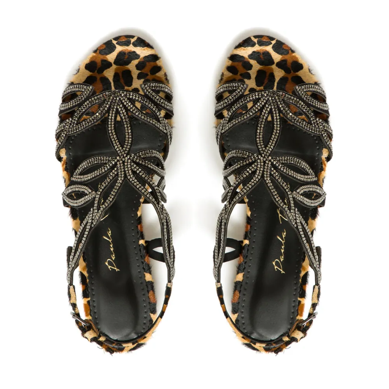 A Rasteira flower é produzida em pelo. O clássico modelo da Paula Torres foi repaginada agora com o atemporal print animal. A parte de cima com tiras formando pétalas e aplicação de cristais, o fechado feito por fivela com ajuste lateral.
