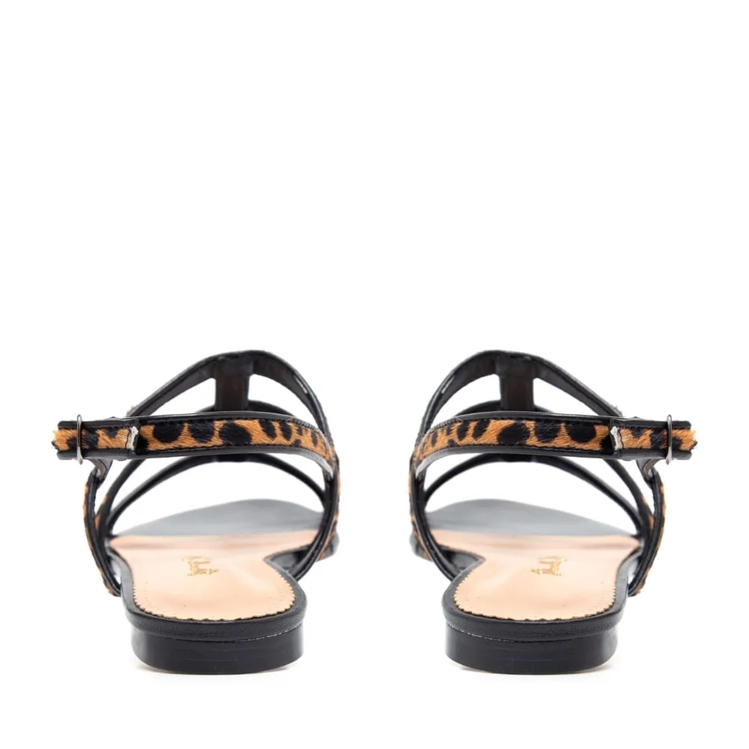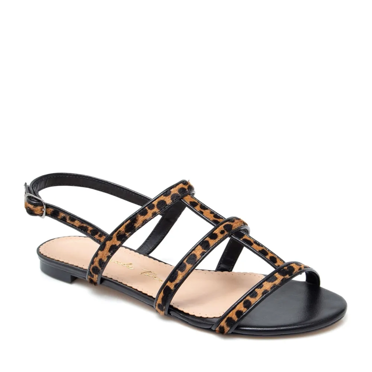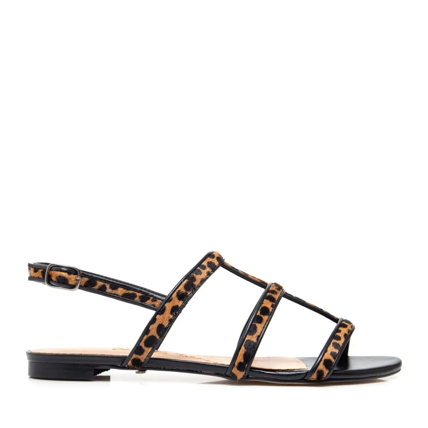 A Rasteira Gisa traz um mix de materiais clássicos. A parte de cima com tiras finas em pelo com estampa animal finalizadas com debrum em couro. Fechamento por fivela lateral ajustavel. Palmilha em couro, perfeita para quem não abre mão do conforto. Cor: Preto