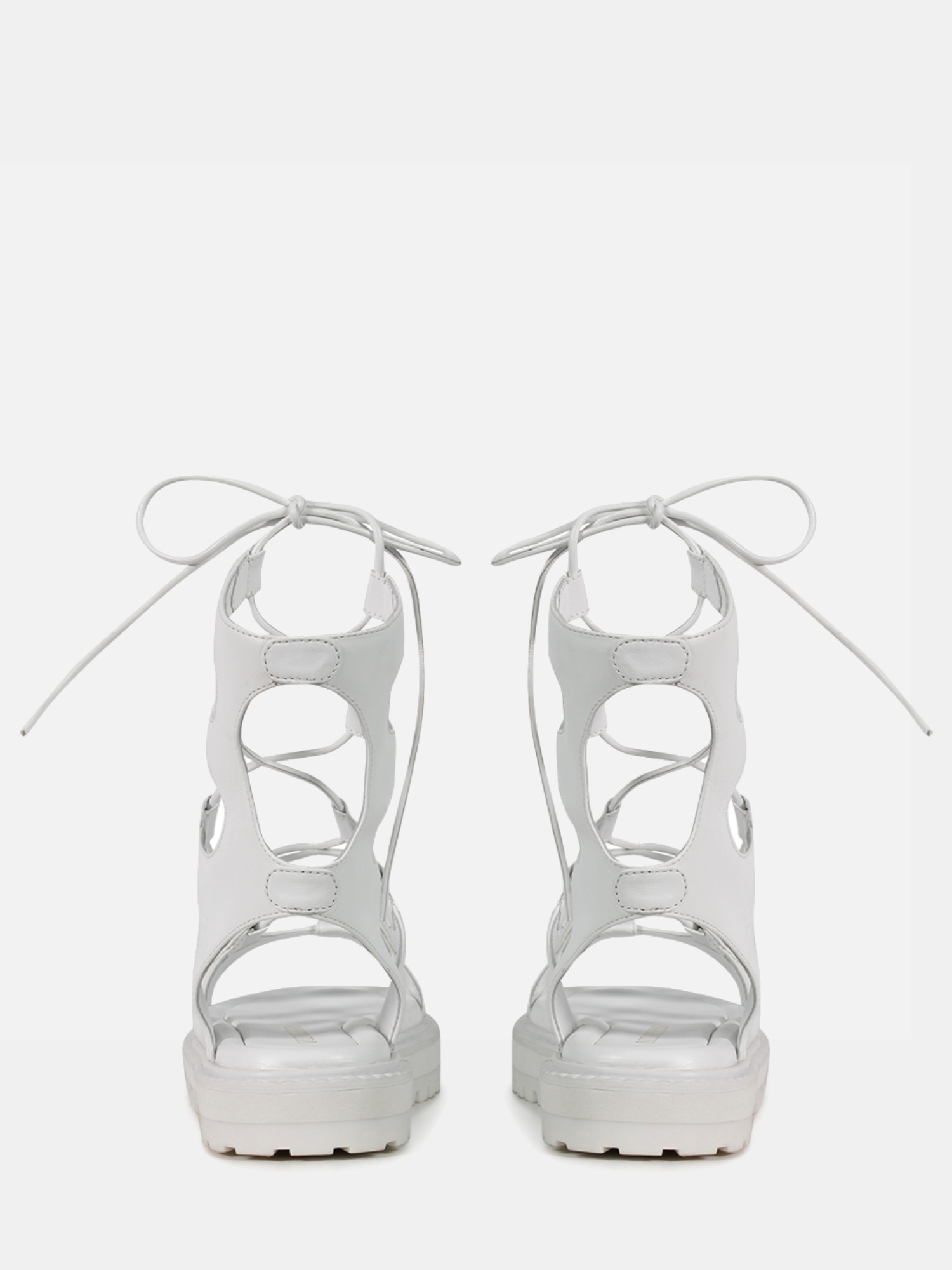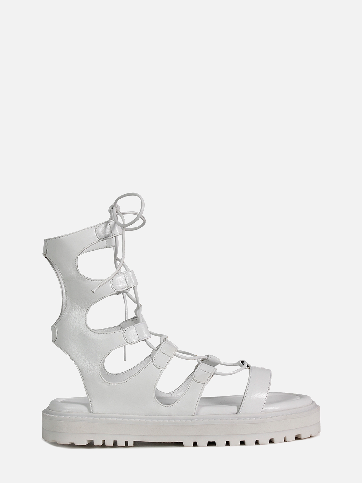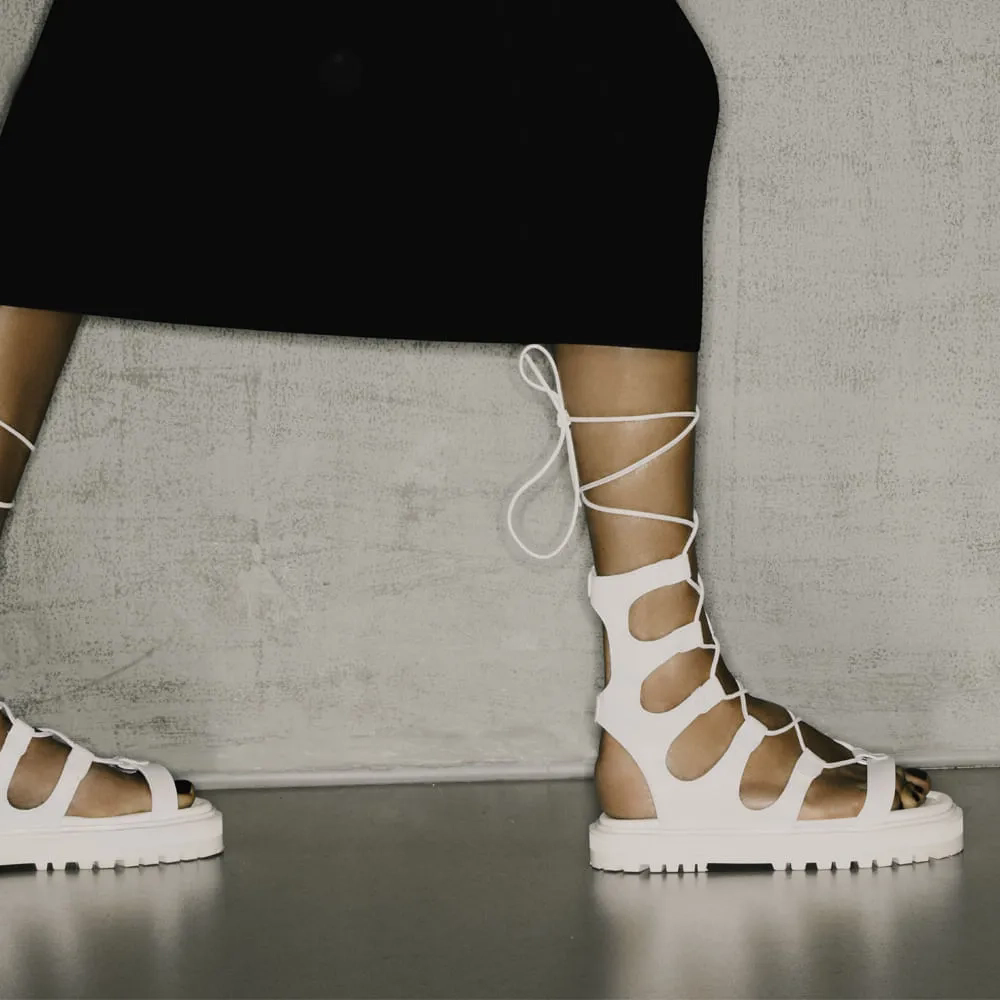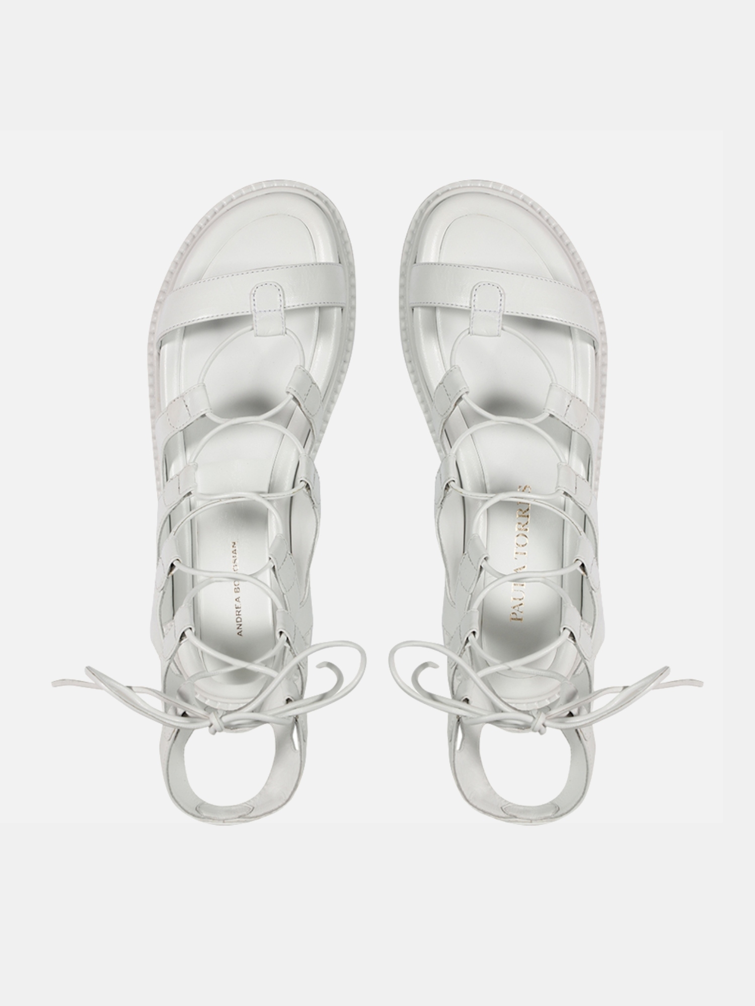 A Rasteira Gladiadora Sunset é confeccionada em couro. Modelagem em bico fino arredondado e solado tratorado. Seu cabedal é composto por uma tira reta na frente e seis tiras abertas com passantes nas extremidades. A palmilha acolchoada, trazendo conforto ao calce, traduz o DNA handmade da marca.