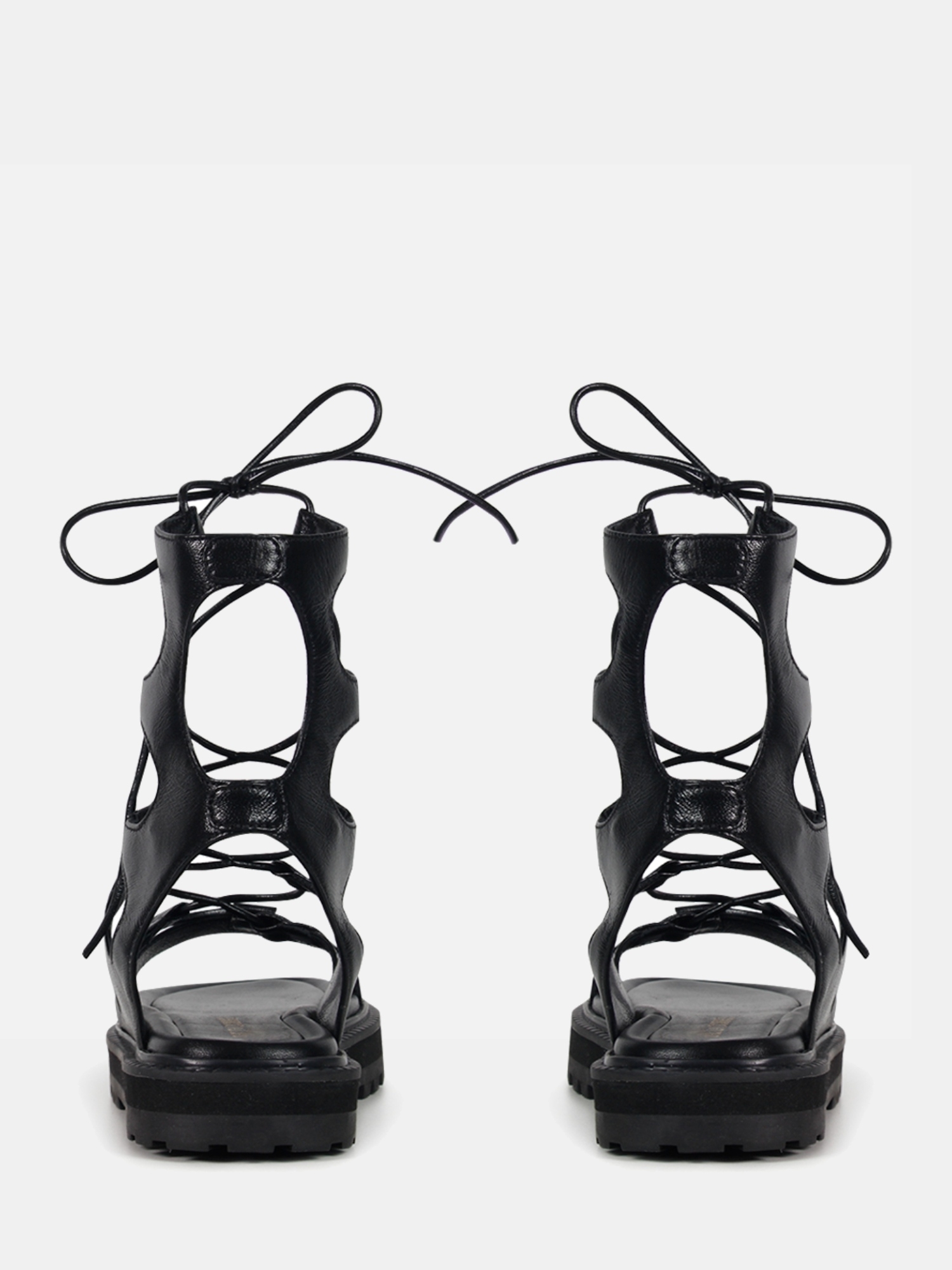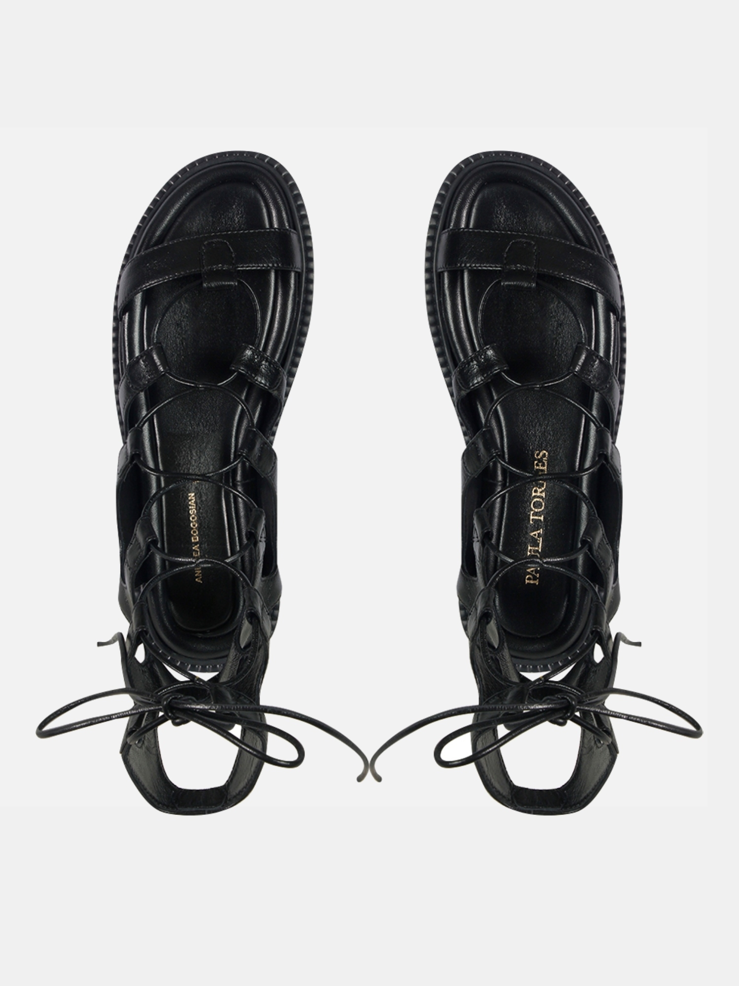 A Rasteira Gladiadora Sunset é confeccionada em couro. Modelagem em bico fino arredondado e solado tratorado. Seu cabedal é composto por uma tira reta na frente e seis tiras abertas com passantes nas extremidades. A palmilha acolchoada, trazendo conforto ao calce, traduz o DNA handmade da marca.