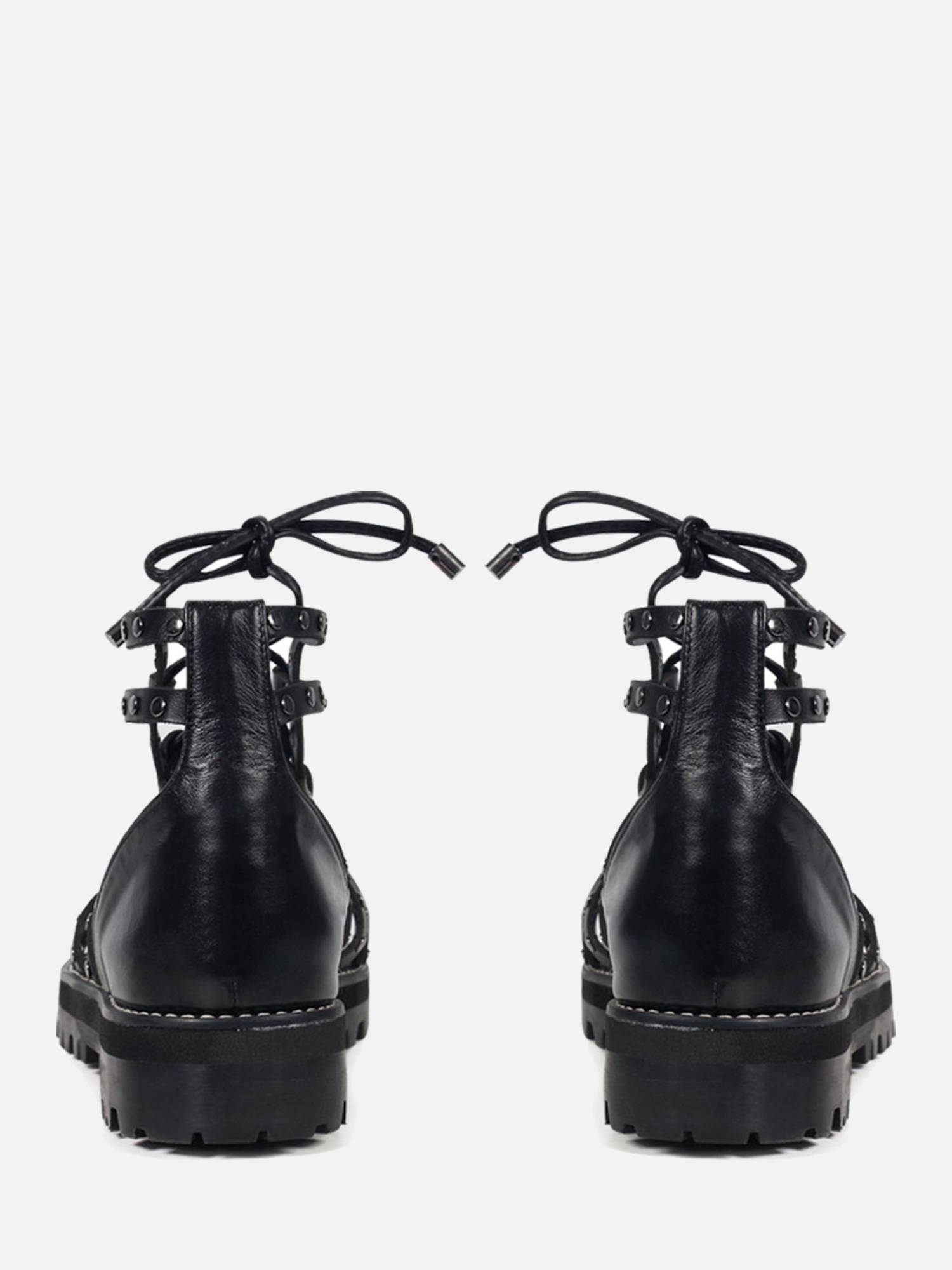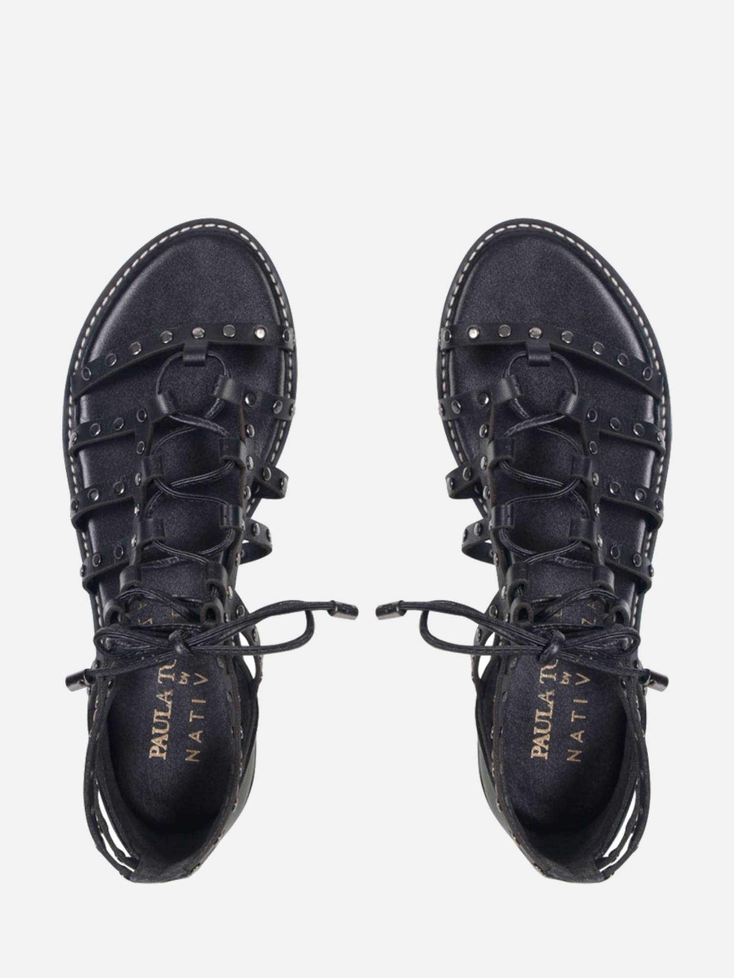 Repaginando as clássicas gladiadoras, a Rasteira Glam é produzida em couro, o modelo tem em suas laterais, tiras finas de couro, sendo finalizadas por amarração o solado do tipo flatform tratorado funde-se aos rebites metalizados sob o cabedal conferindo personalidade e identidade de moda a peça.