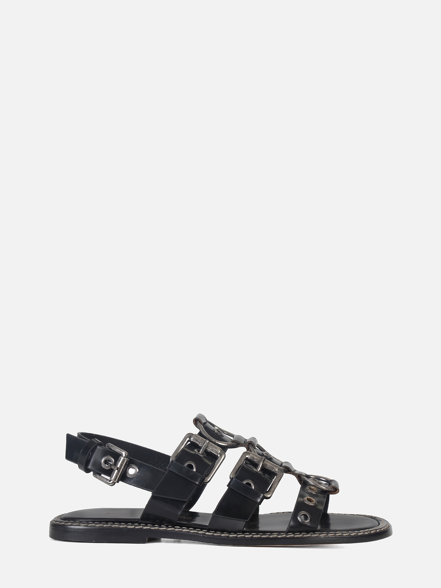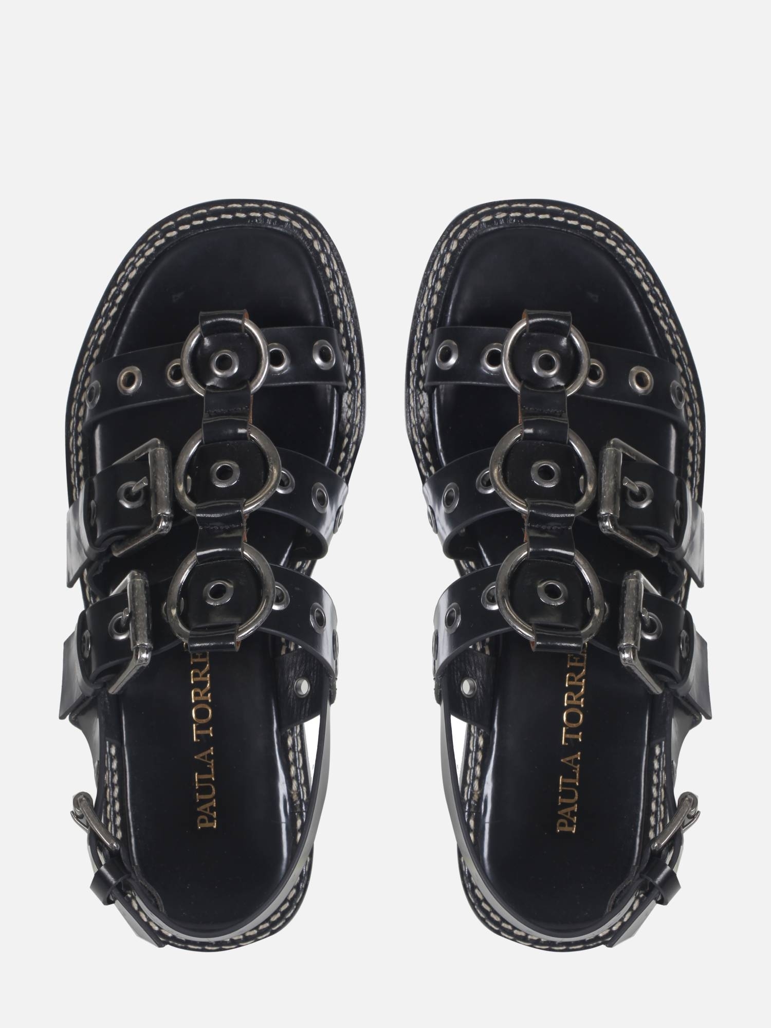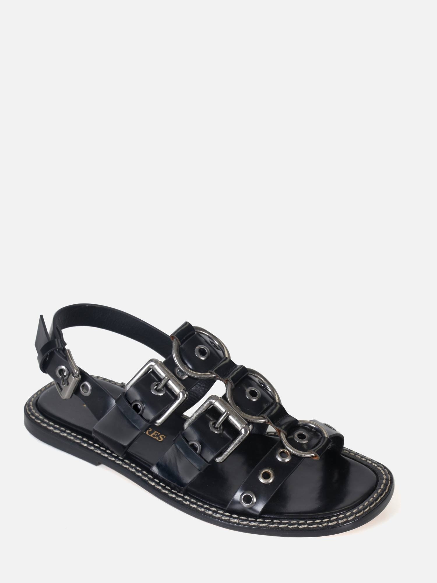 A Rasteira Iara é confeccionada em couro metalizado. O modelo conta com três tiras largas sobre o peito do pé, adornadas com ilhoses e argolas metálicas que as unem no centro, trazendo um toque moderno ao design. O ajuste é feito por uma fivela lateral, enquanto a parte traseira também apresenta fechamento por fivela. A vira com pesponto duplo contrastante e o solado em couro garantem sofisticação e durabilidade à peça.