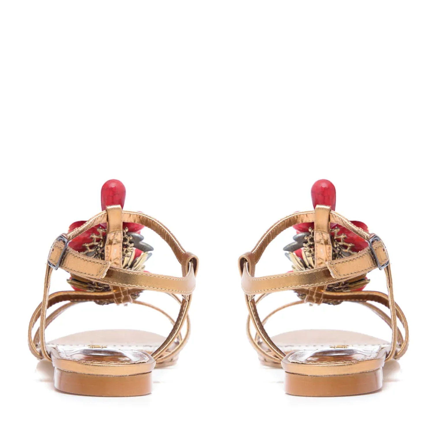 A Rasteira Jade é confeccionada em couro. De modelagem clássica, com tiras finas, tem como diferencial a aplicação manual de pedras naturais.