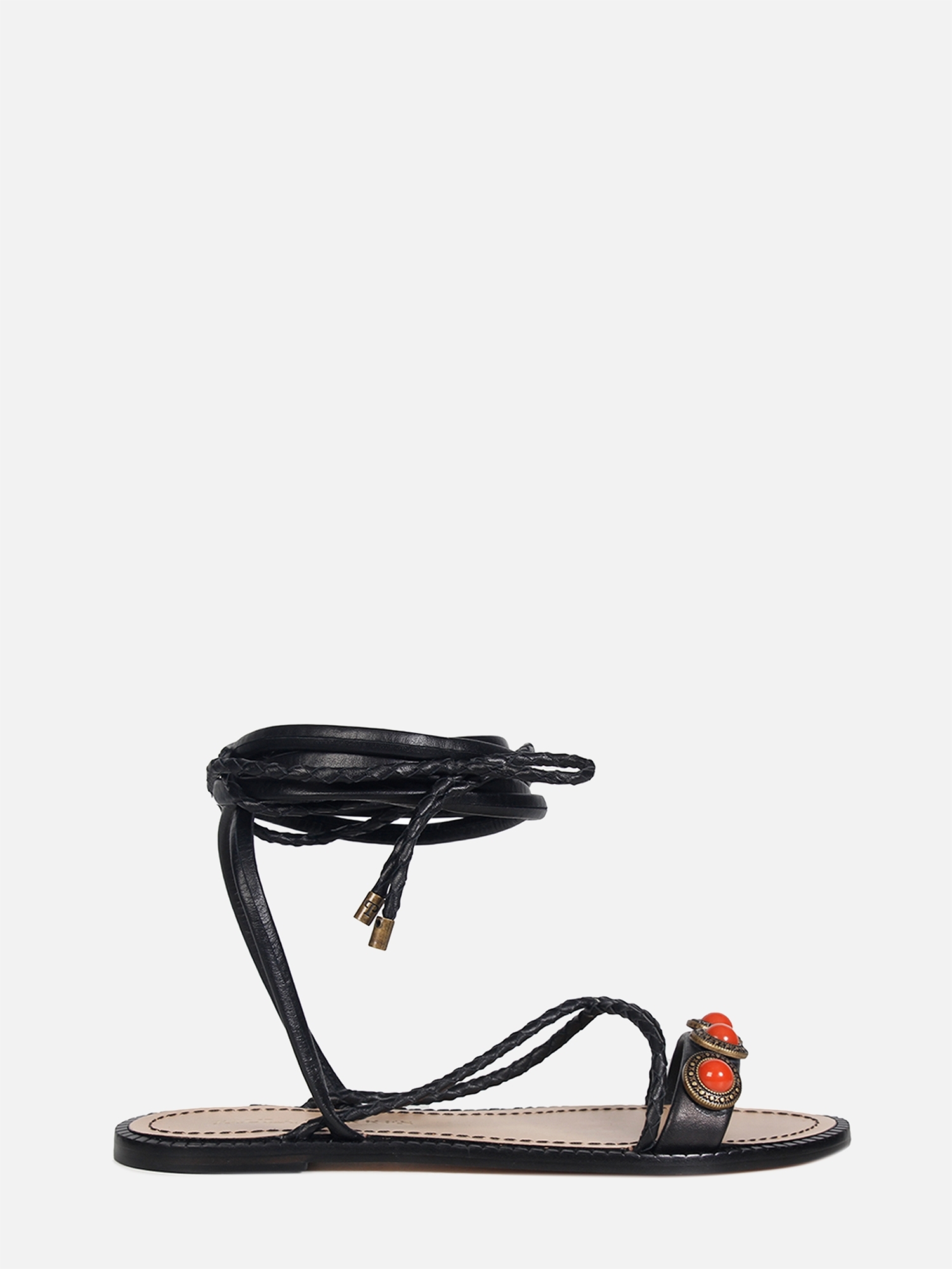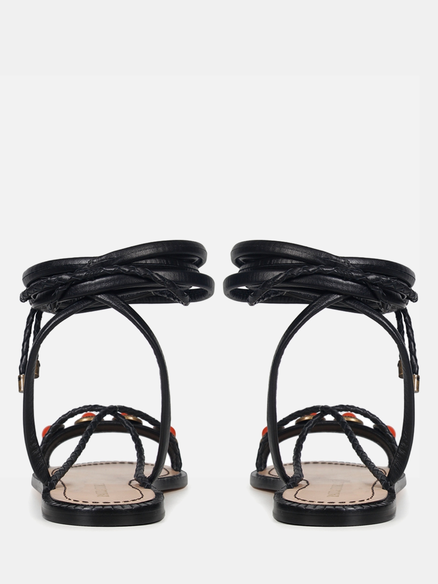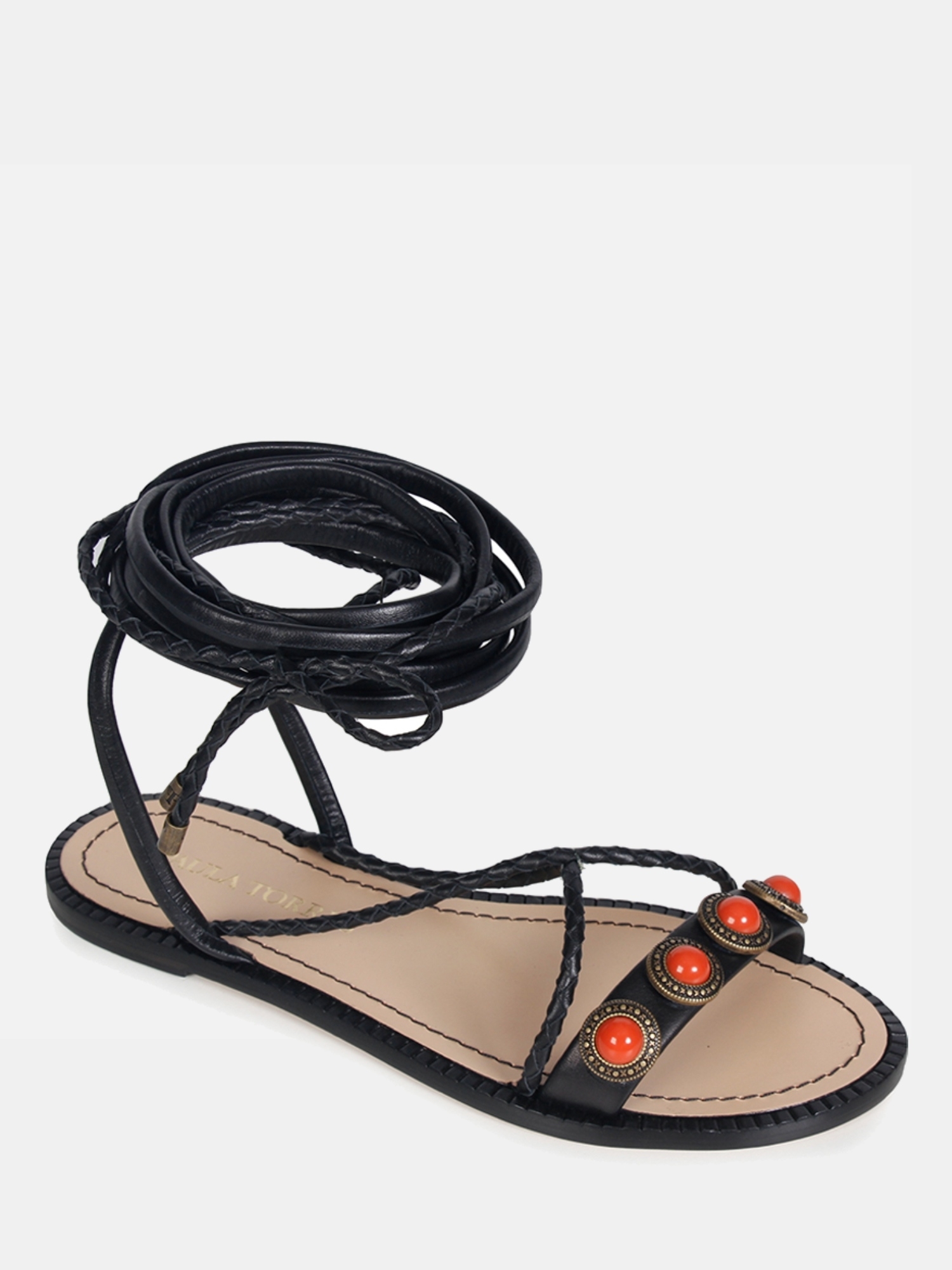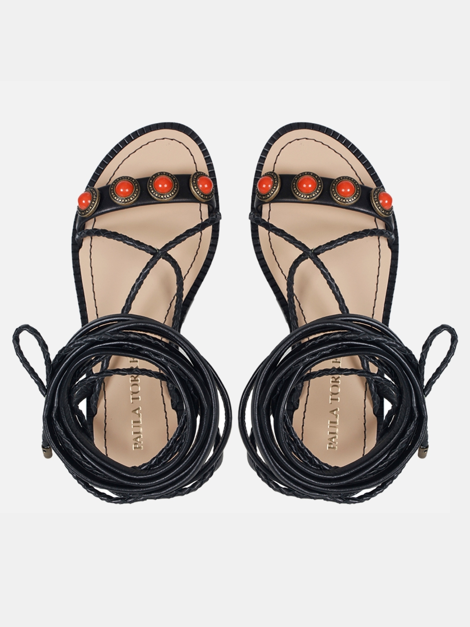 A Rasteira Jade é confeccionada em couro. Modelagem em bico arredondado e cabedal composto por tiras de couro. Os diferenciais da peça são as aplicações em metal com pedrarias circulares e o fechamento por amarração extensa, criando uma estética despojada e estilosa, traduzindo o DNA handmade da marca.