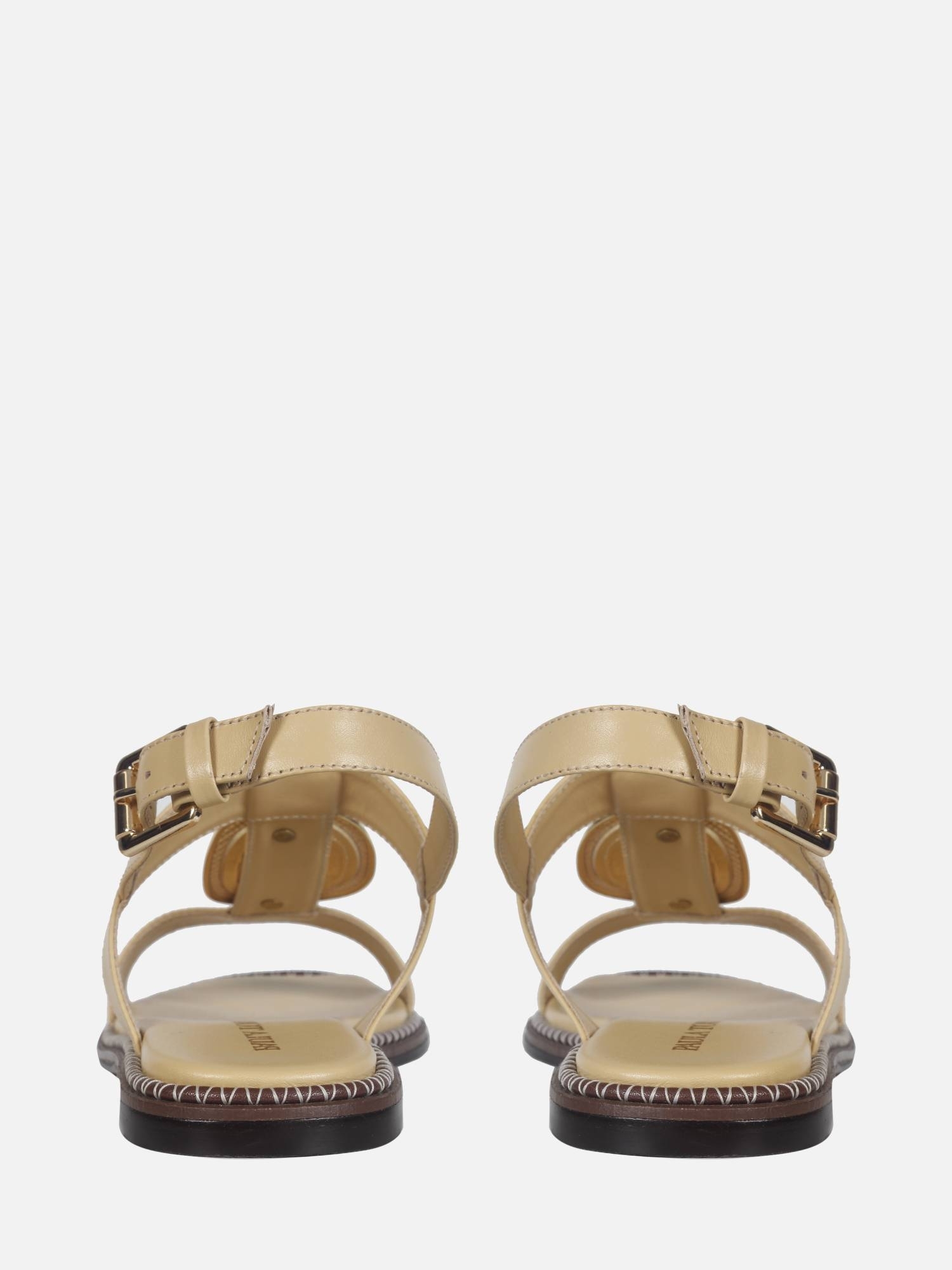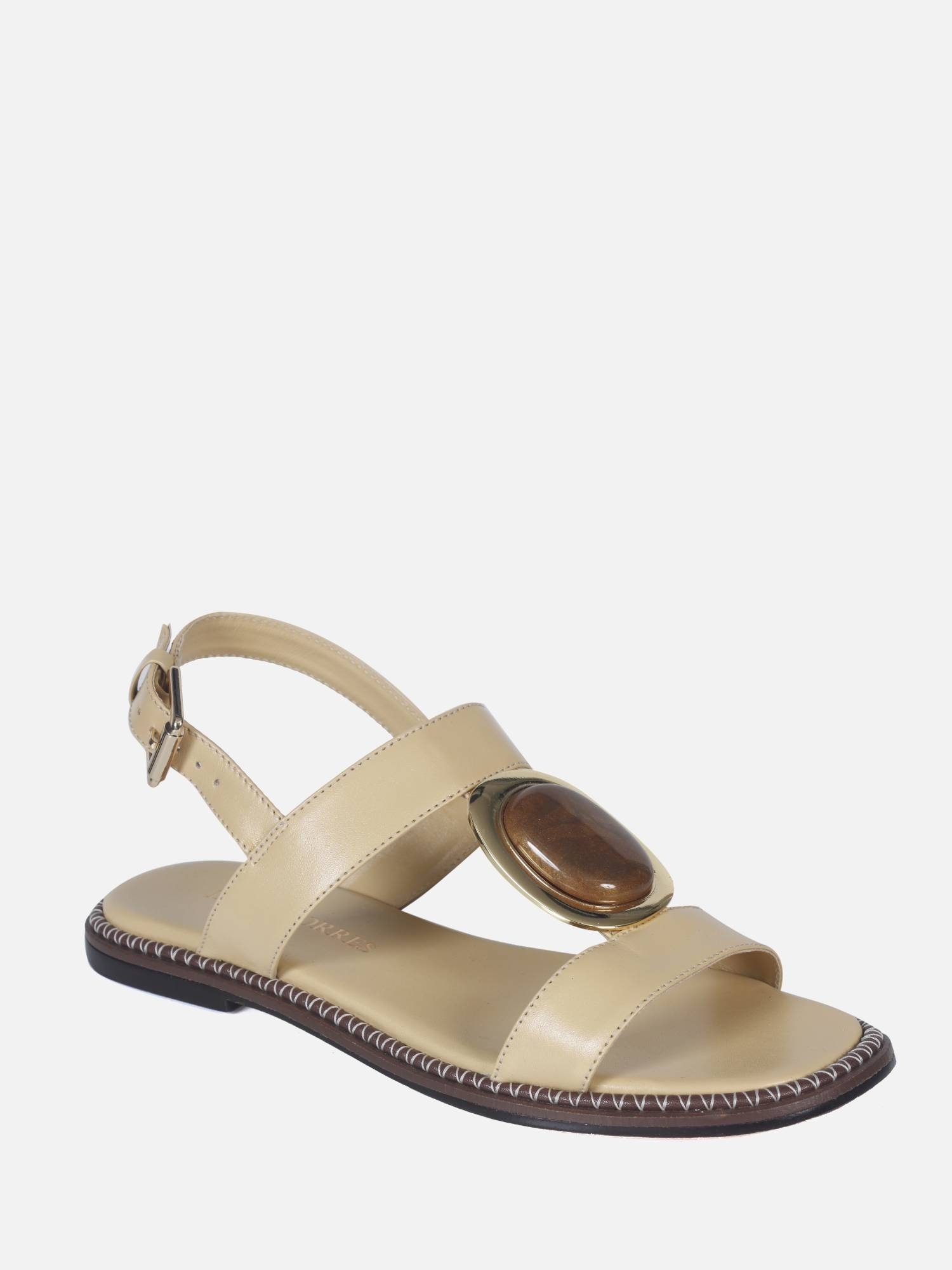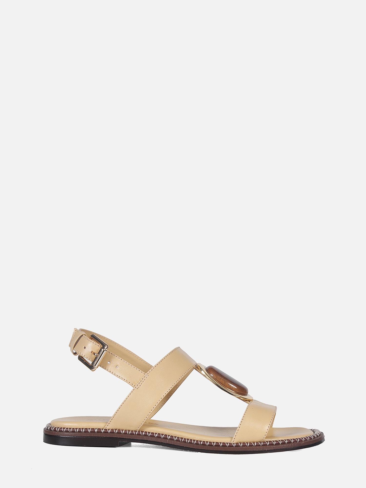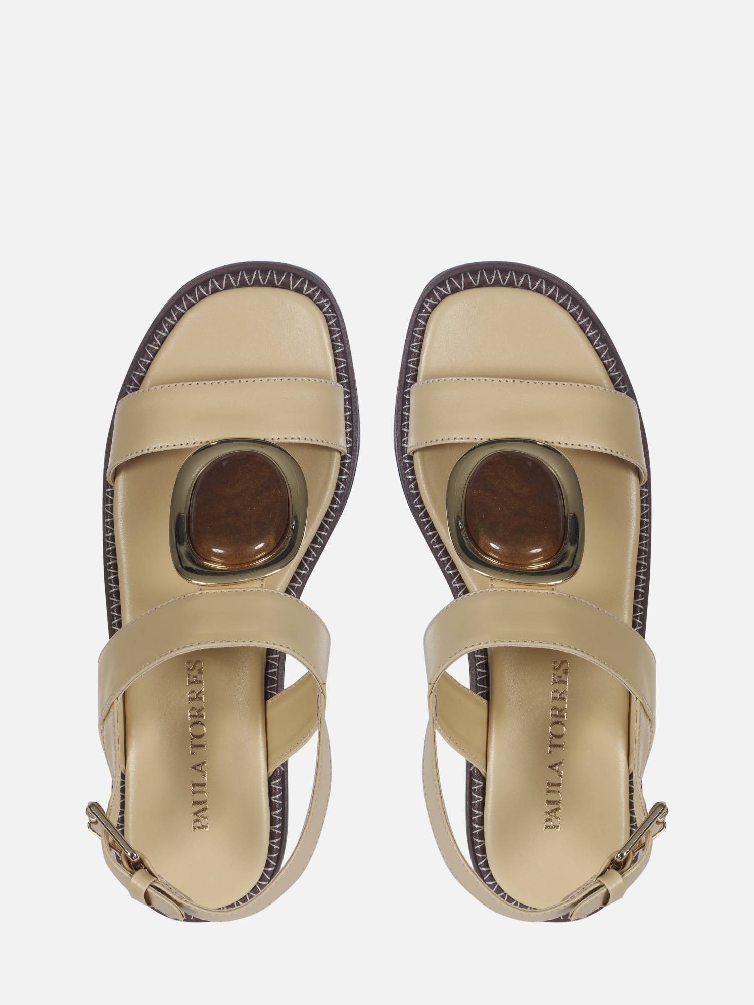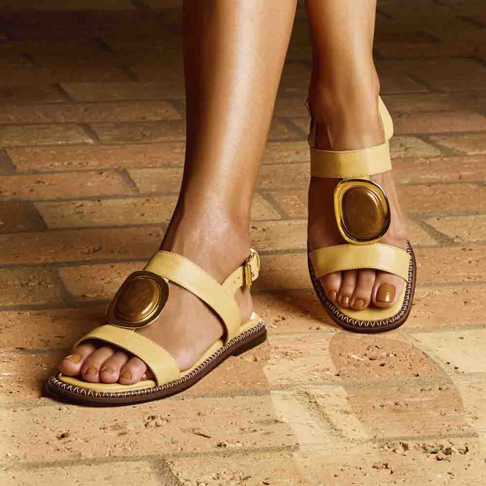 A Rasteira Joana é produzida em couro. Seu design é composto por duas tiras largas na parte de cima com a aplicação de uma pedra resinada em formato orgânico sobre metal de banho dourado. Tira no calcanhar com fivela lateral para ajuste. Vira forrada com pesponto contrastante e solado em couro proporcionando durabilidade e sofisticação ao sapato.
