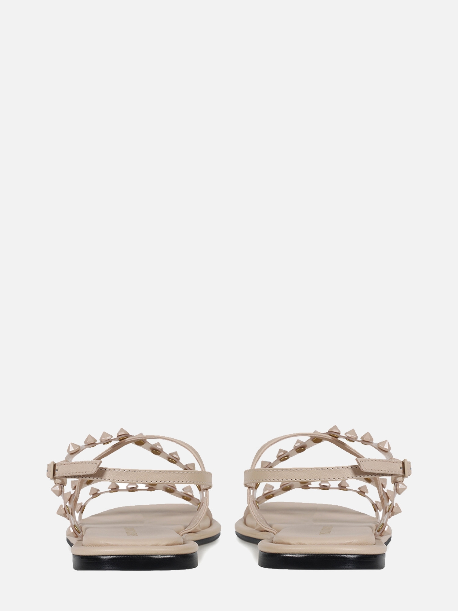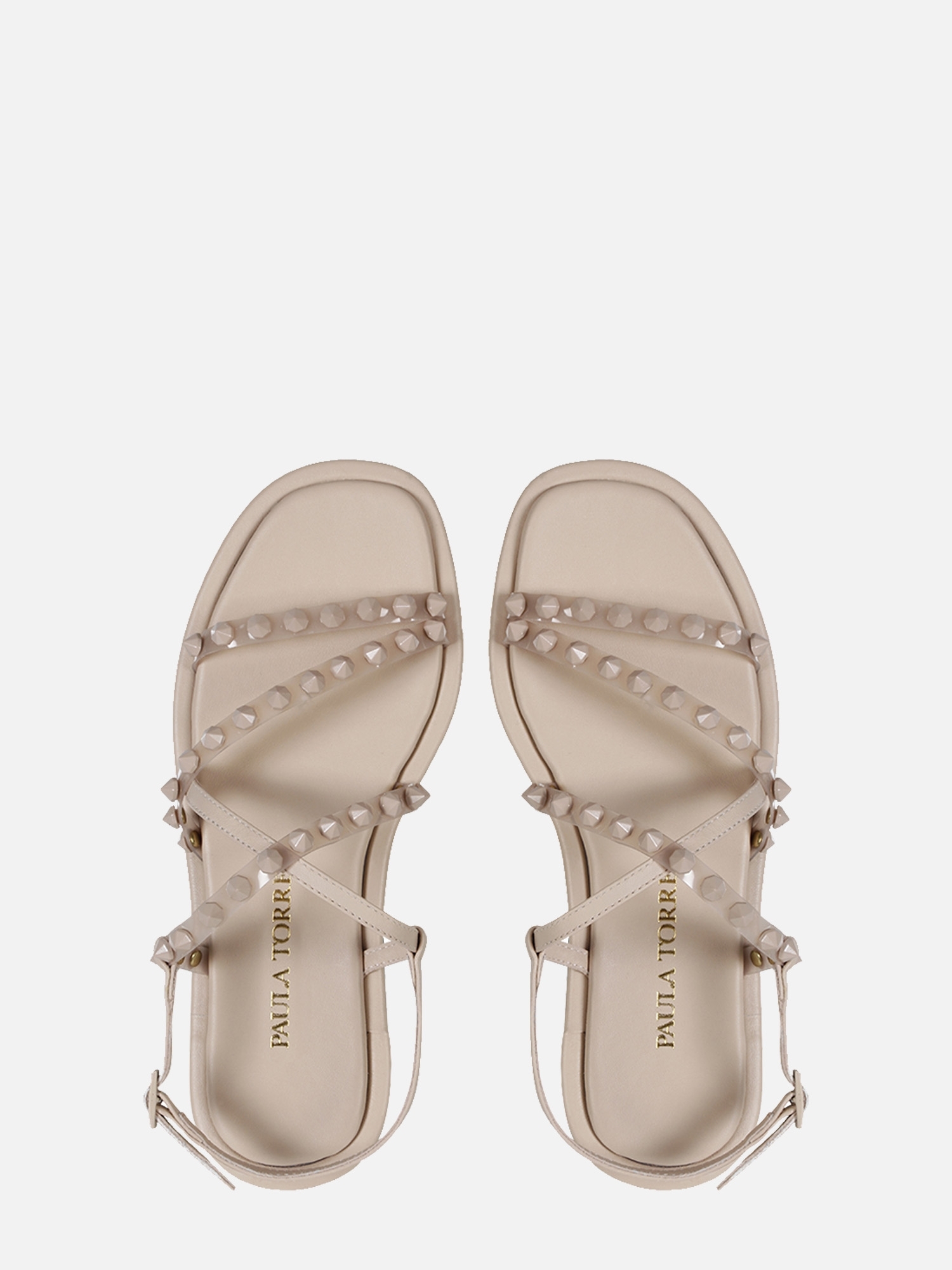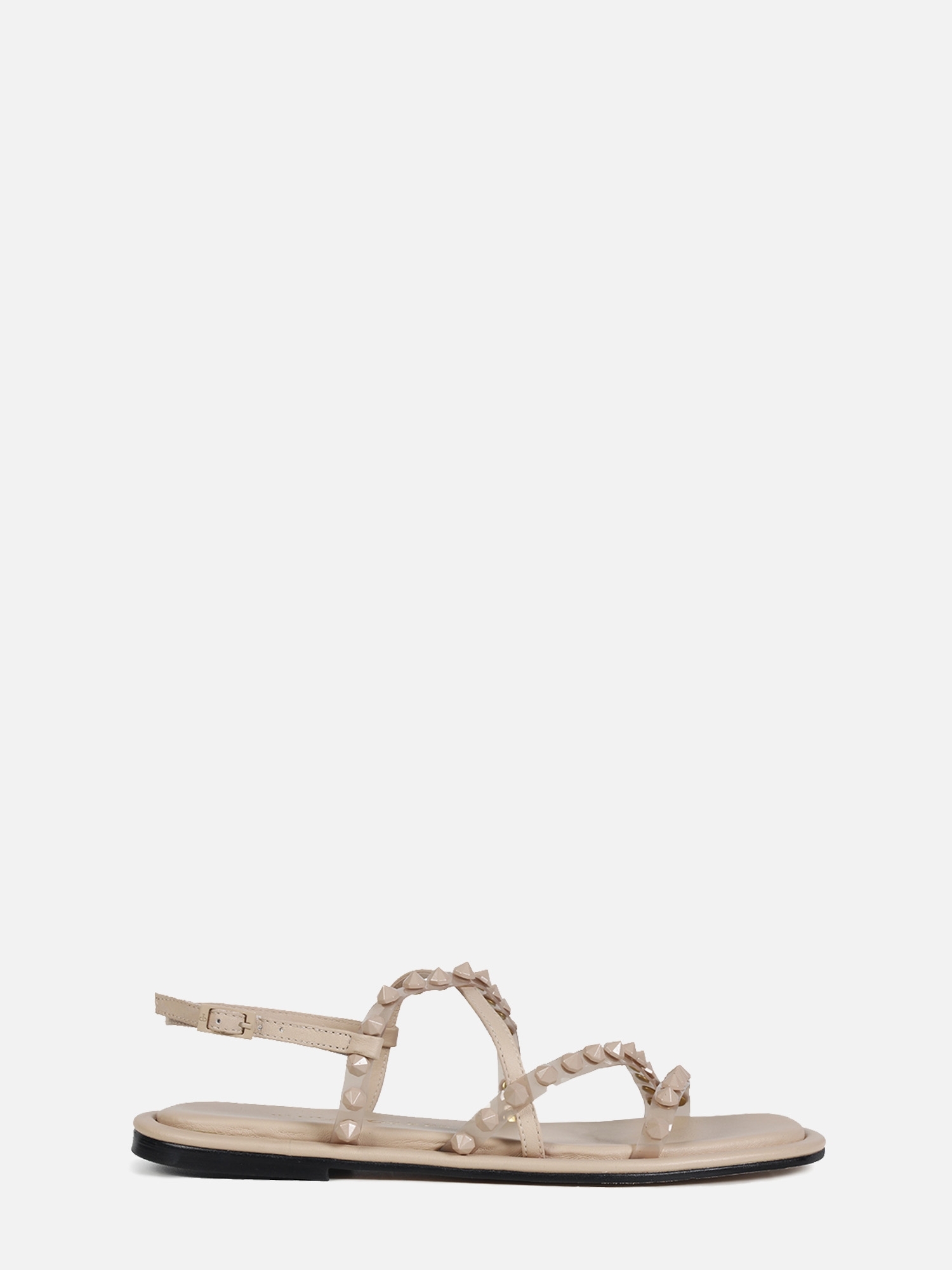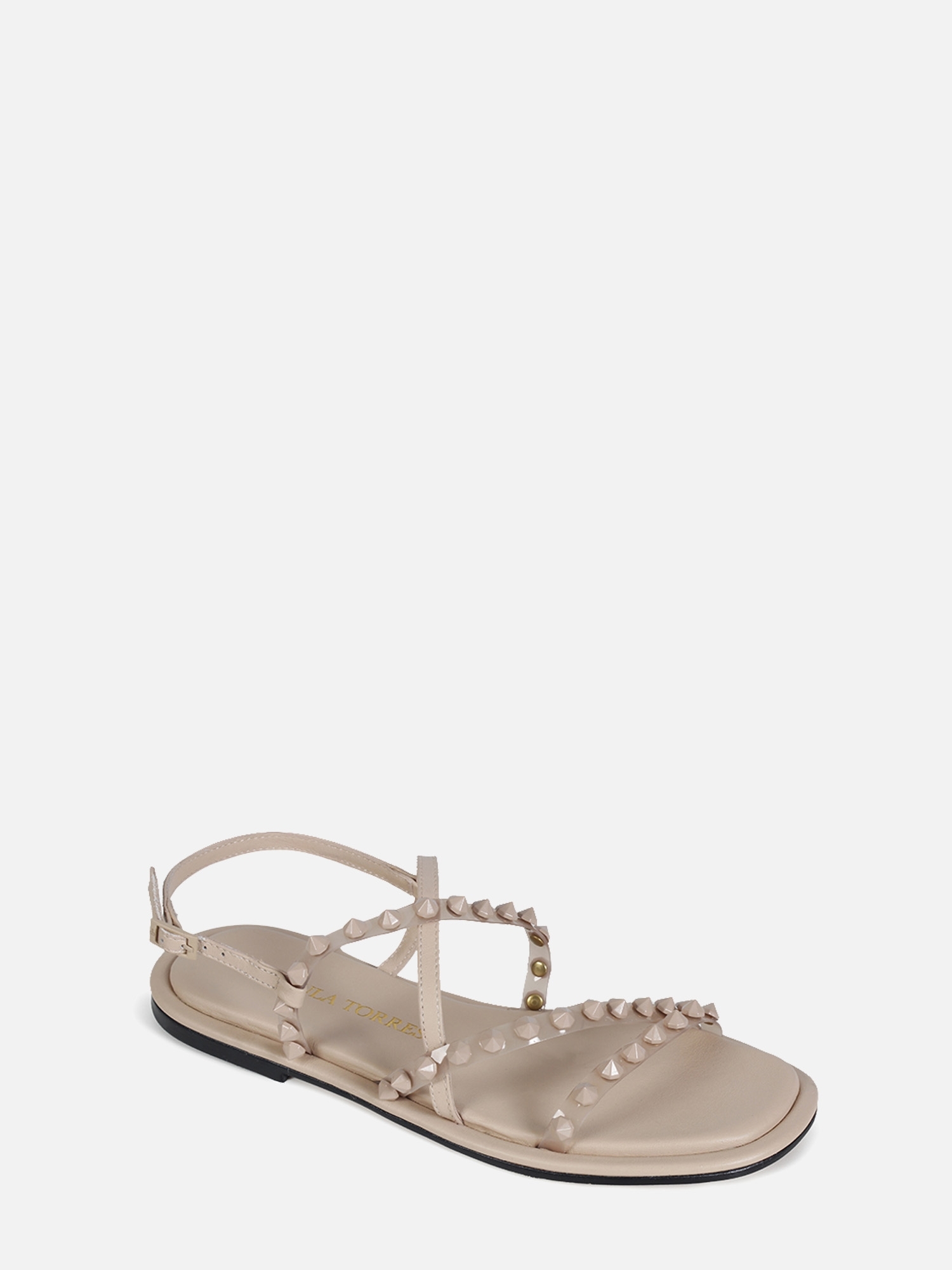 A Rasteira Joy é confeccionada em couro. Modelagem em bico quadrado, levemente arredondado nas extremidades, e cabedal composto por tiras dispostas assimetricamente. O diferencial da peça são o contraste da transparência do vinil e as spikes na mesma cor do couro. A composição confere uma estética contemporânea e despojada, totalmente Paula Torres.