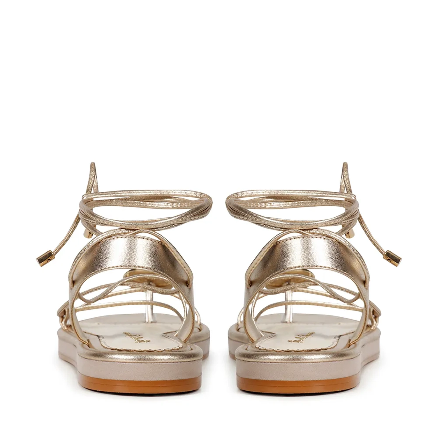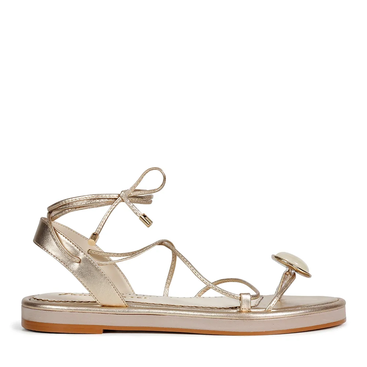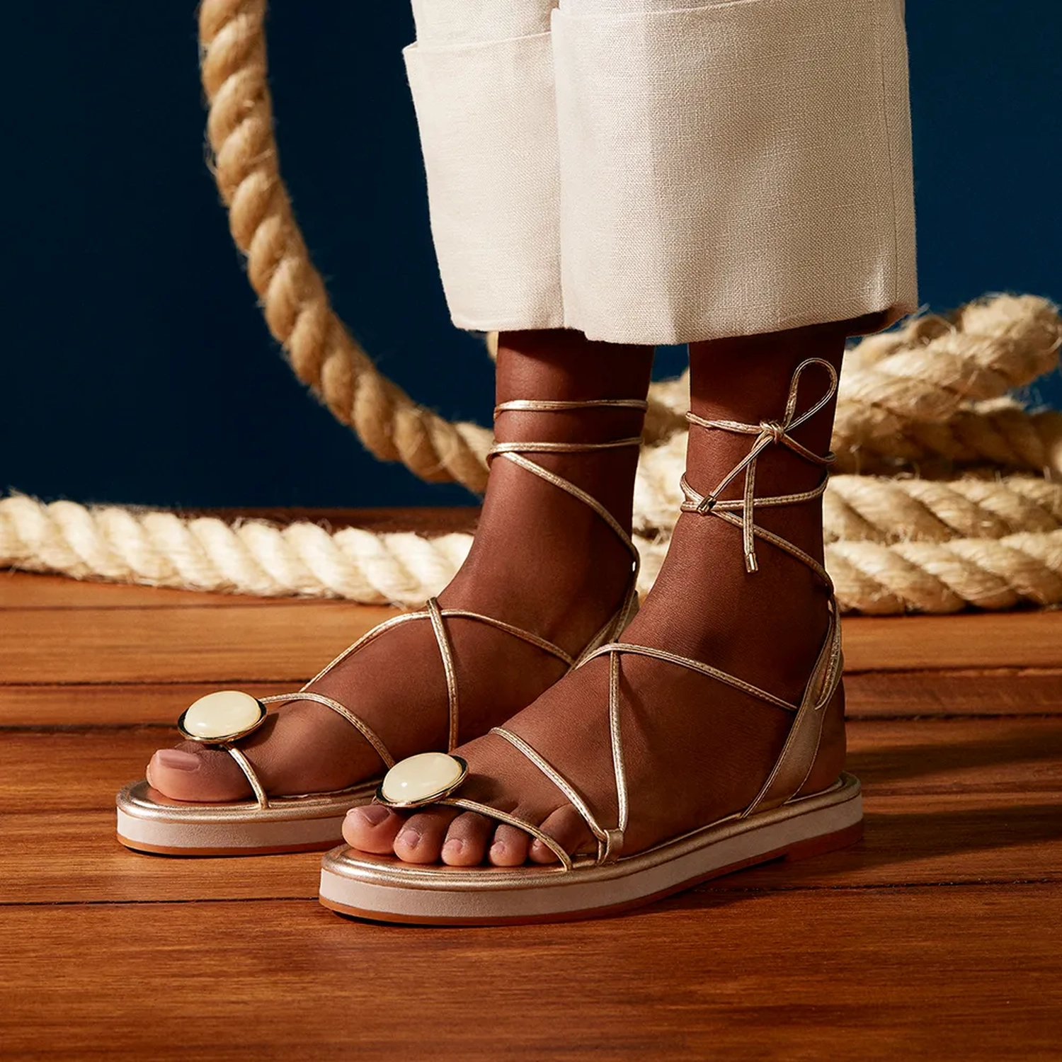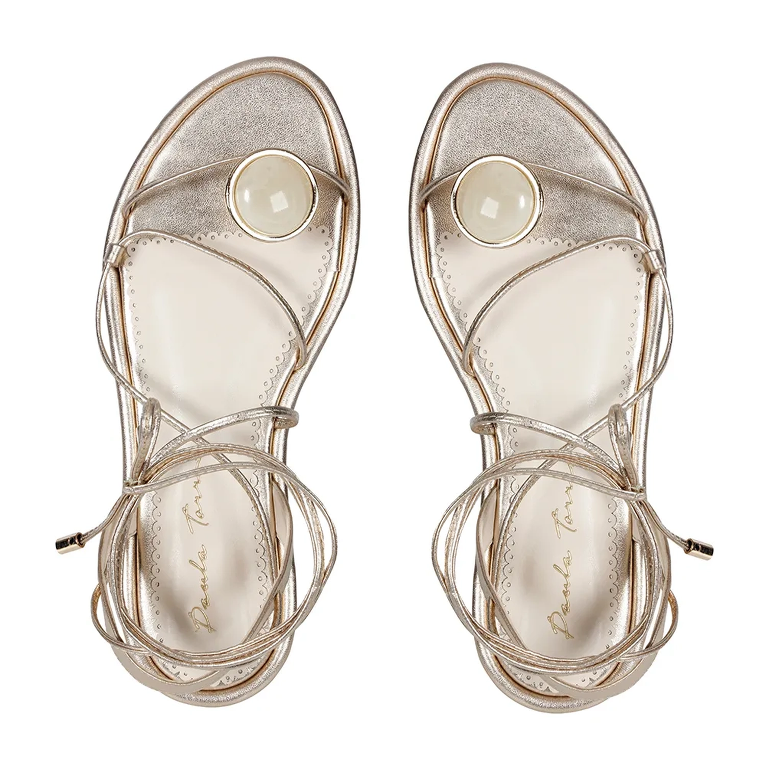 A Rasteira Lara é confeccionada em couro. O modelo possui bico arredondado que combina com o destaque da peça: aplicação de pedra em formato circular na parte da frente do cabedal. A amarração é feita por tiras em couro, finalizadas com ponteiras de metal. O material e a aplicação tornam o modelo super confortável, elegante. Totalmente Verão 22, com qualidade Paula Torres!