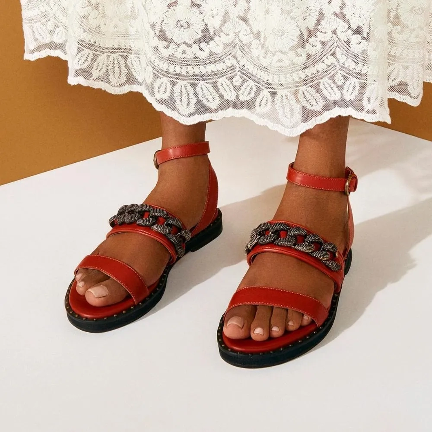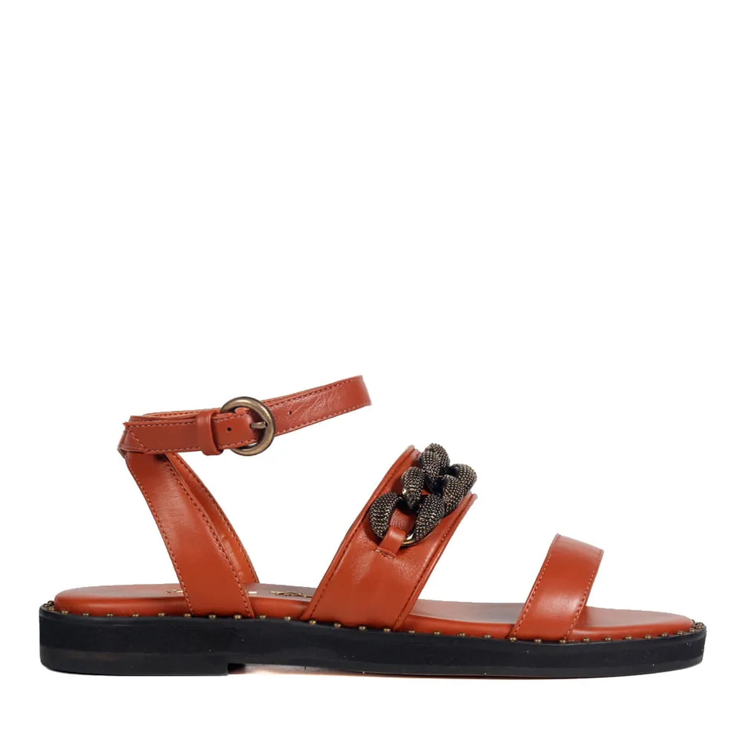 Confeccionada em couro, a Rasteira Lima apresenta uma estética sofisticada e glamorosa. Modelagem em bico redondo e tiras horizontais no cabedal. O diferencial da peça é a corrente estilizada e a vira com rebites metalizados, garantindo identidade e estilo ao modelo. O fechamento por fivela arremata a rasteira.