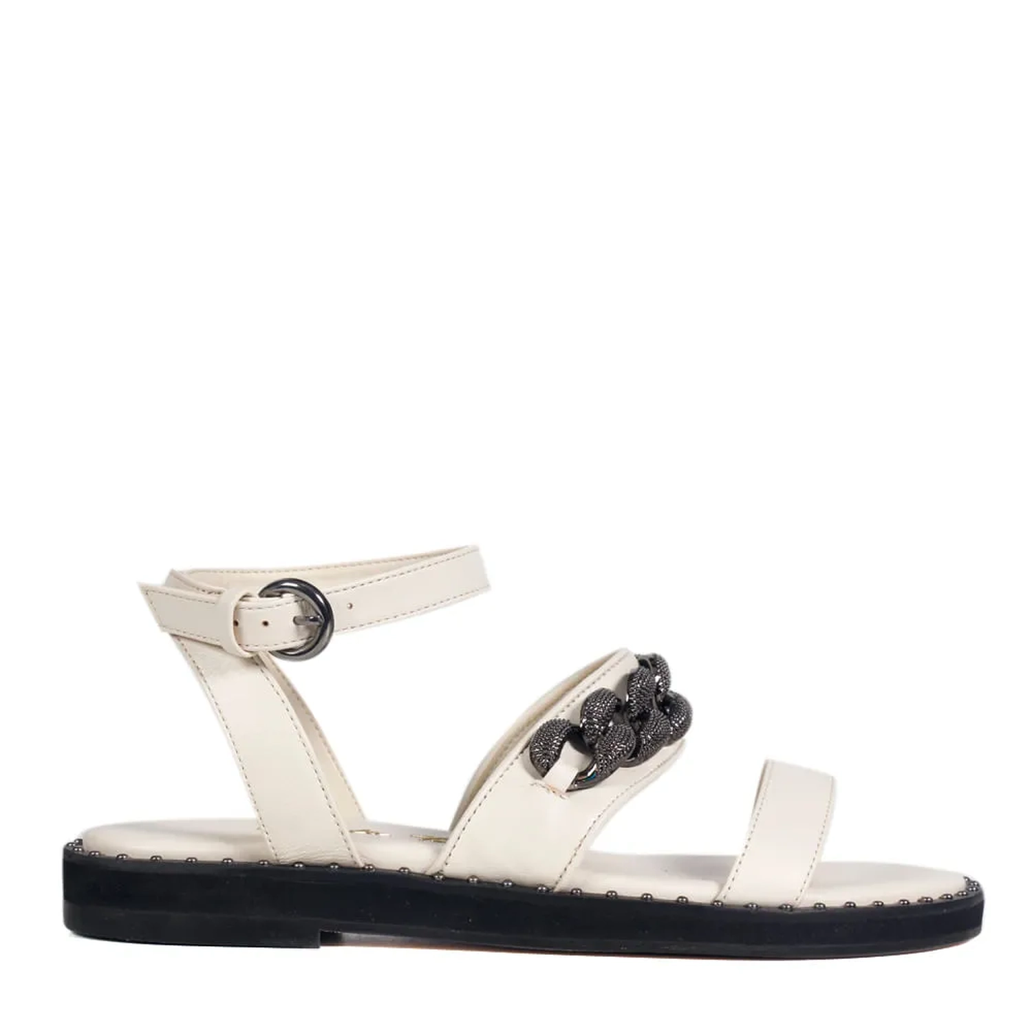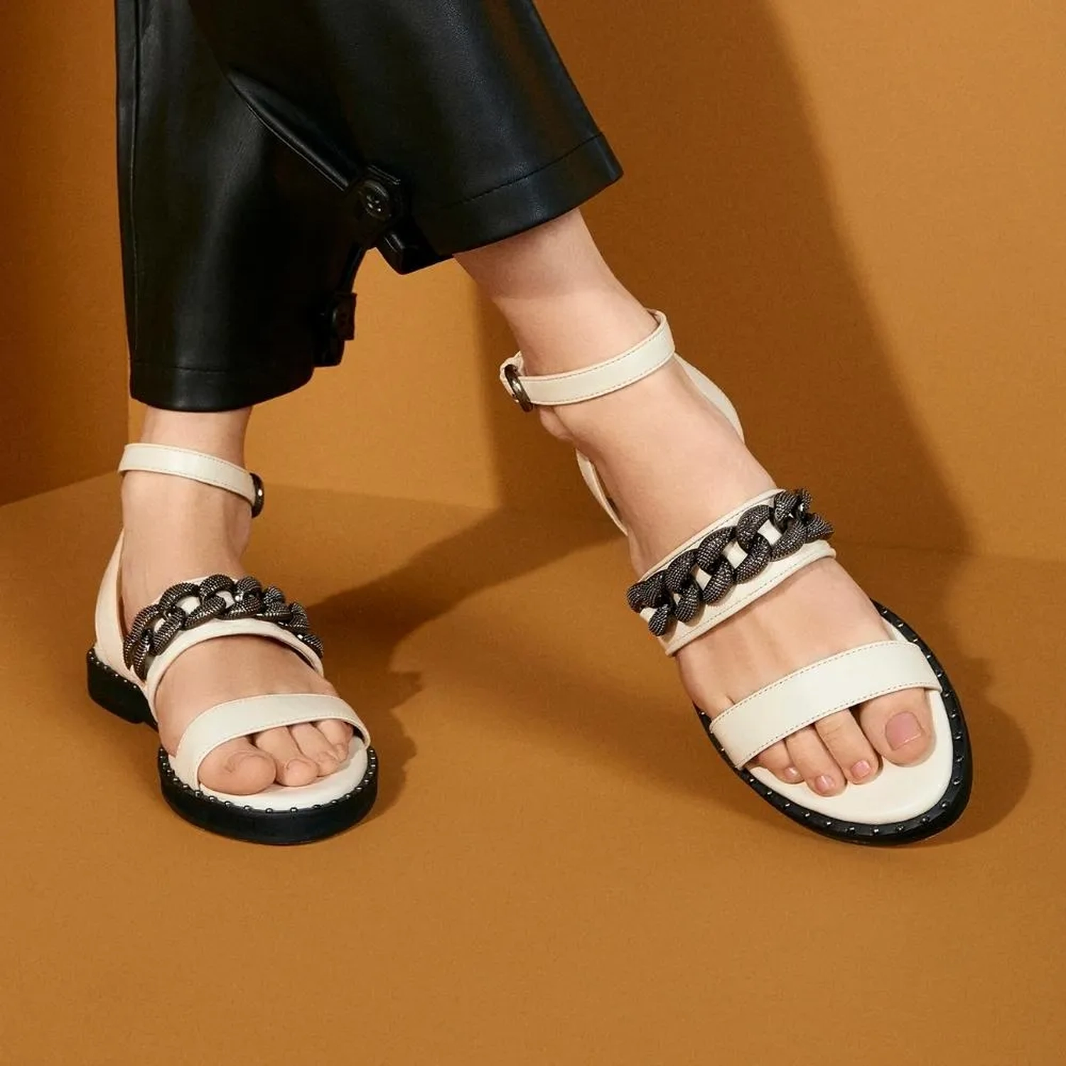 Confeccionada em couro, a Rasteira Lima apresenta uma estética sofisticada e glamorosa. Modelagem em bico redondo e tiras horizontais no cabedal. O diferencial da peça é a corrente estilizada e a vira com rebites metalizados, garantindo identidade e estilo ao modelo. O fechamento por fivela arremata a rasteira.