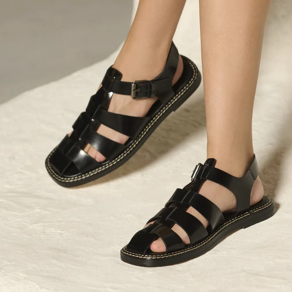 A Rasteira Maju é confeccionada em couro box, reconhecido por seu acabamento liso e brilhante. O modelo apresenta tiras largas de couro entrelaçadas, criando uma estrutura ventilada e elegante, com frente fechada que cobre os dedos, proporcionando maior proteção. Para um ajuste perfeito e confortável, conta com fechamento por fivela lateral. O solado combina uma camada de EVA, que oferece leveza e altura, com a sola de couro, garantindo resistência, durabilidade e excelente aderência ao caminhar.