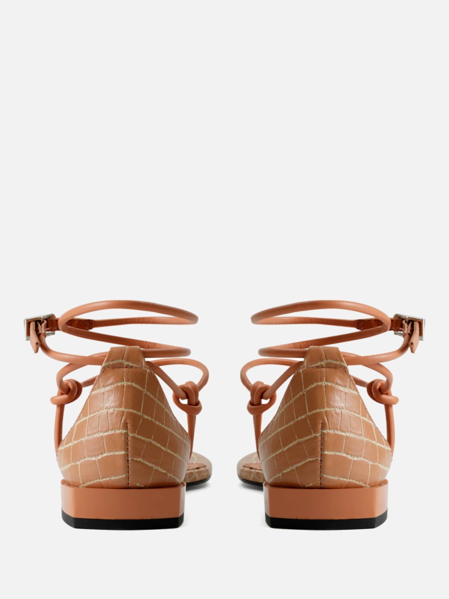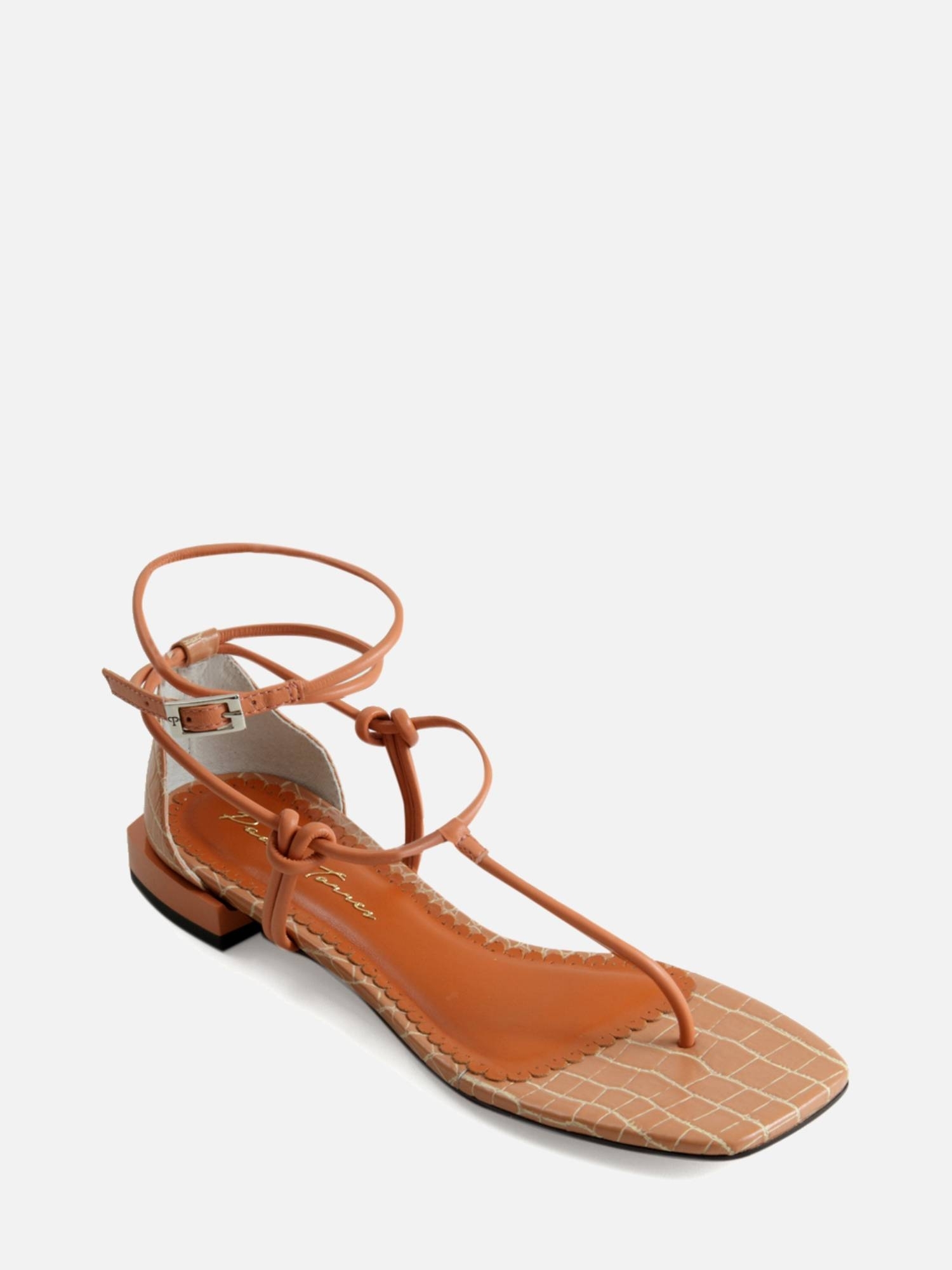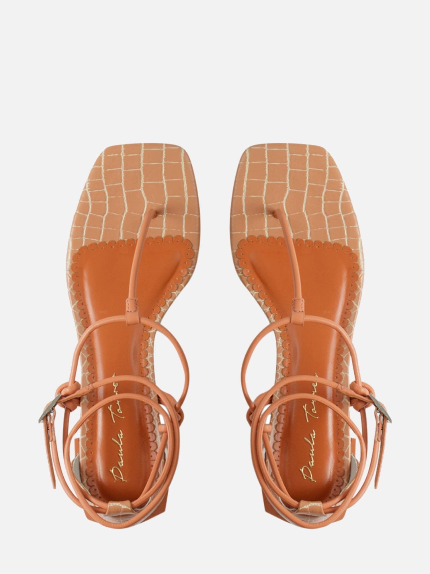 A Rasteira Mia é confeccionada em couro. Modelagem em bico e salto quadrado, que combinam com a estampa mini lezard da palmilha. Além dos detalhes quadrados, a calcanheira e a tira enrolada no tornozelo, tornam o modelo super charmoso. O cabedal é formado por tiras finas de couro, unidas por nós, ressaltando o trabalho handmade da marca. Fechamento por fivela no tornozelo. Modelo exclusivo Paula Torres, aposte para este Verão!