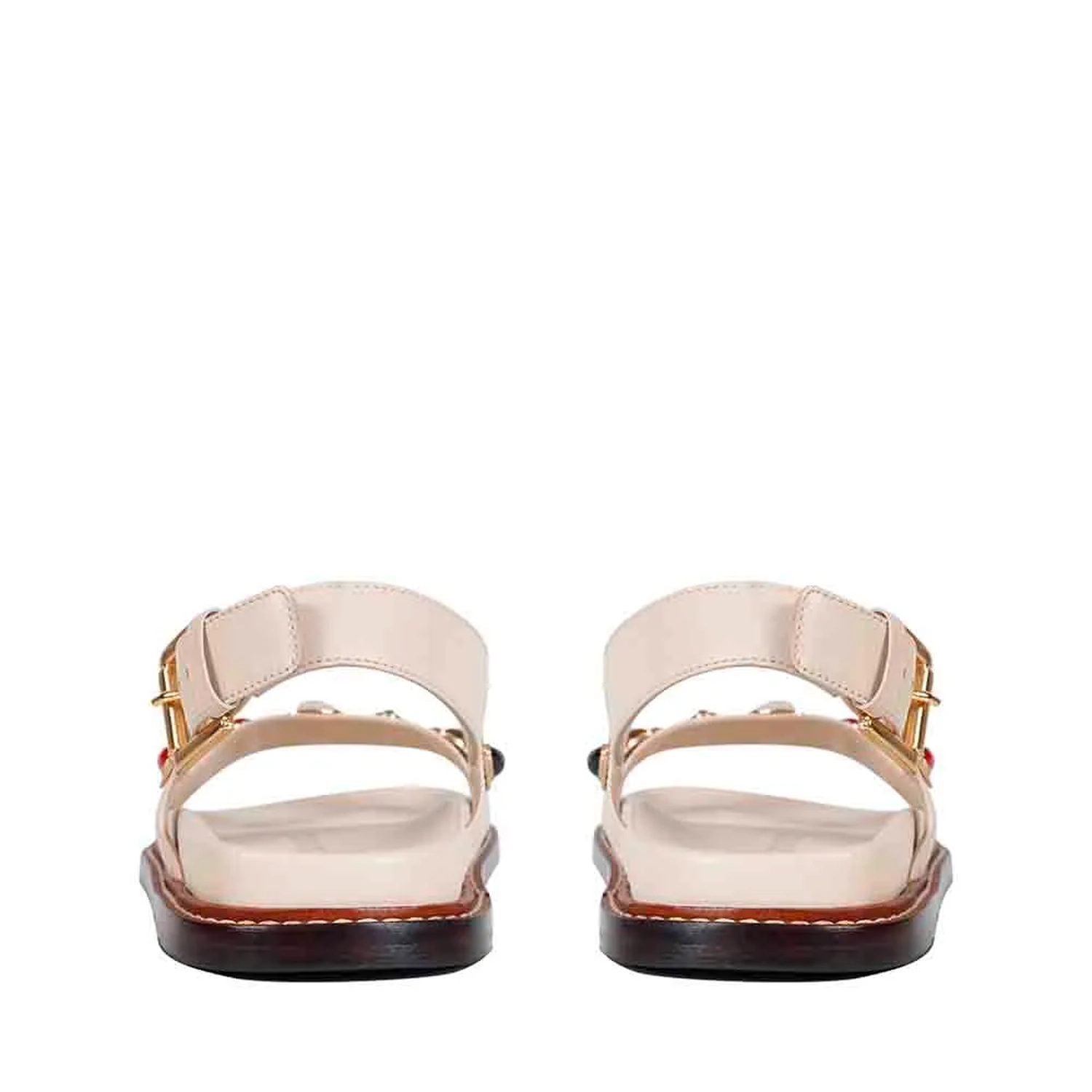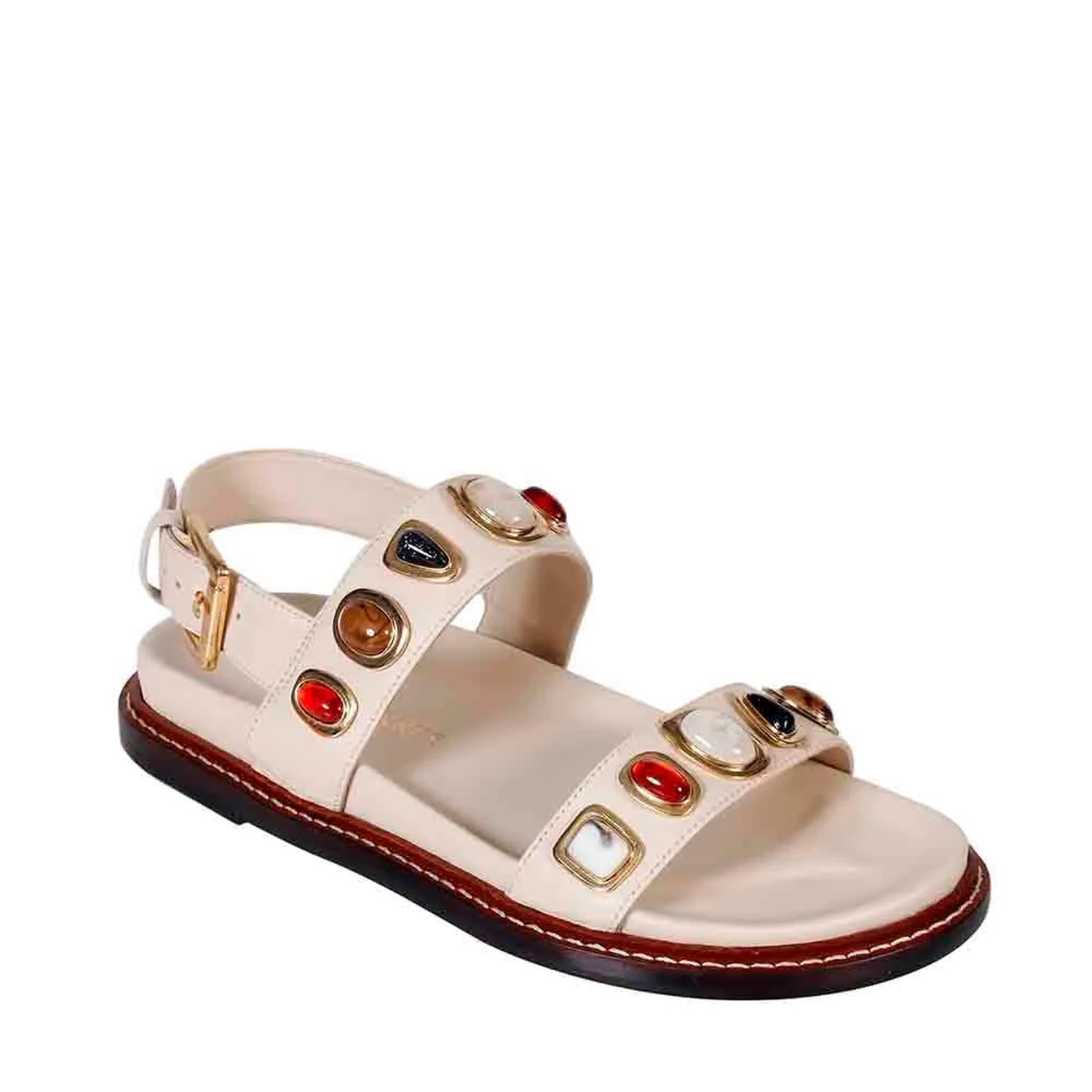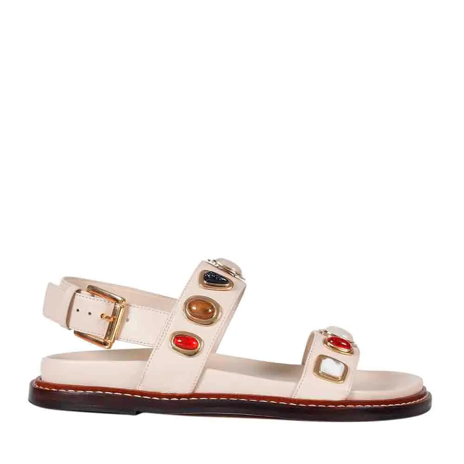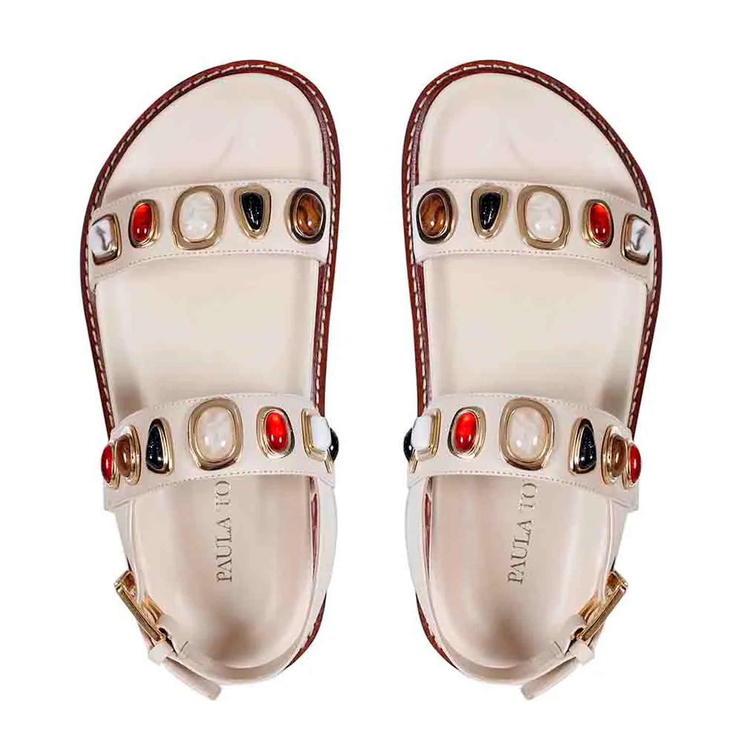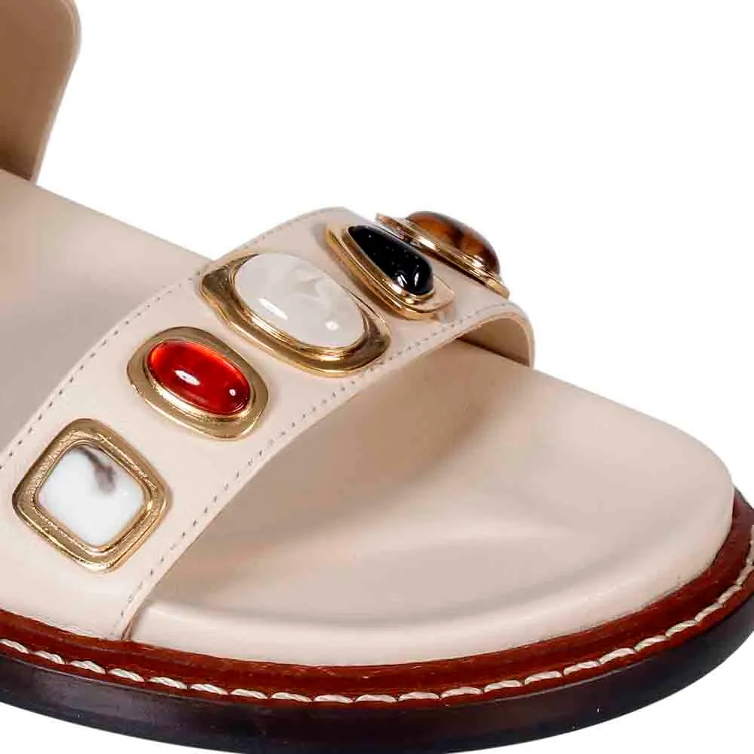 A Rasteira Millena é produzida em couro. O modelo apresenta bico arredondado e palmilha anatômica para conforto. Duas tiras largas com a aplicação de pedras resinadas em formatos orgânicos sobre metais com banho dourado. Fechamento por tira no calcanhar com fivela lateral para ajuste. Vira em couro com pesponto contrastante e solado também em couro proporcionando durabilidade e sofisticação ao sapato.