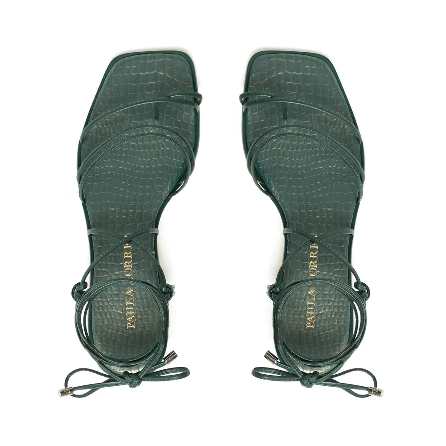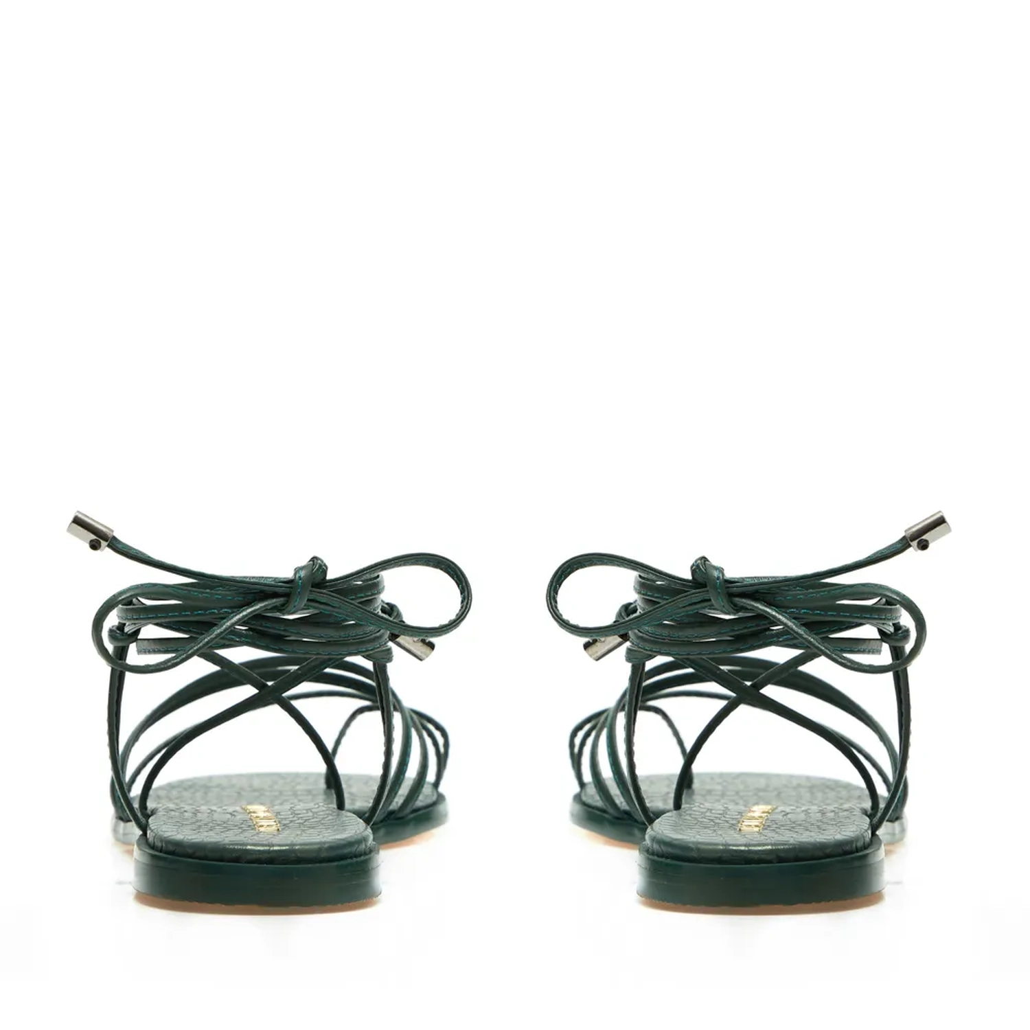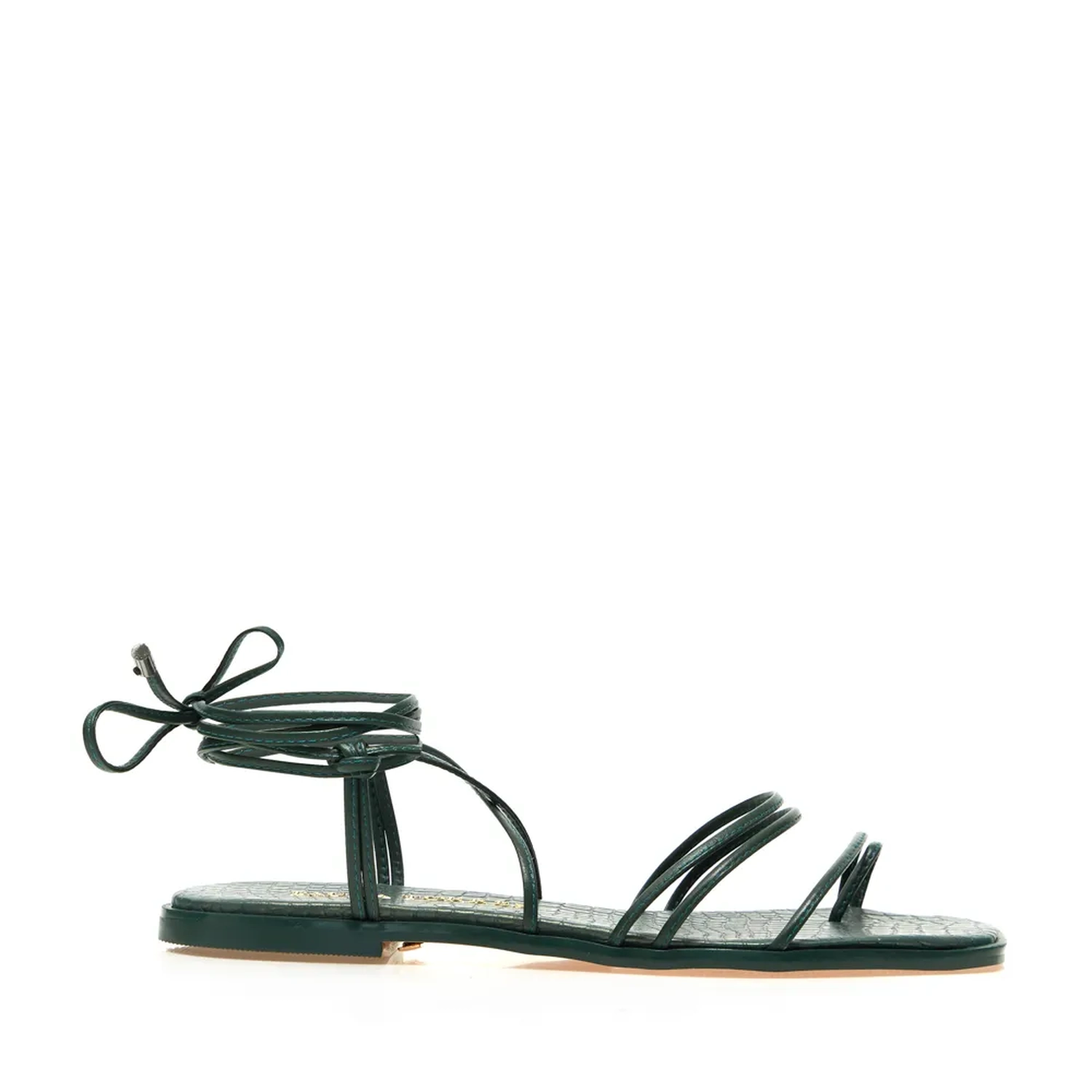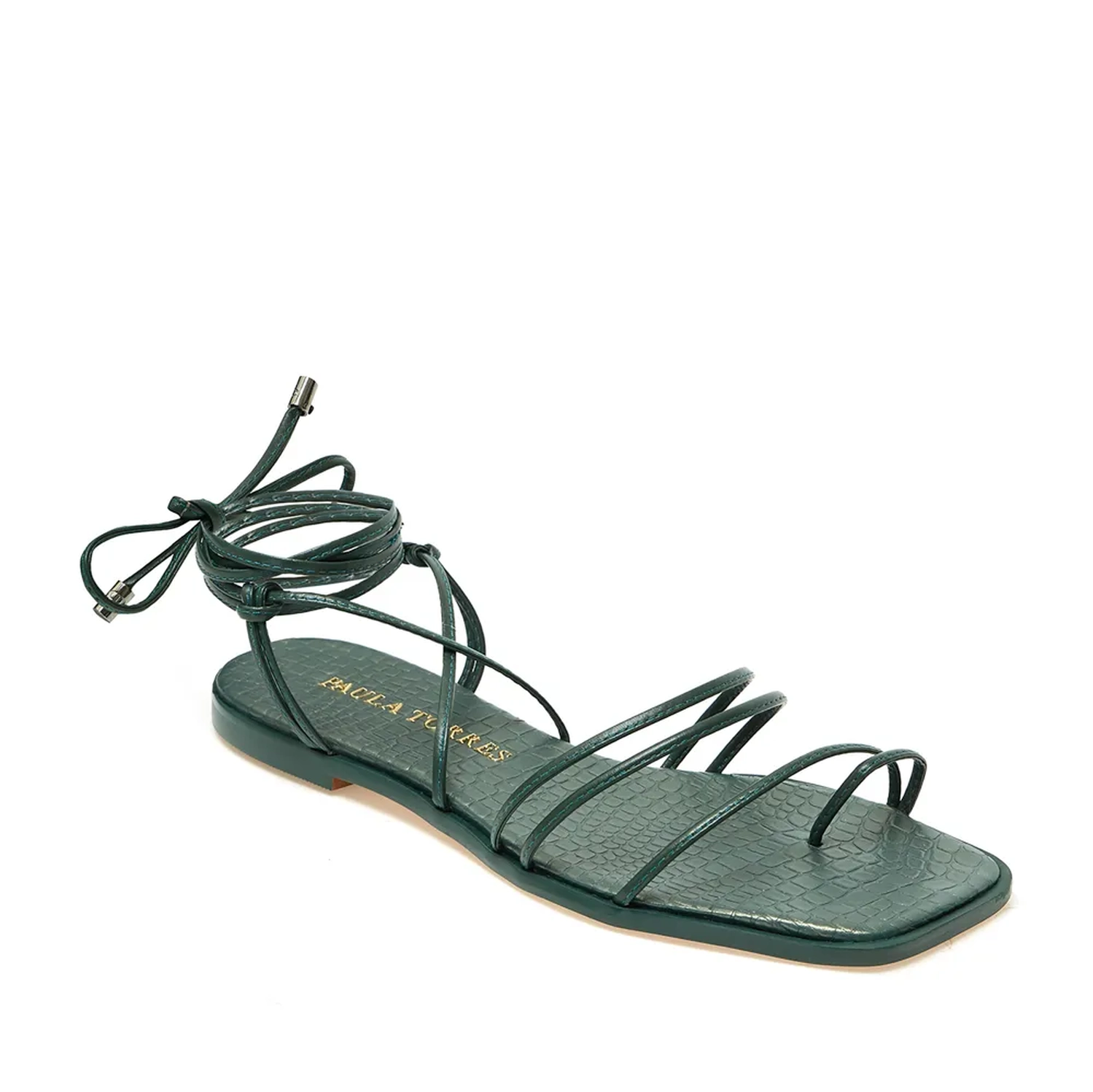 A Rasteira Munique é confeccionada em couro. Com tiras finas em couro na construção do cabedal e palmilha em couro perolado com estampa croco e vira sobressalente que acompanha a mesma cor do couro. A amarração - item que esteve presente em diversos desfile da ultima temporada - é o ponto de destaque da flat.