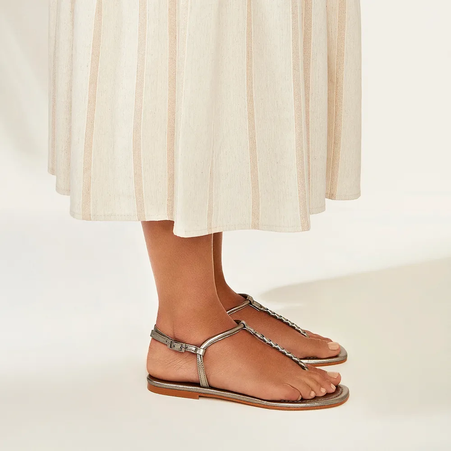A Rasteira Nina é confeccionada em couro. Modelagem em bico redondo e cabedal trançado. Fechamento lateral por fivela. Modelo prático e confortável, adicionando um charme unicamente Paula Torres ao look!