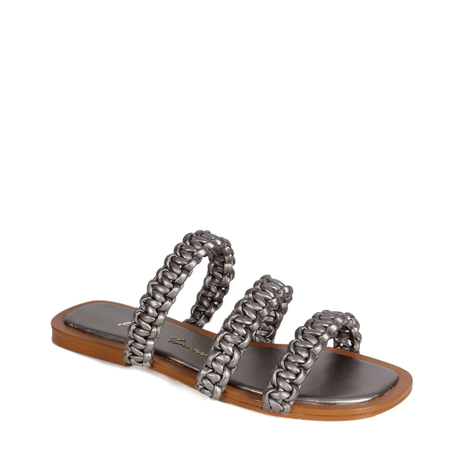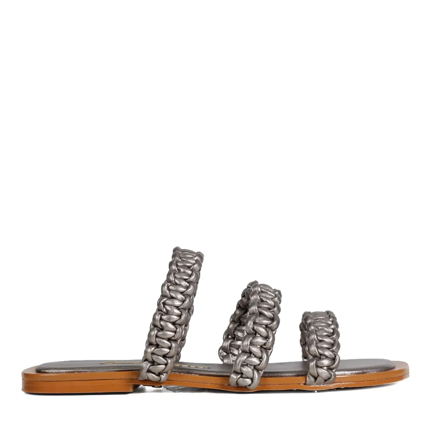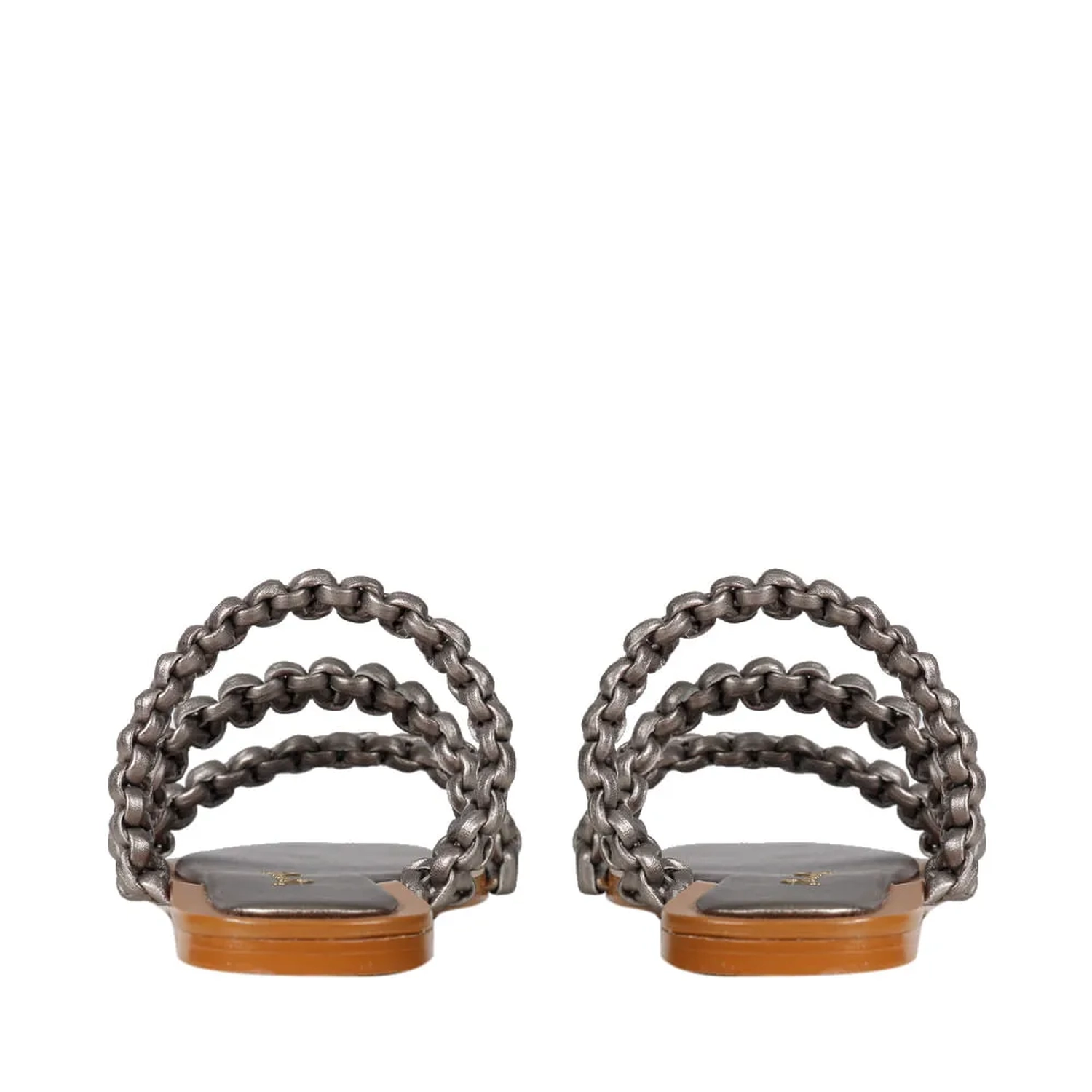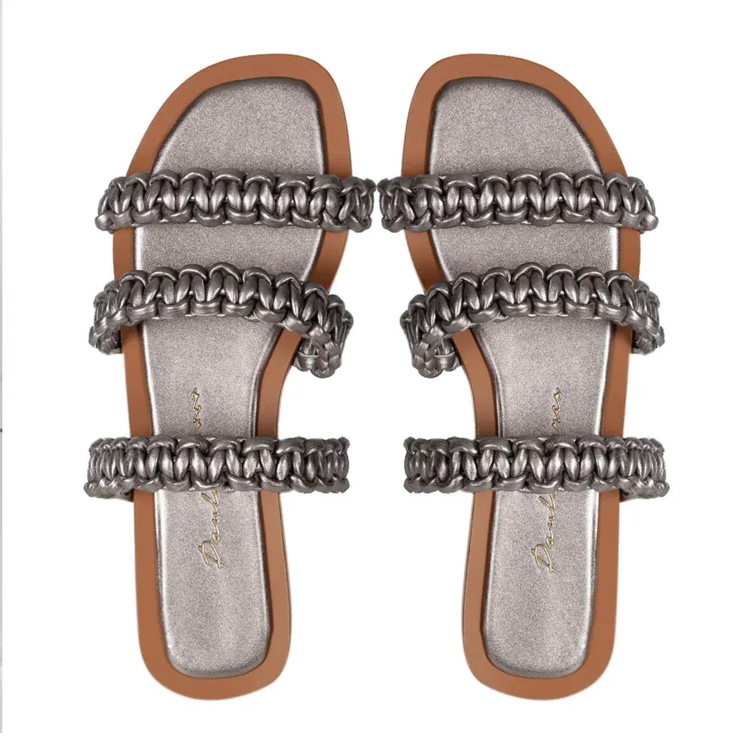 A Rasteira Paola é confeccionada em couro. Modelagem em bico quadrado com três tiras trabalhadas em macramê. O diferencial é a junção do macramê com o couro metalizado, criando uma estética unicamente Paula Torres.