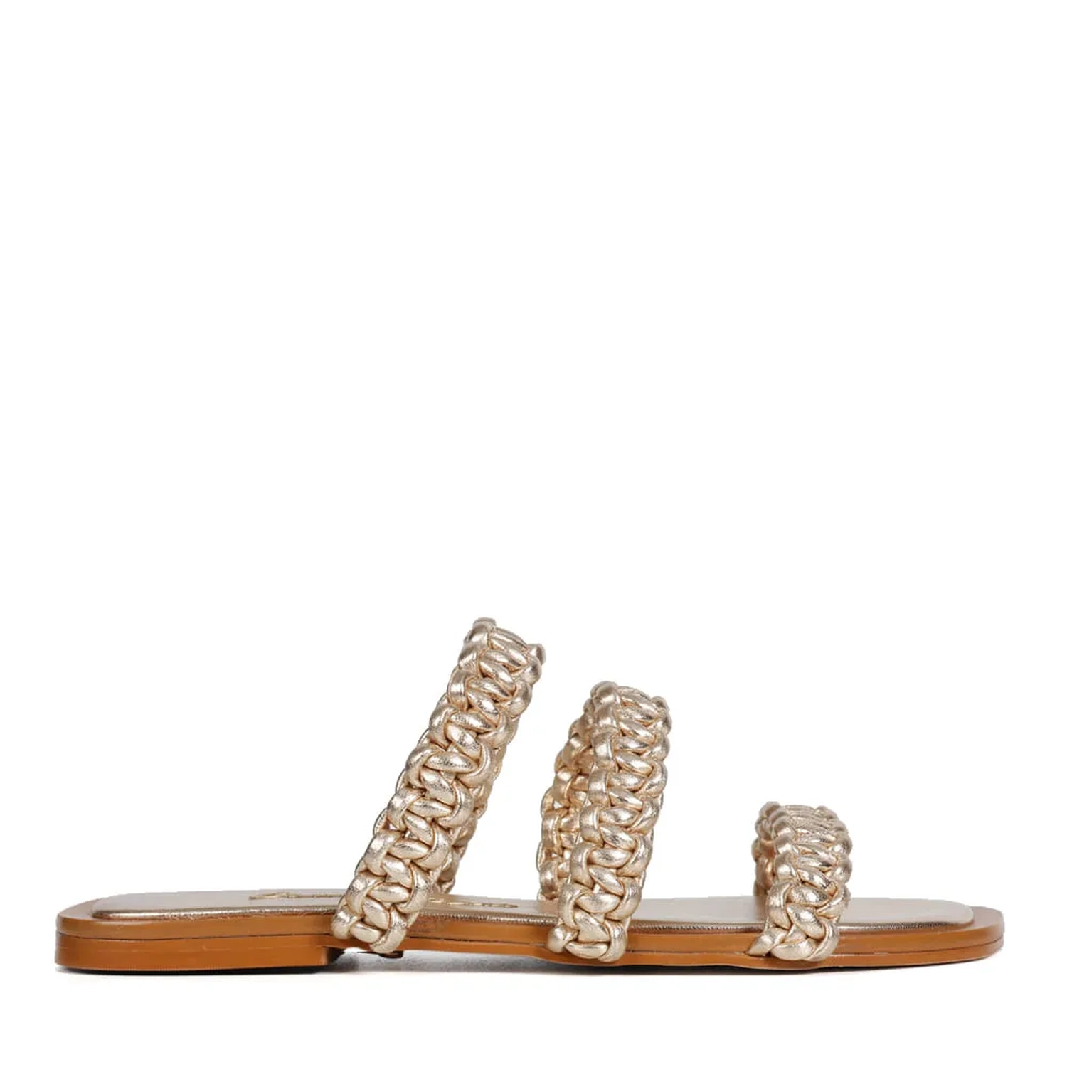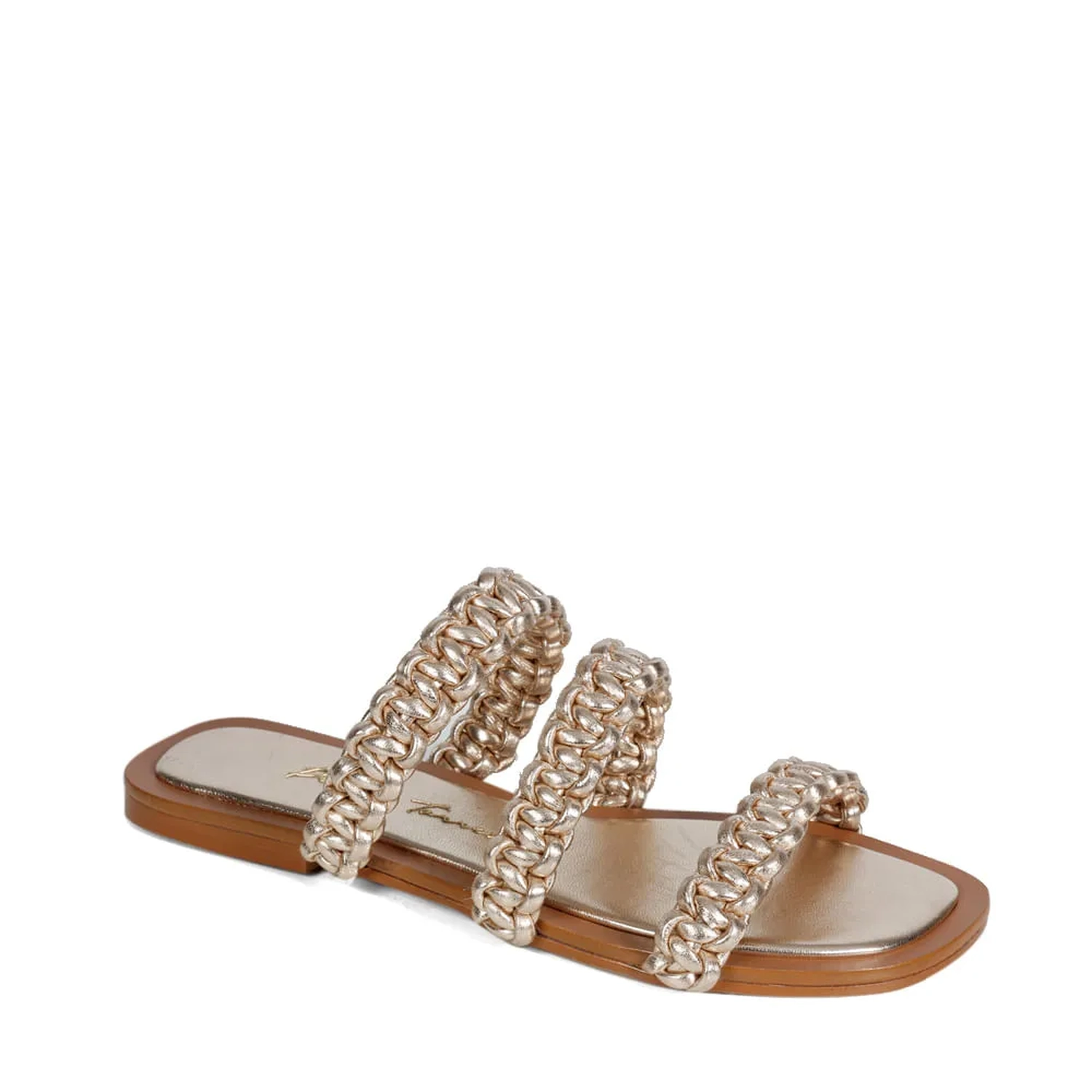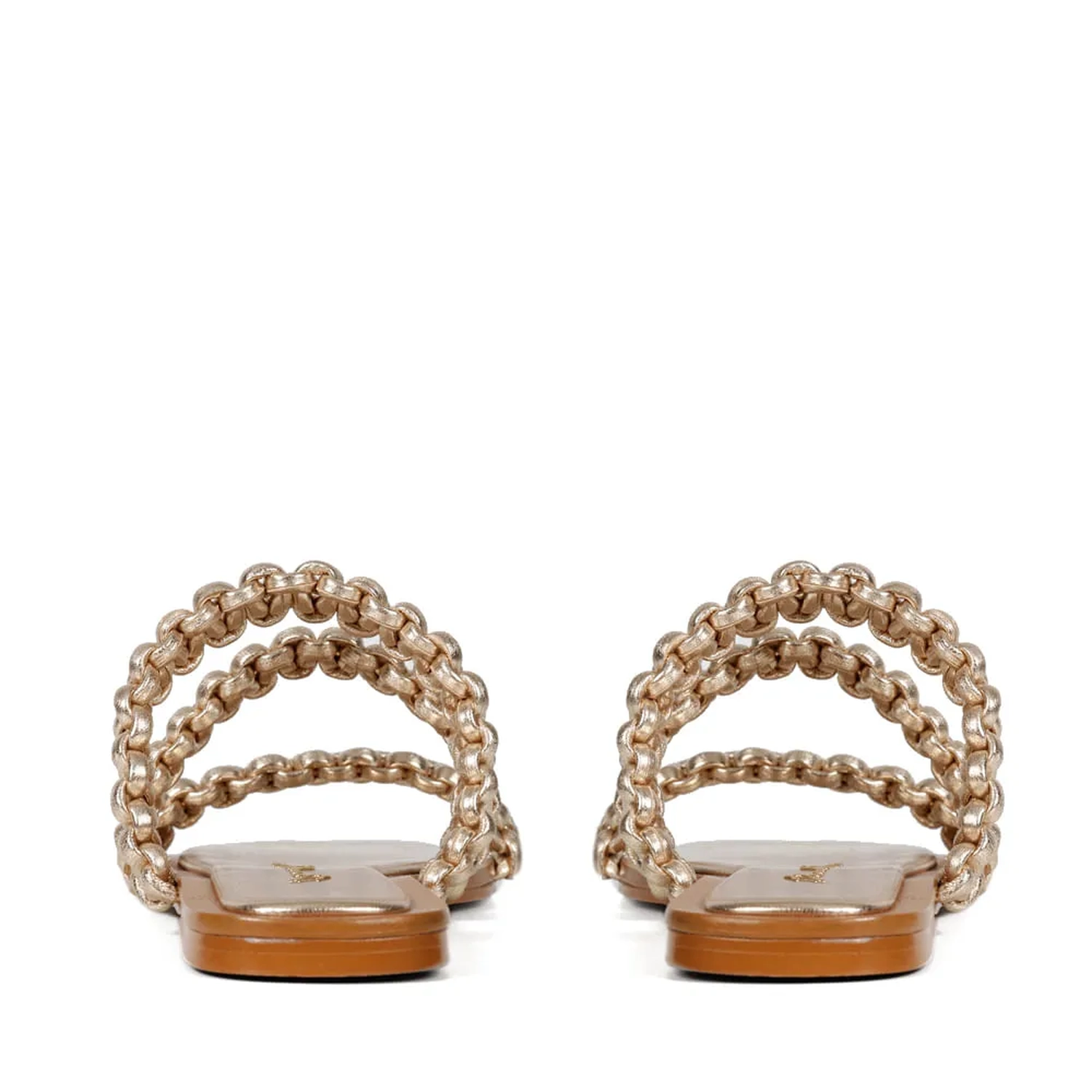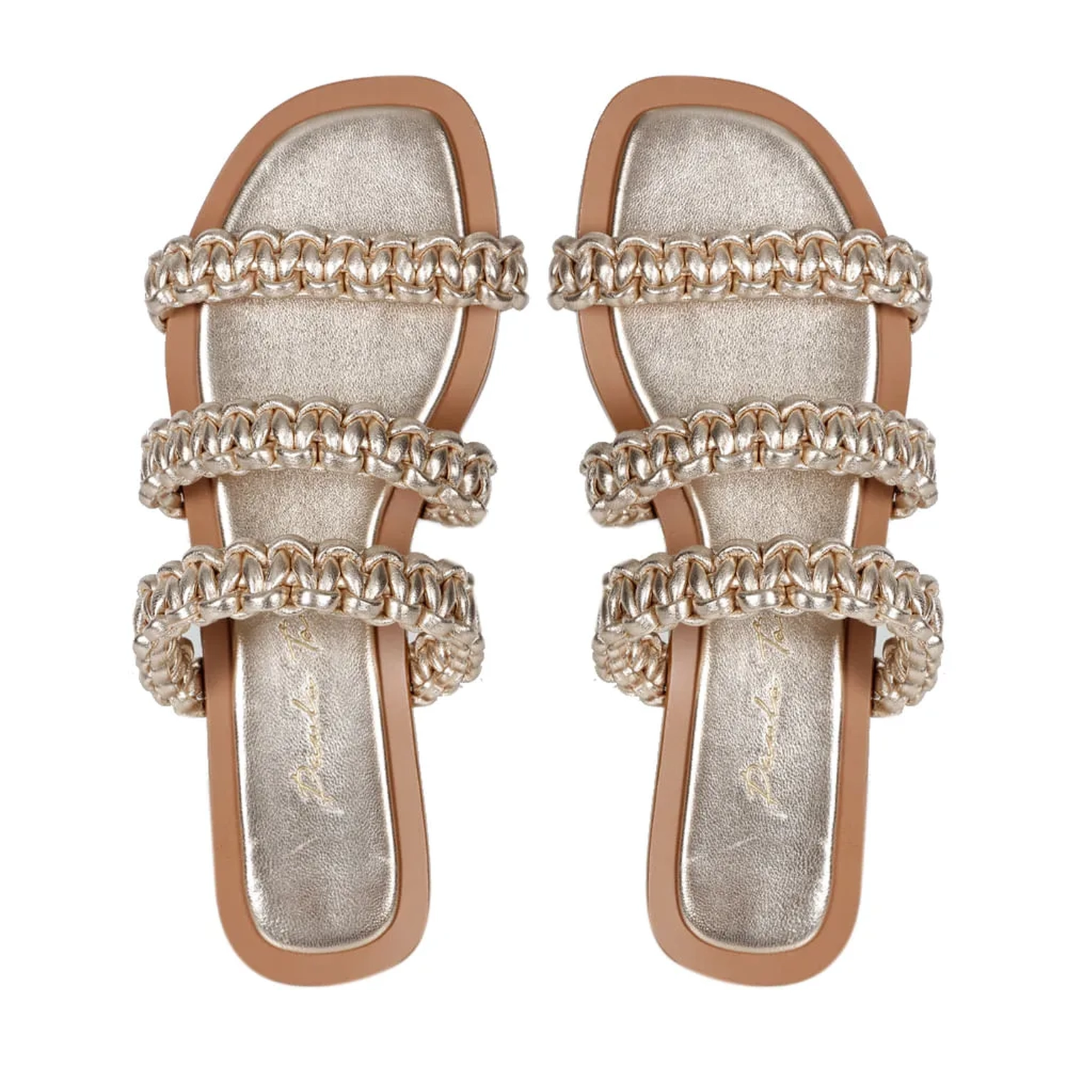 A Rasteira Paola é confeccionada em couro. Modelagem em bico quadrado com três tiras trabalhadas em macramê. O diferencial é a junção do macramê com o couro metalizado, criando uma estética unicamente Paula Torres.