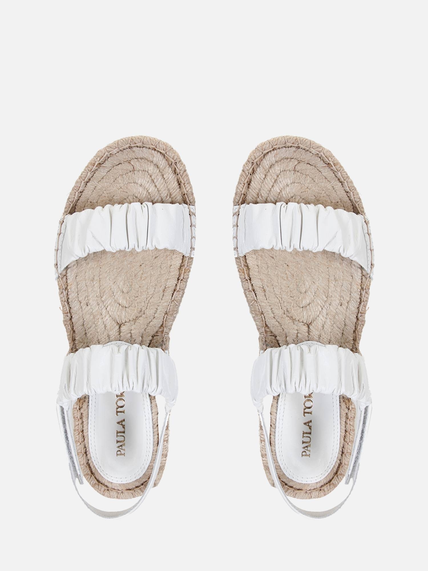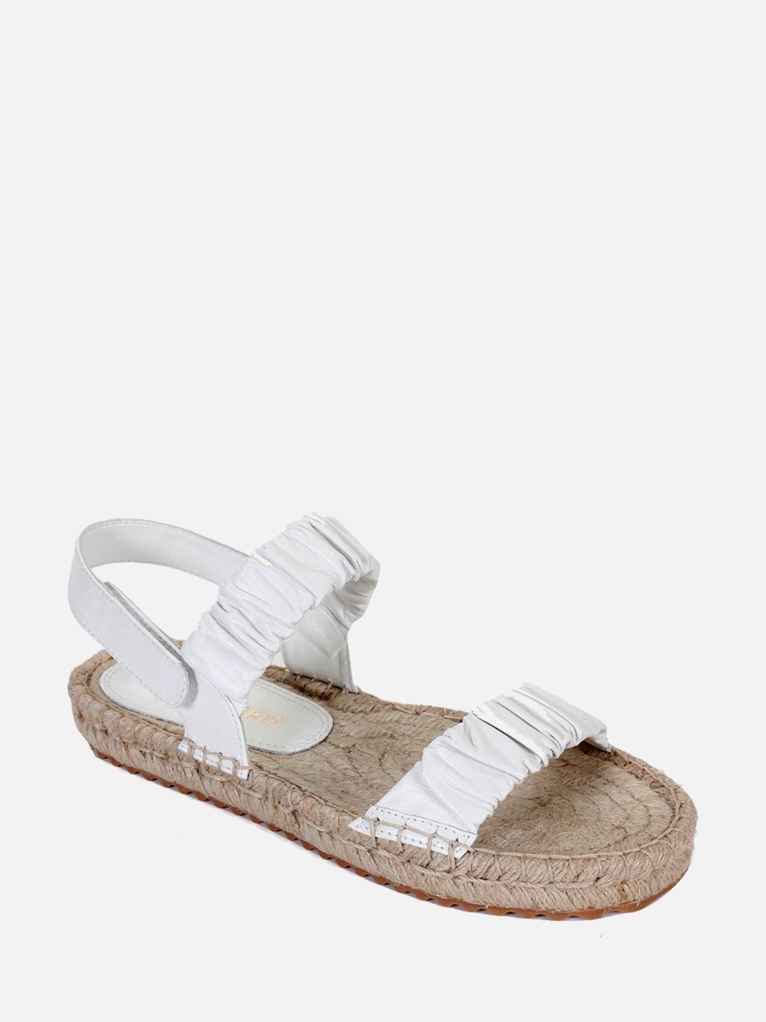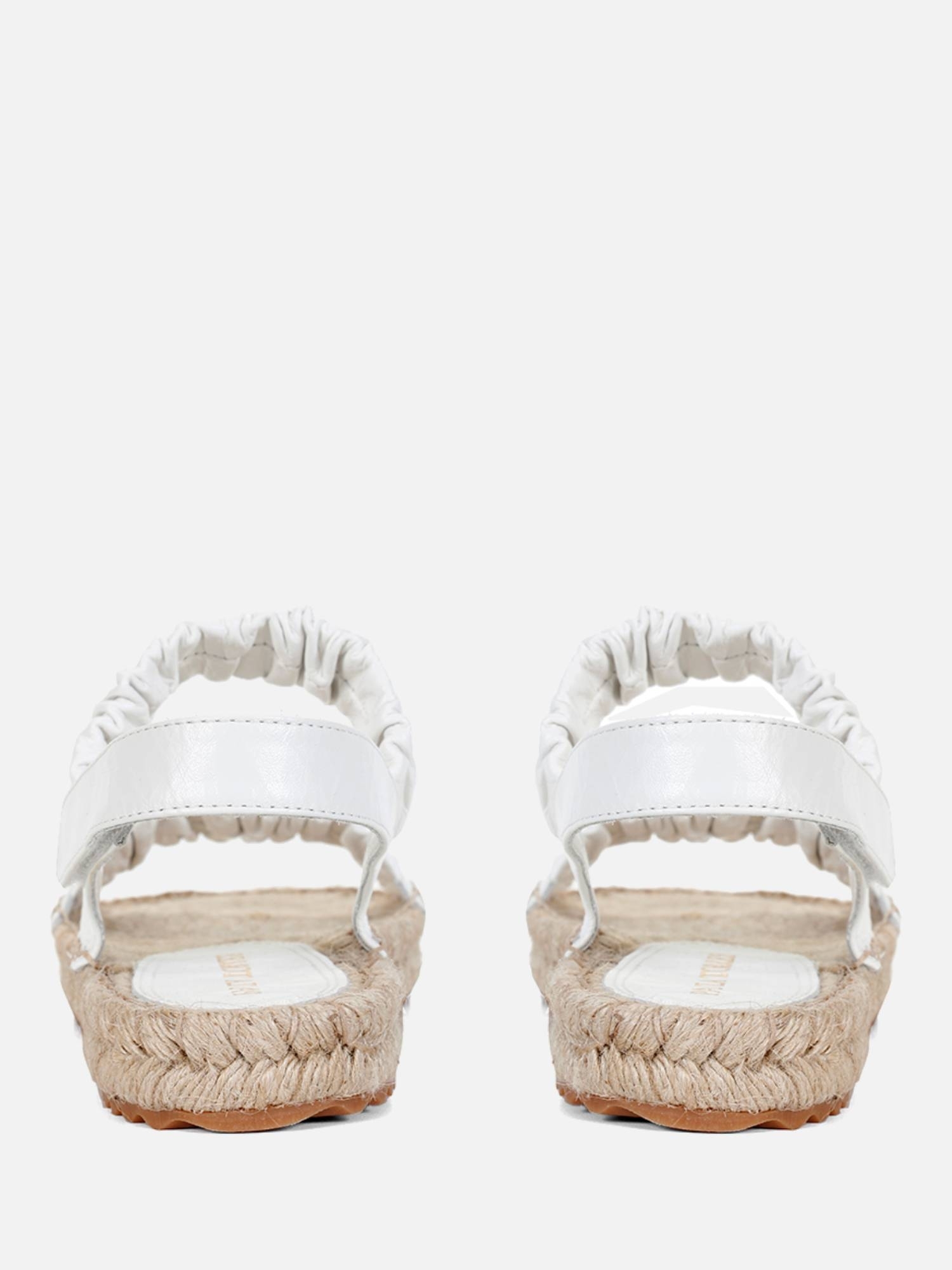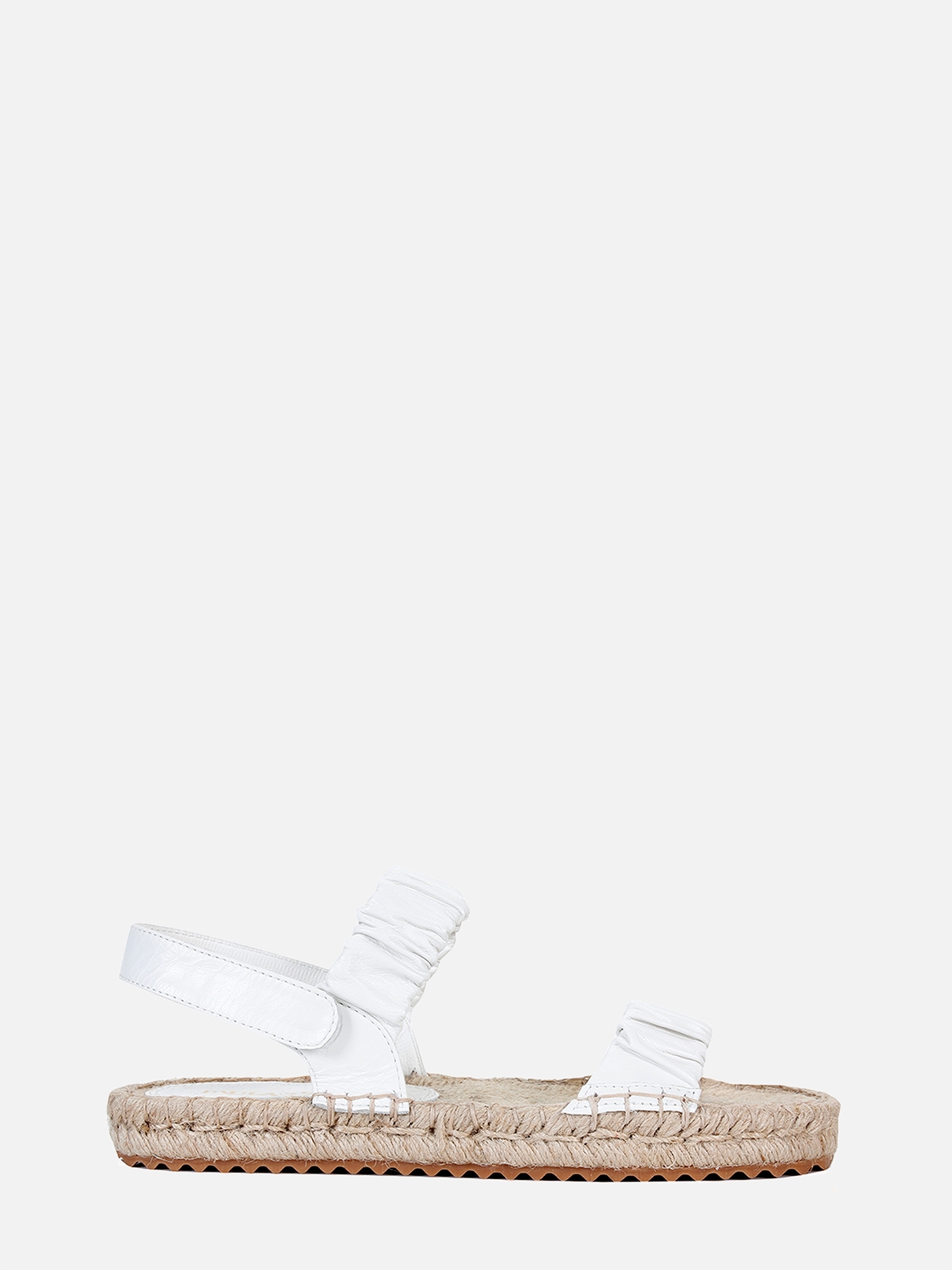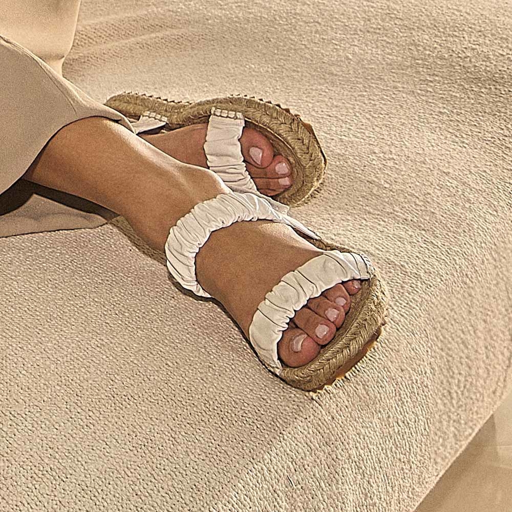 A Rasteira Serena Corda é confeccionada em couro. A peça possui duas tiras largas na parte superior, com couro franzido, e fechamento por velcro na tira traseira. A palmilha é inteiramente feita de corda, moldando-se ao pé conforme o uso. O solado tratorado em borracha garante flexibilidade e conforto.