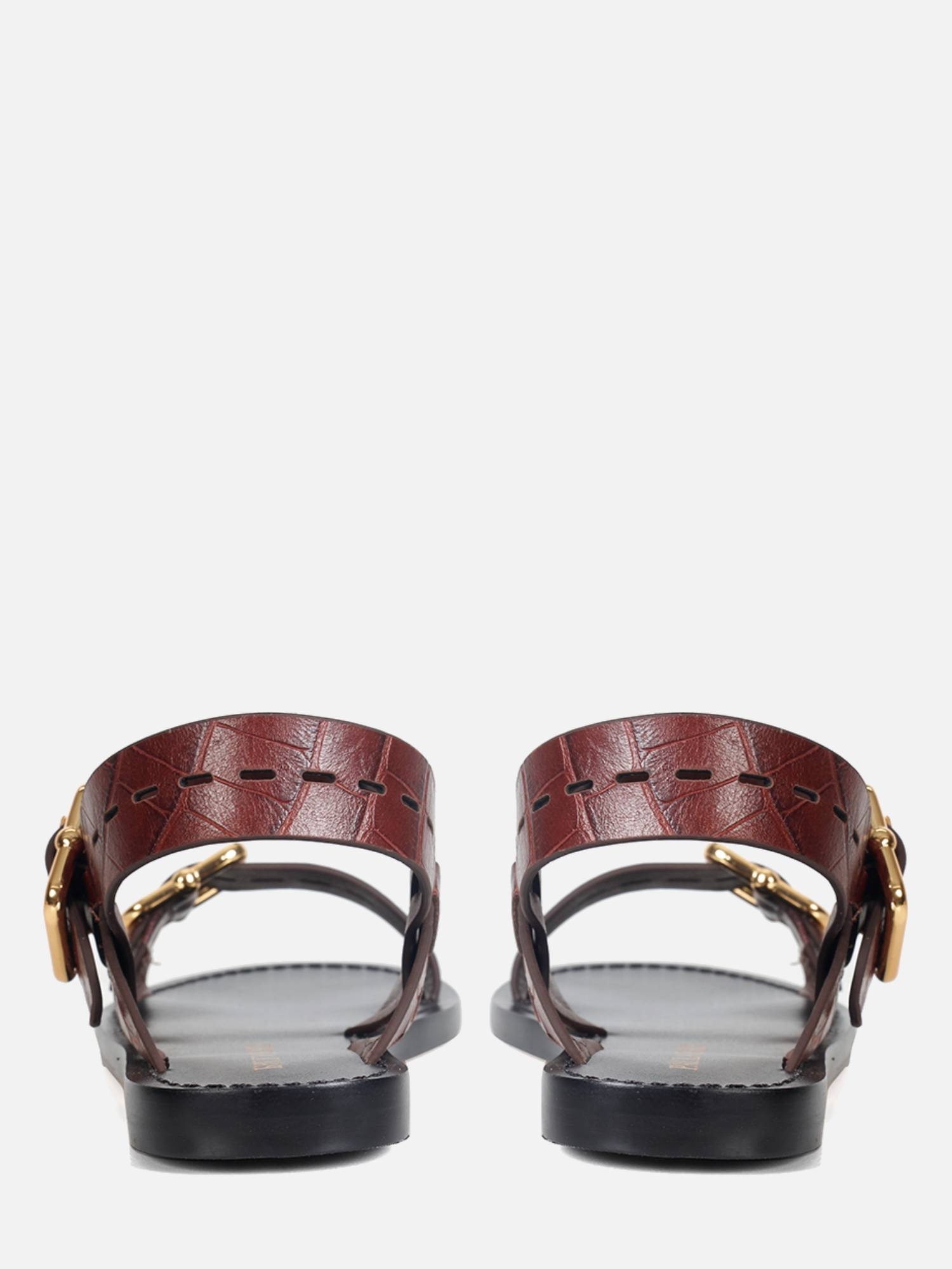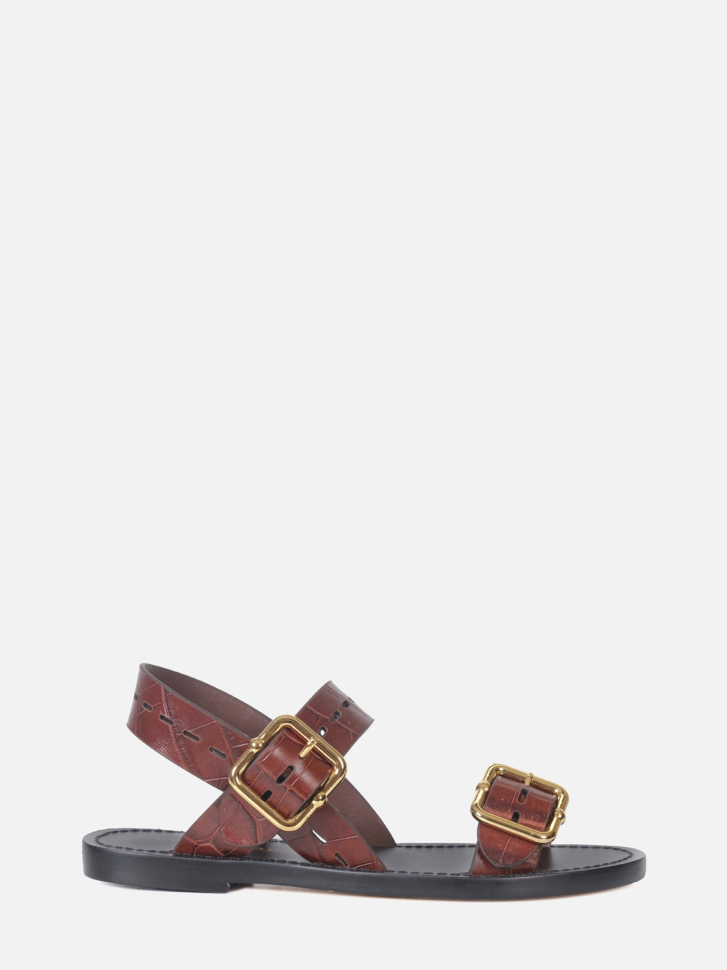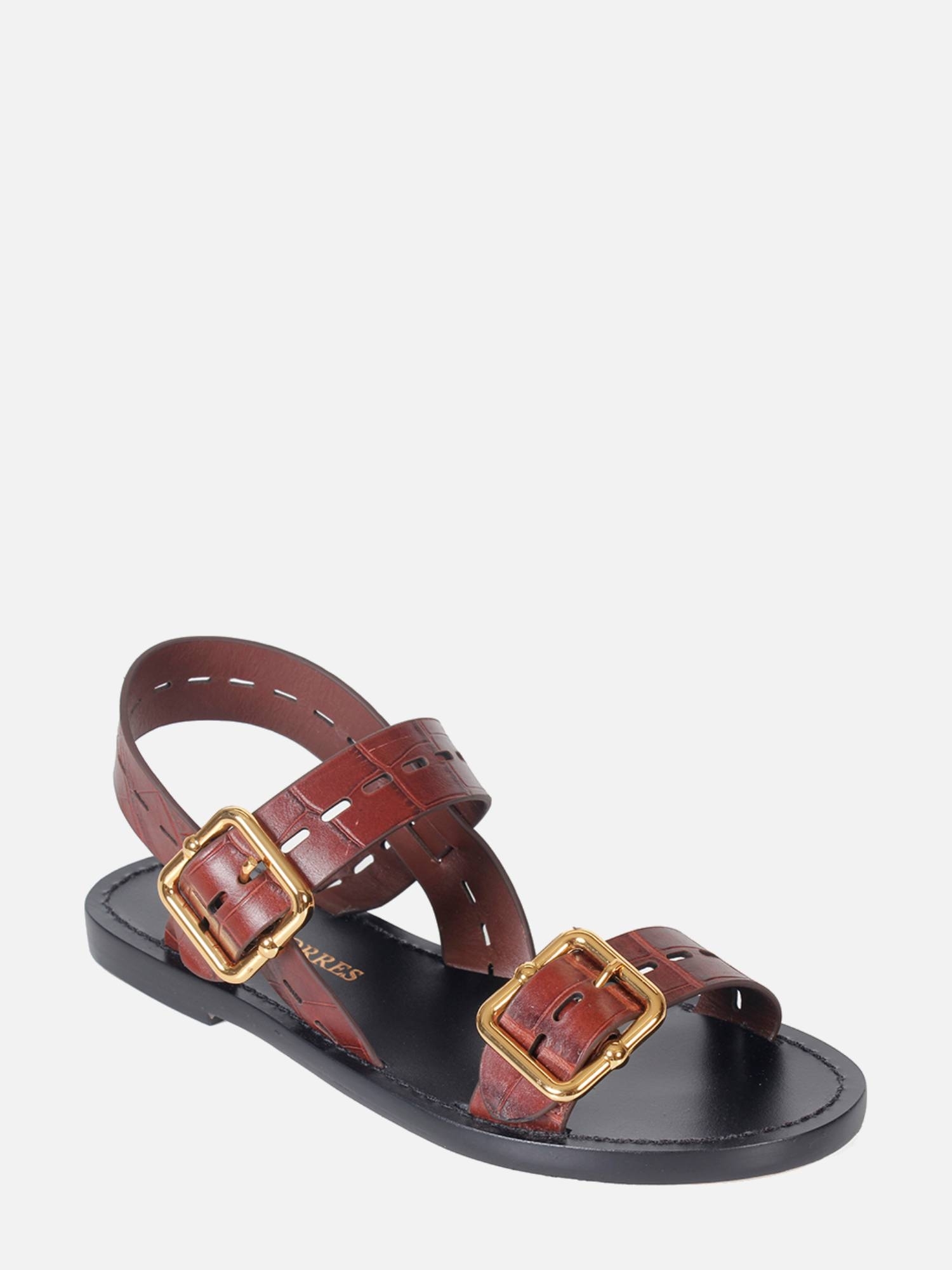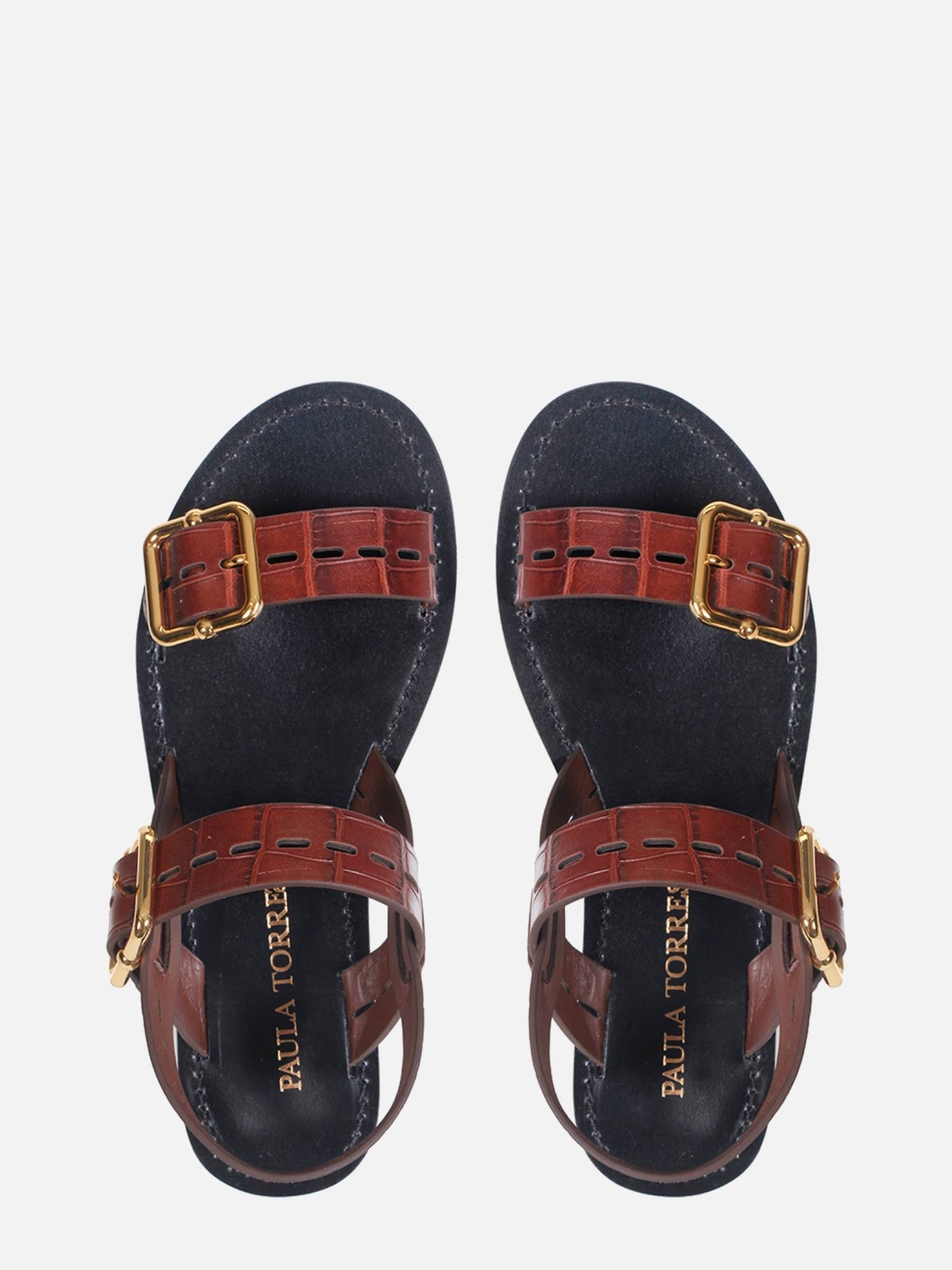A Rasteira Suri é confeccionada em couro com textura croco. O modelo apresenta duas tiras largas, adornadas por uma elegante fivela metalizada dourada na lateral para ajuste. A peça conta com palmilha em recouro com pesponto na cor e solado em couro, proporcionando conforto e durabilidade.