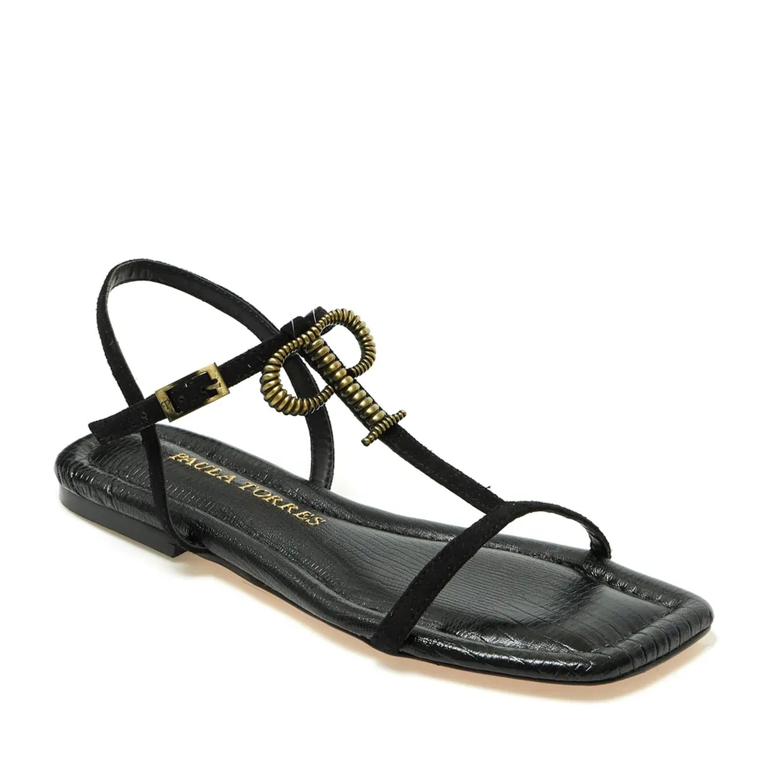 A Rasteira Torres é ideal para quem busca conforto. Com a palmilha acolchoada em couro e bico quadrado, o modelo possui tiras finas e o fechamento é feito por fivela lateral ajustável. Na parte superiror o monograma em metal envelhecido arremata a peça com muito muita sofiticação.
