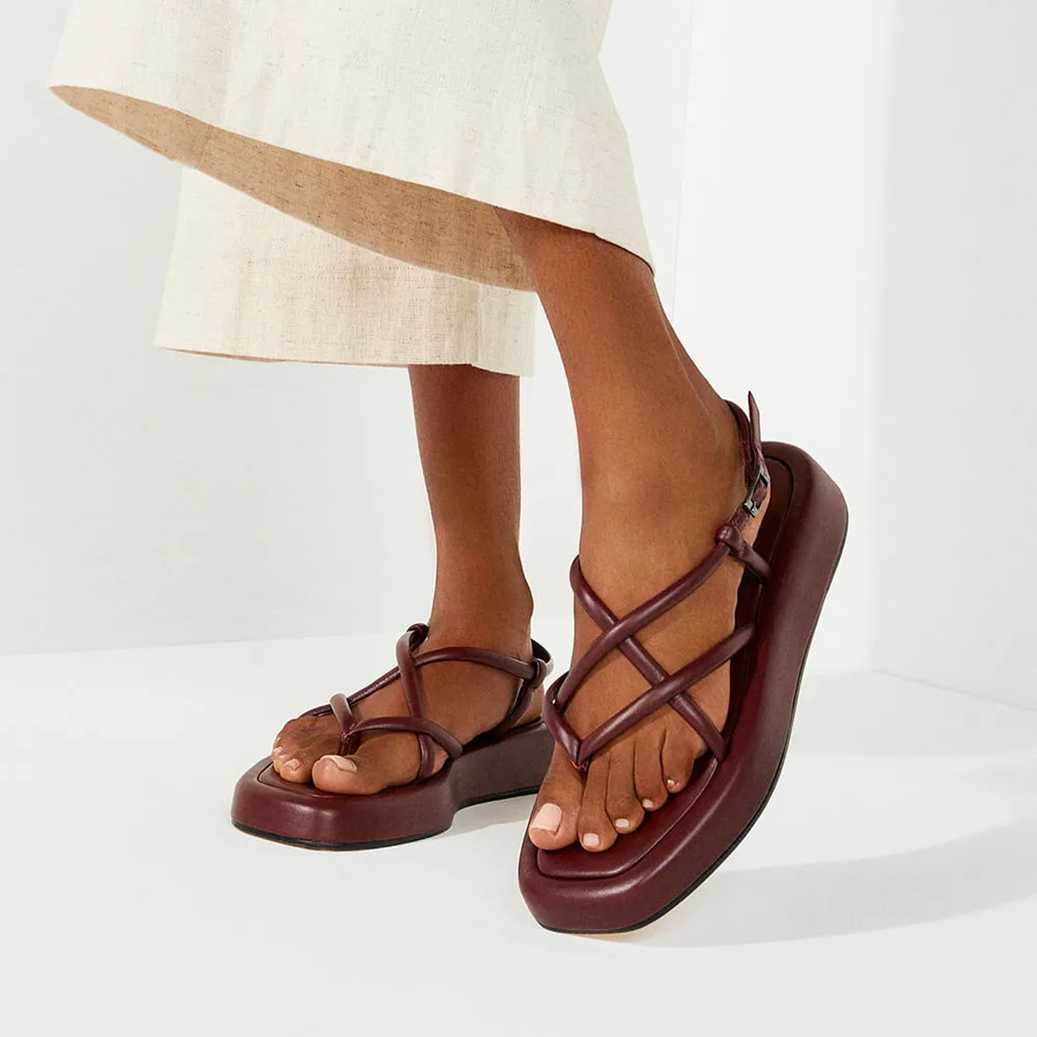 A Rasteira Viena é confeccionado em couro e apresenta uma modelagem em bico quadrado levemente arredondado nas vértices. Conta com tiras finas de couro no cabedal e fechamento lateral por fivela, que são o arremate perfeito para tornar o modelo flatform sofisticado e único.