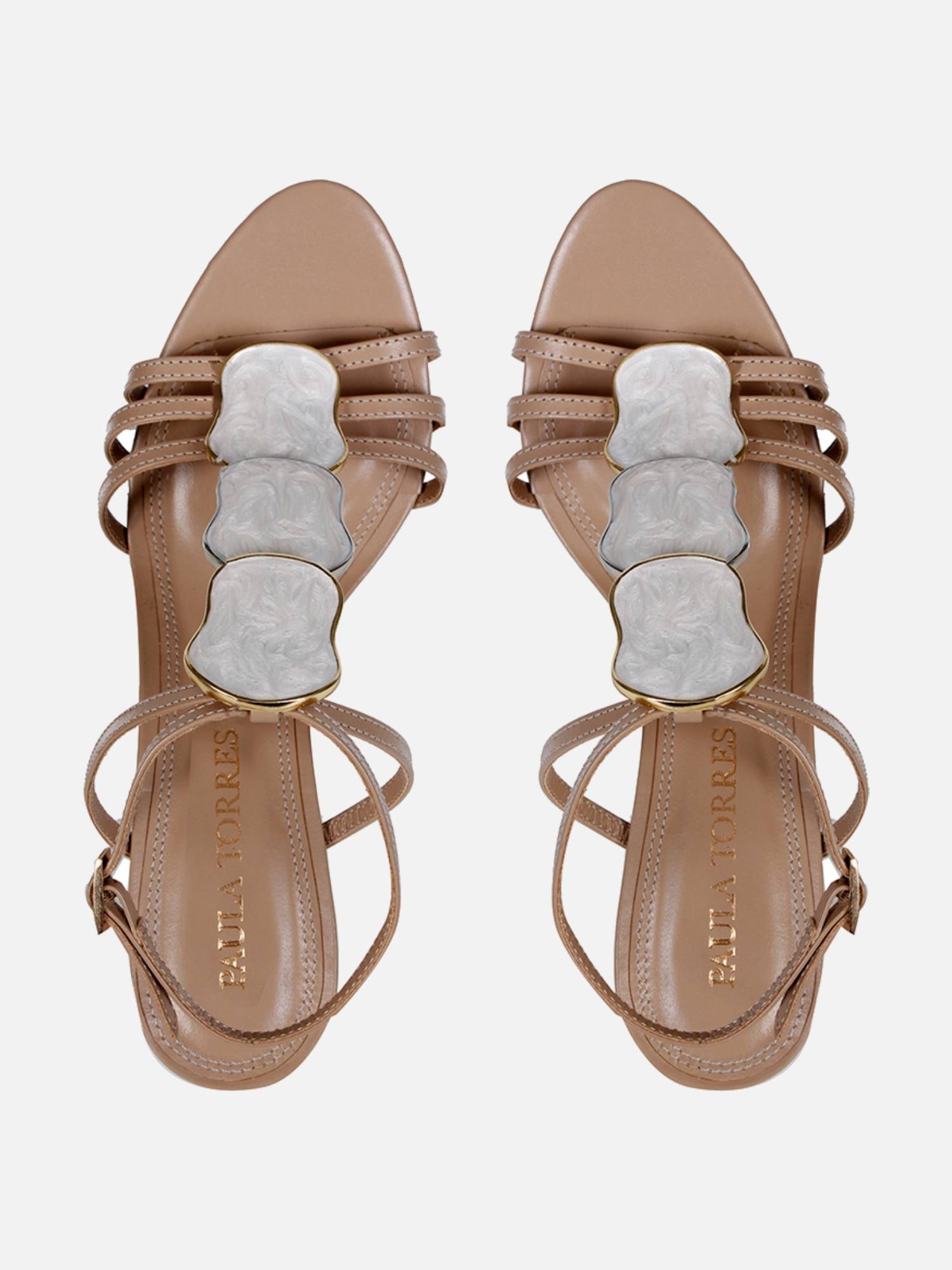 A Sandália Alissa é uma verdadeira obra-prima de elegância e estilo, confeccionada em napa de alta qualidade que proporciona conforto e durabilidade. O bico redondo da sandália oferece um toque clássico e sofisticado, tornando-a uma escolha versátil para uma variedade de ocasiões. O bloco de salto da Sandália Alissa não proporciona apenas altura e equilíbrio, mas também adiciona um toque de modernidade ao seu design. O cabedal é composto por tiras finas em couro, que conferem delicadeza e elegância ao calçado. O destaque fica por conta da peça metálica central, adornada com três madrepérolas deslumbrantes, que capturam a luz de maneira única e brilham com um brilho sutil.