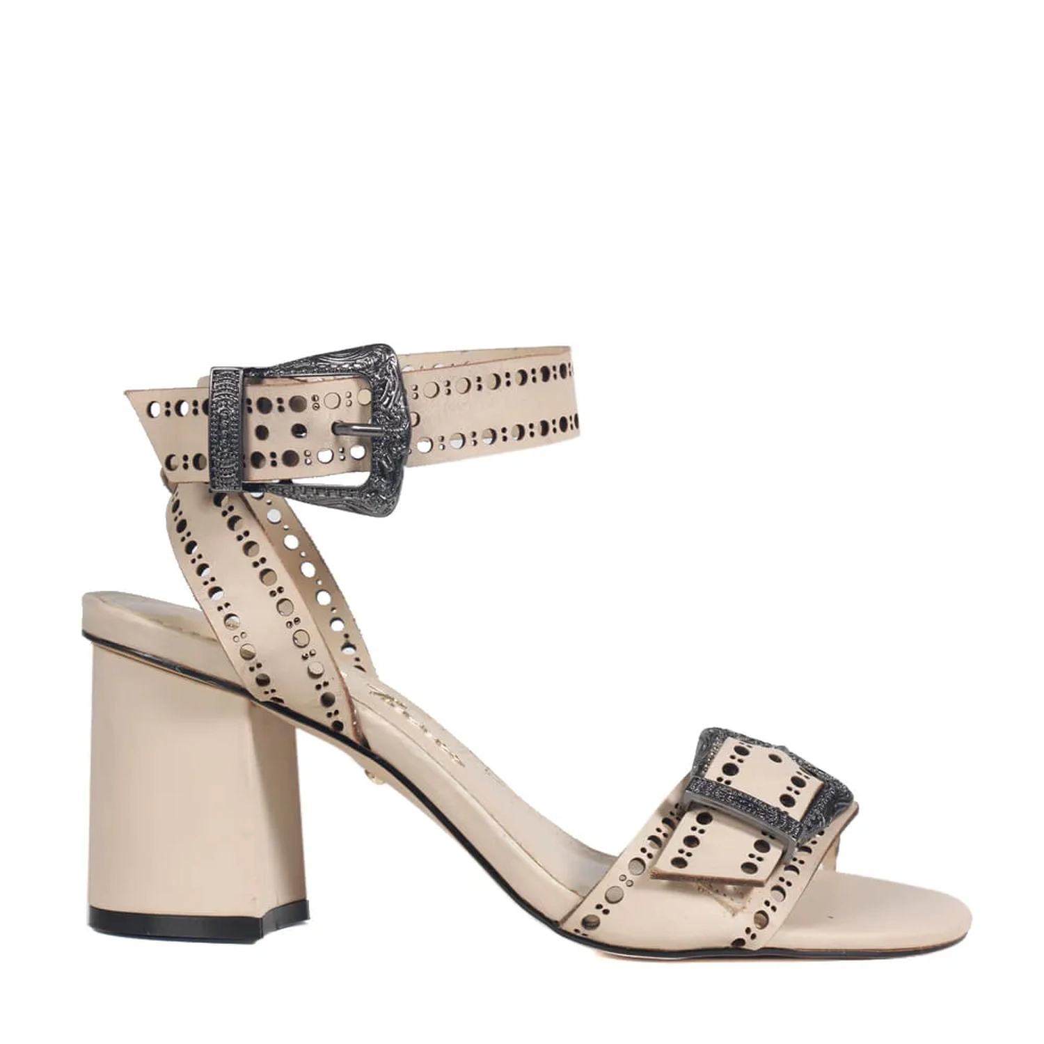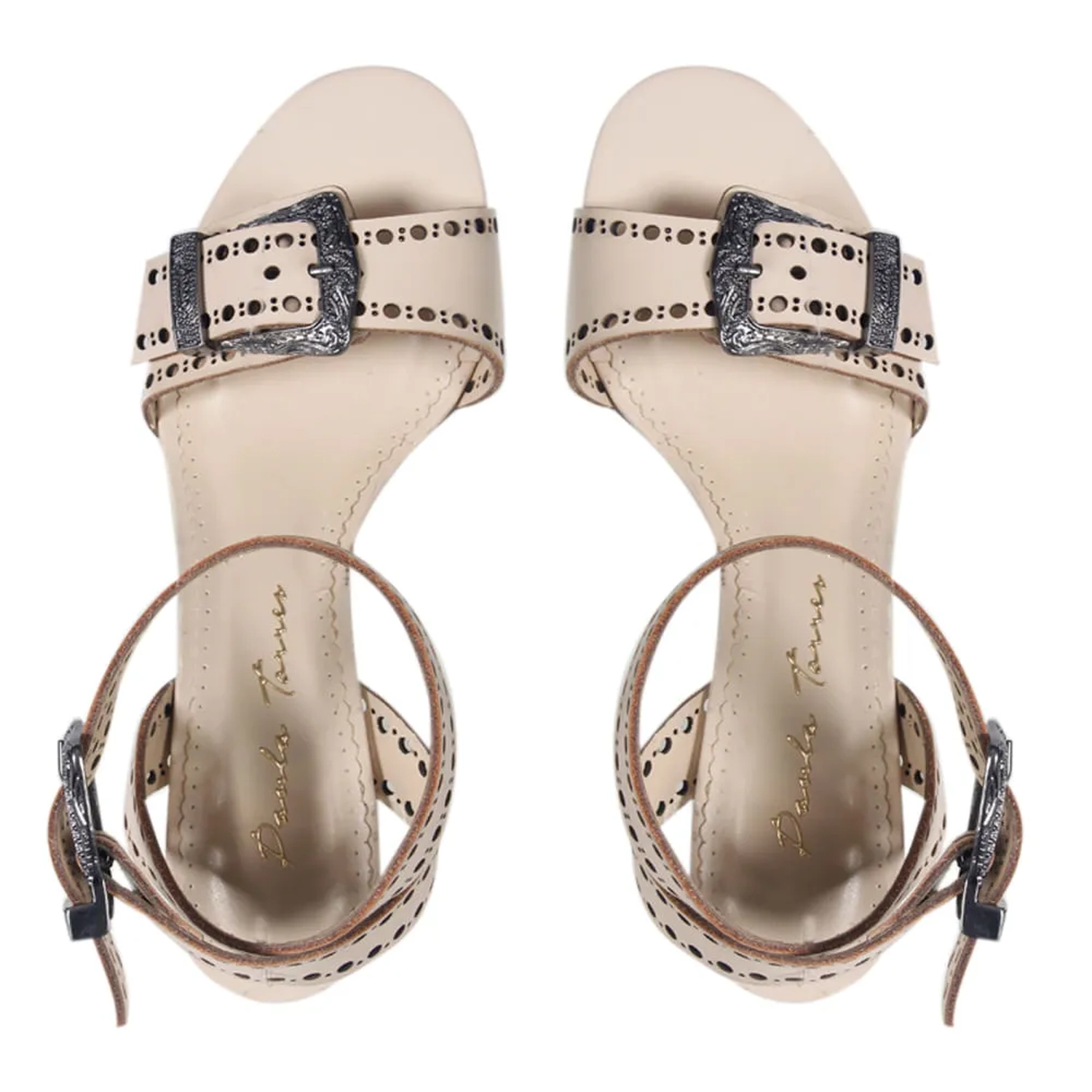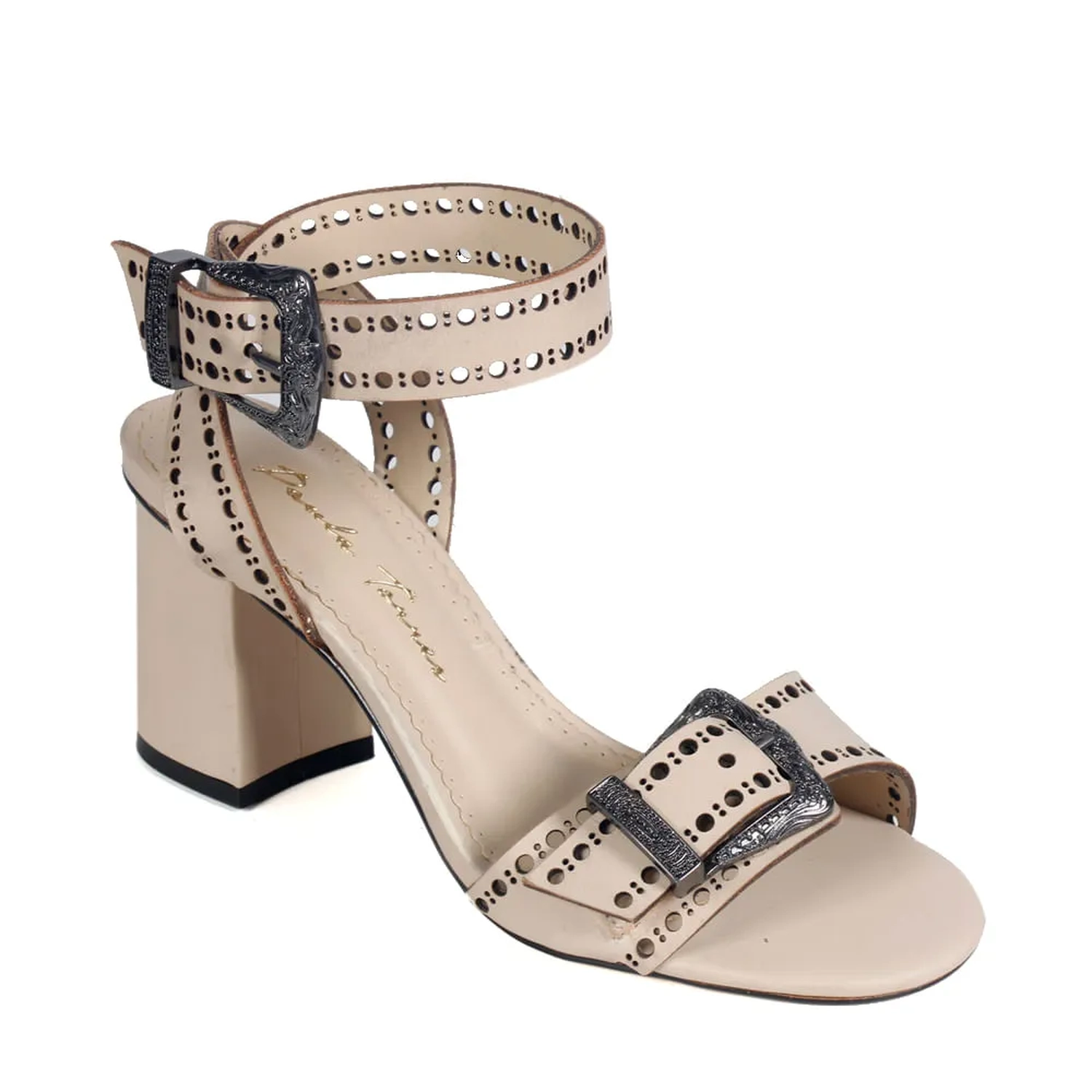 Confeccionada em couro, a Sandália Amalfi possui detalhes que remetem ao estilo Western. Modelagem clássica em bico redondo e salto alto grosso, as tiras de couro trabalhadas e as fivelas estilizadas conferem a estética única Paula Torres.