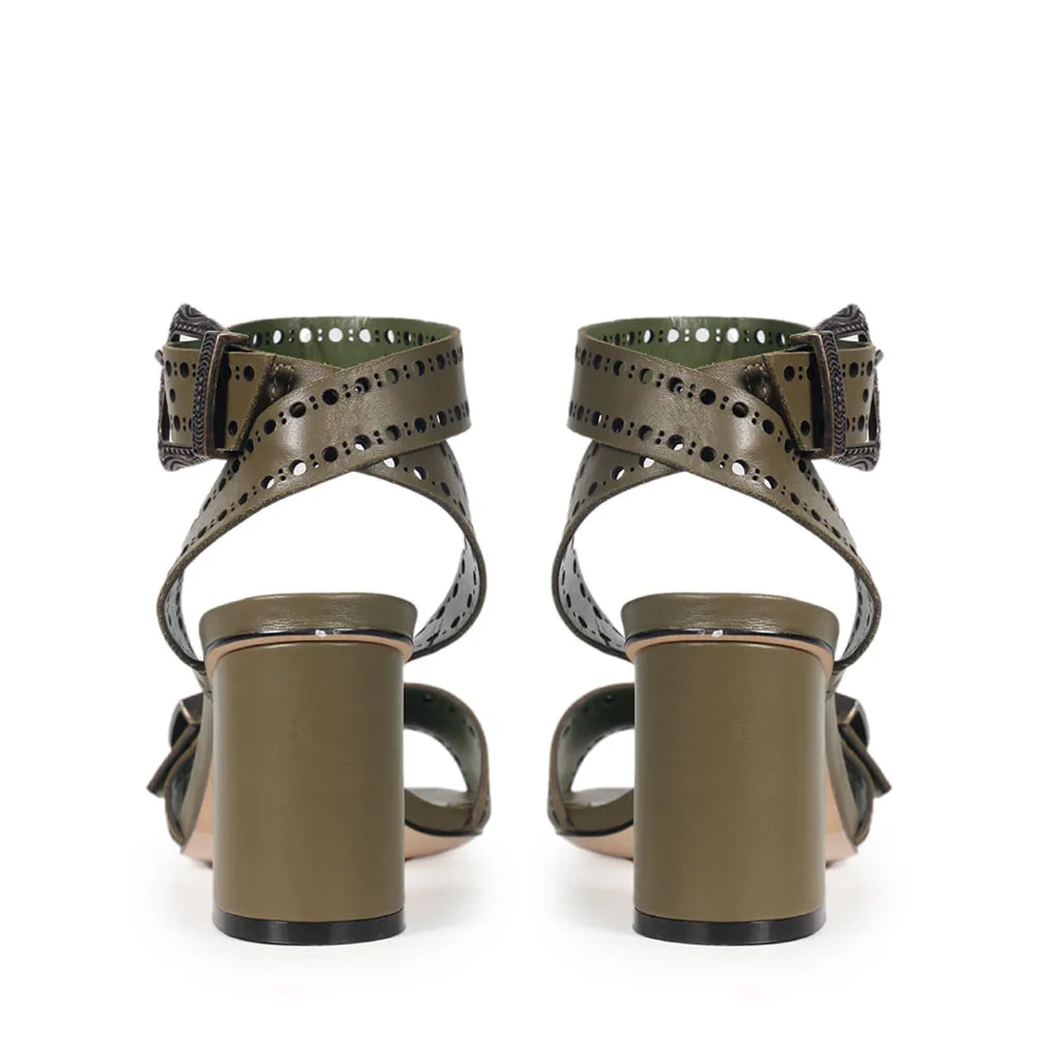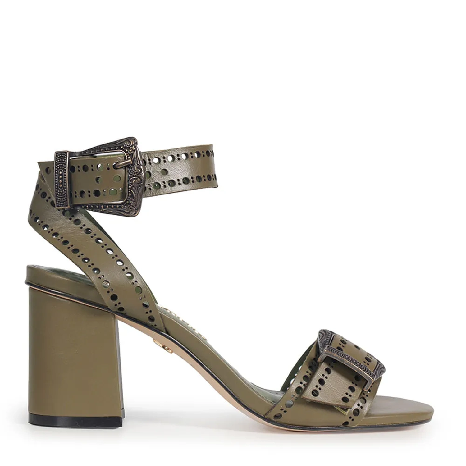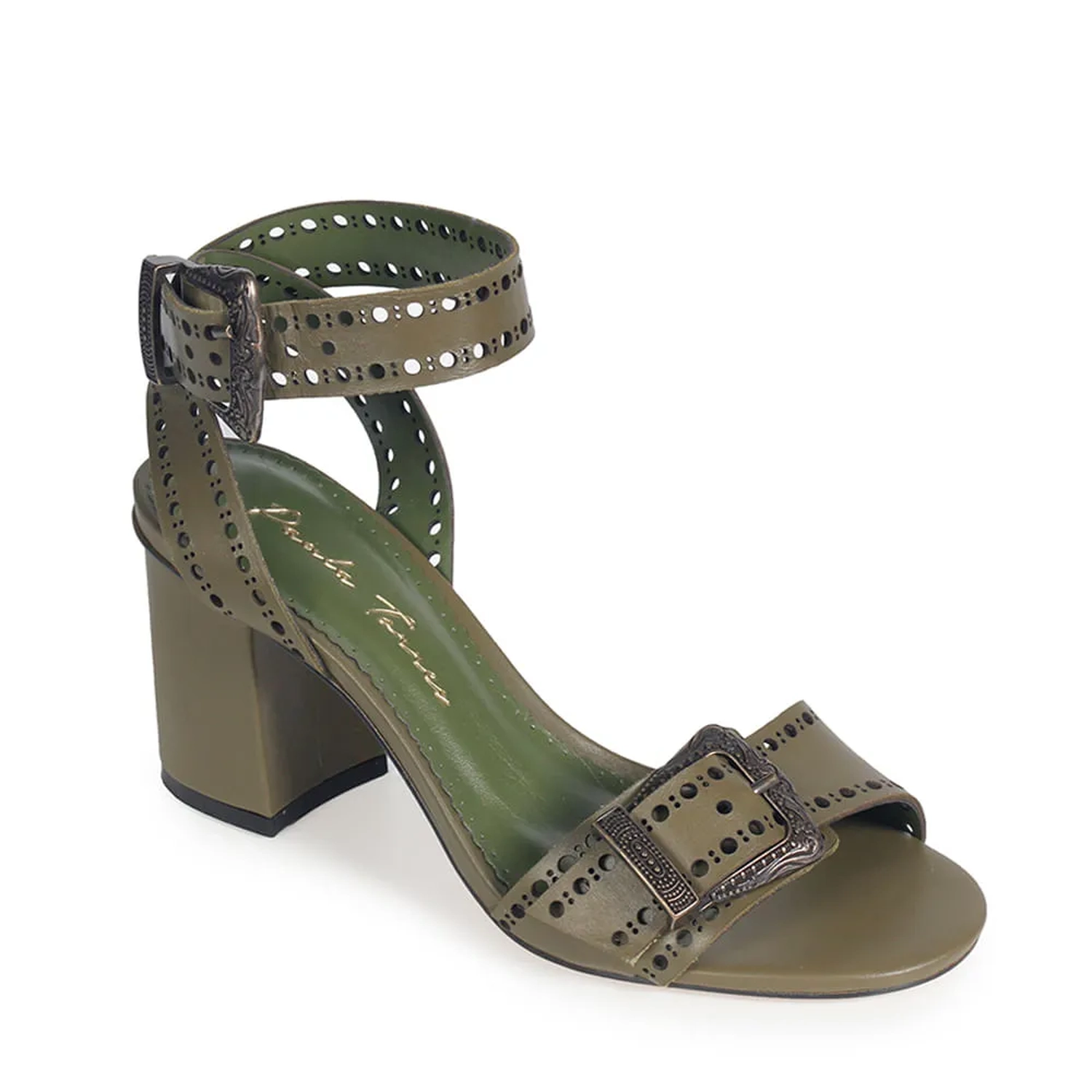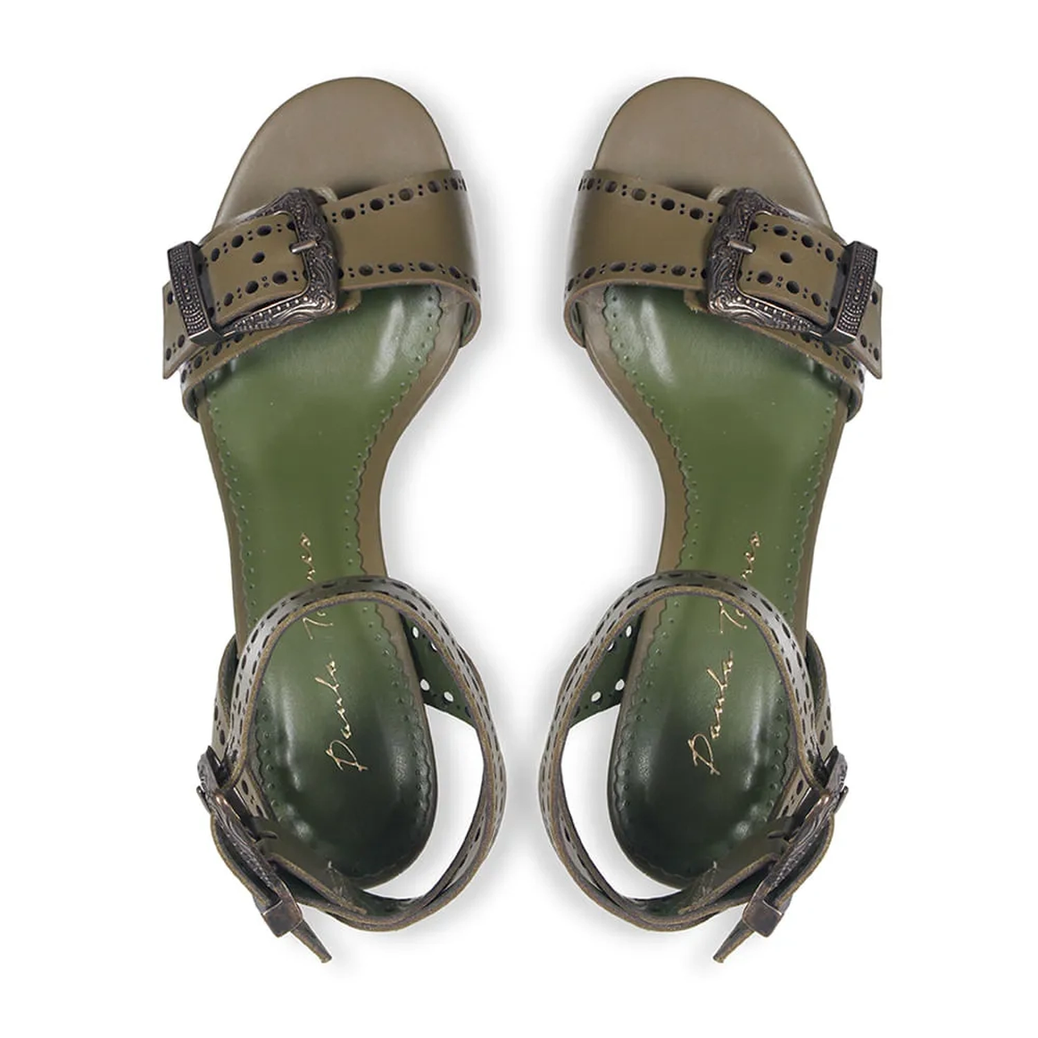 Confeccionada em couro, a Sandália Amalfi possui detalhes que remetem ao estilo Western. Modelagem clássica em bico redondo e salto alto grosso, as tiras de couro trabalhadas e as fivelas estilizadas conferem a estética única Paula Torres.