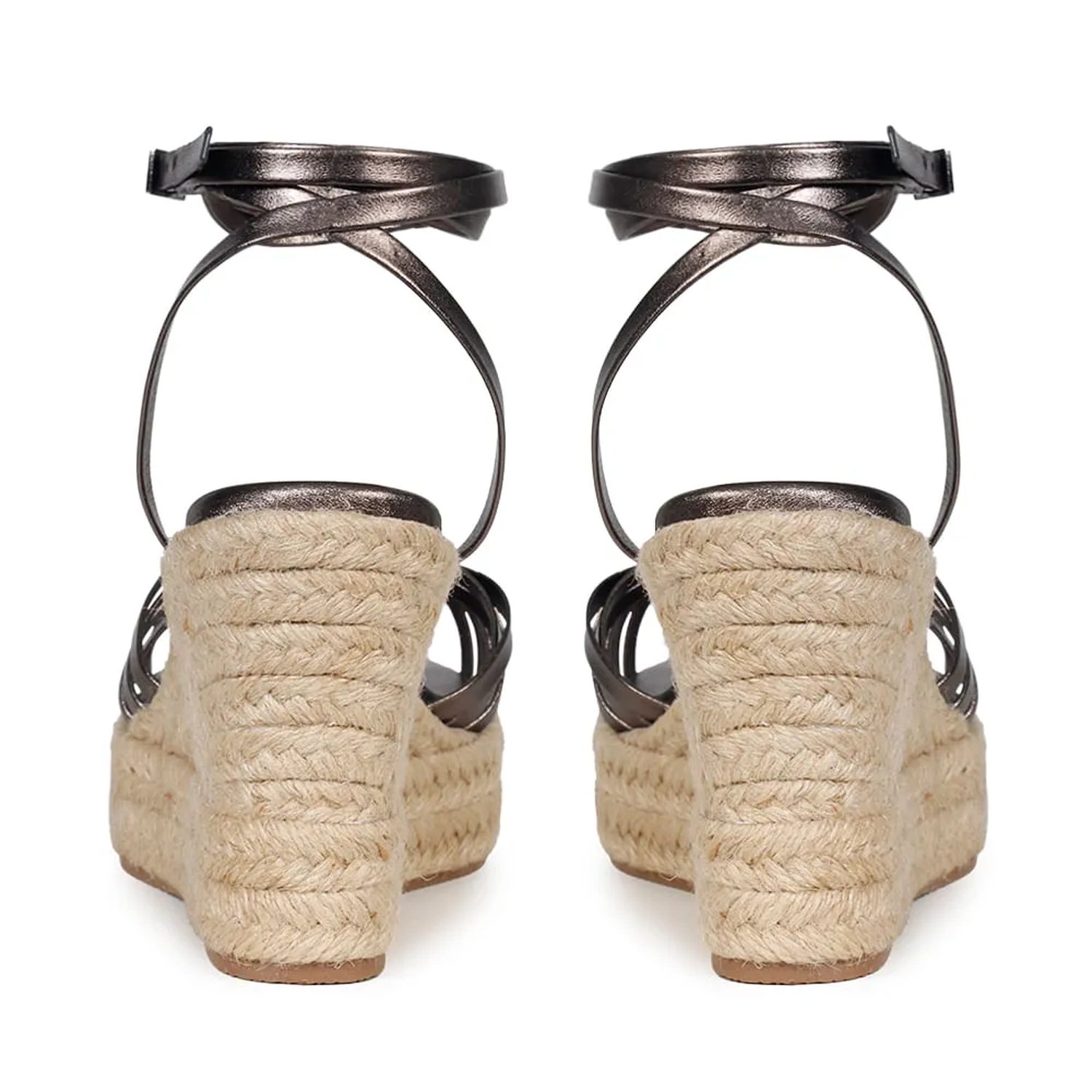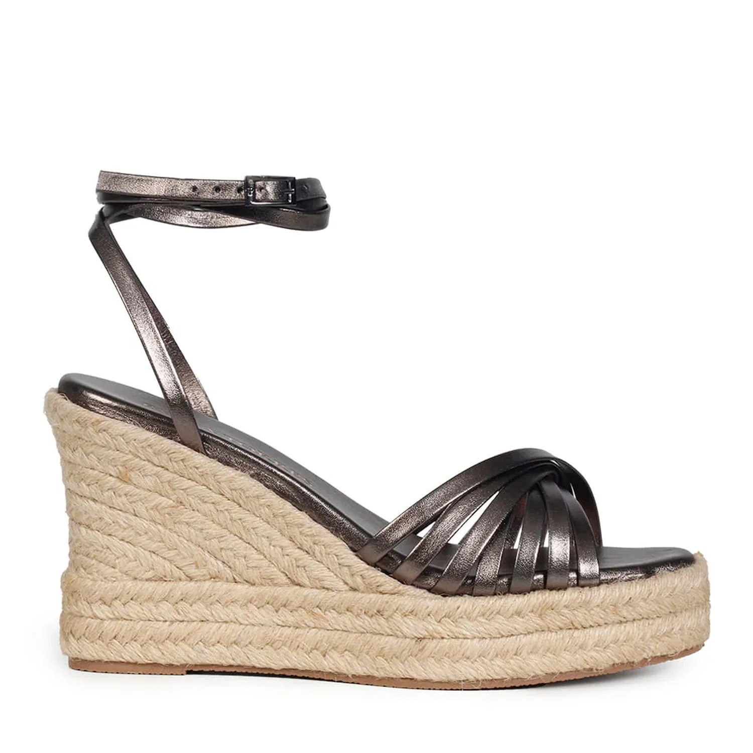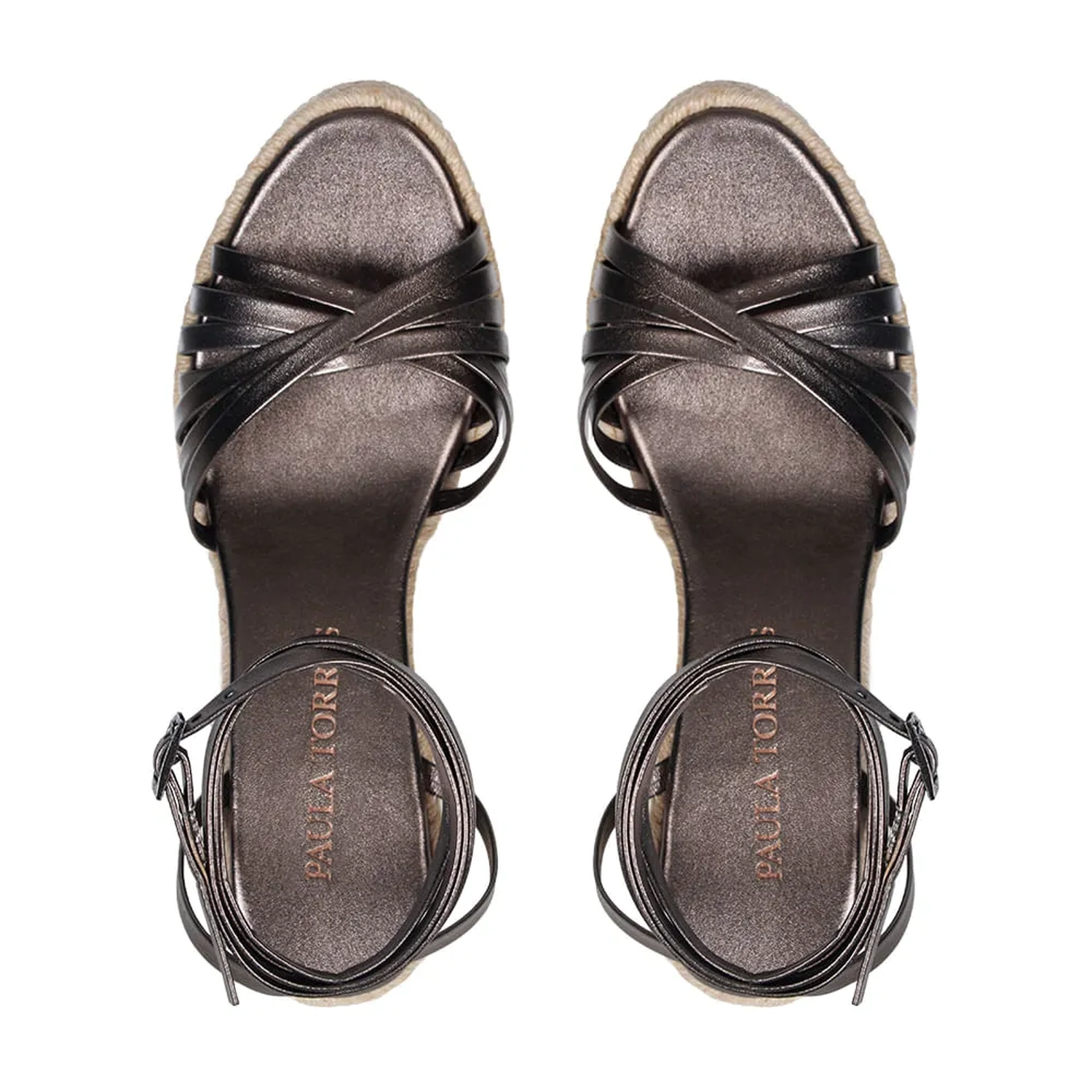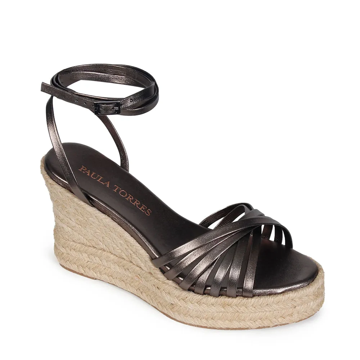 A Anabela Alicia é confeccionada em couro e fibra natural (palha). Modelagem clássica, com o cabedal formado por tiras de couro que se cruzam, criando uma estética sofisticada. O formato do bico arredondado somado ao fechamento por fivela no tornozelo, tornam o modelo ultra feminino. A composição total, com o contraste do couro metalizado e a textura da fibra natural, apresenta um modelo atemporal com traços do DNA da marca.