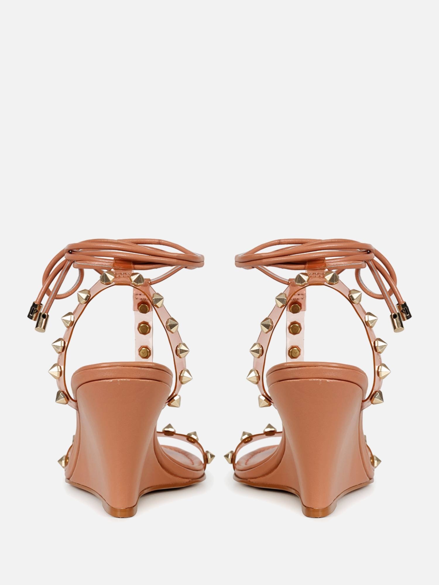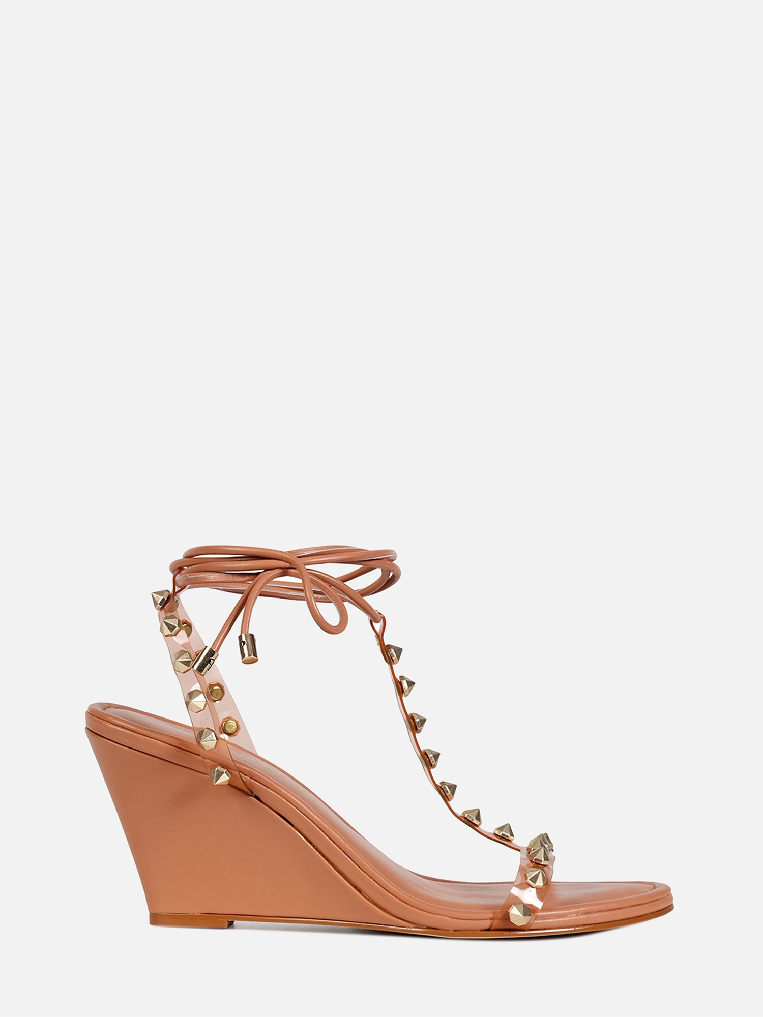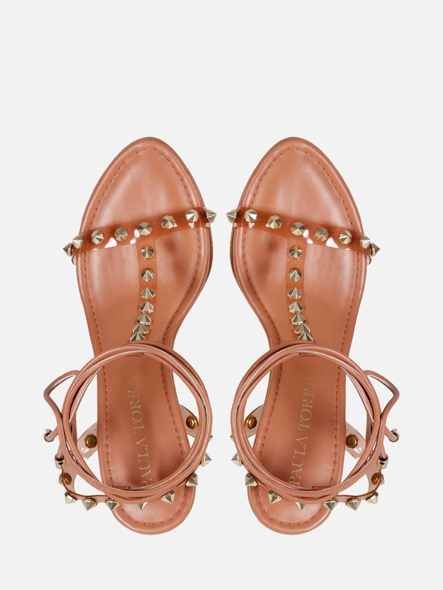 A Anabela Joy é confeccionada em couro. Modelagem em bico arredondado e cabedal em T. O diferencial da peça são a composição de materiais: tiras de vinil, com aplicações de spikes metalizados e couro revestindo toda a base. A combinação das aplicações com a transparência do vinil e o fechamento por amarração no tornozelo, criam uma estética despojada e elegante, totalmente Paula Torres.