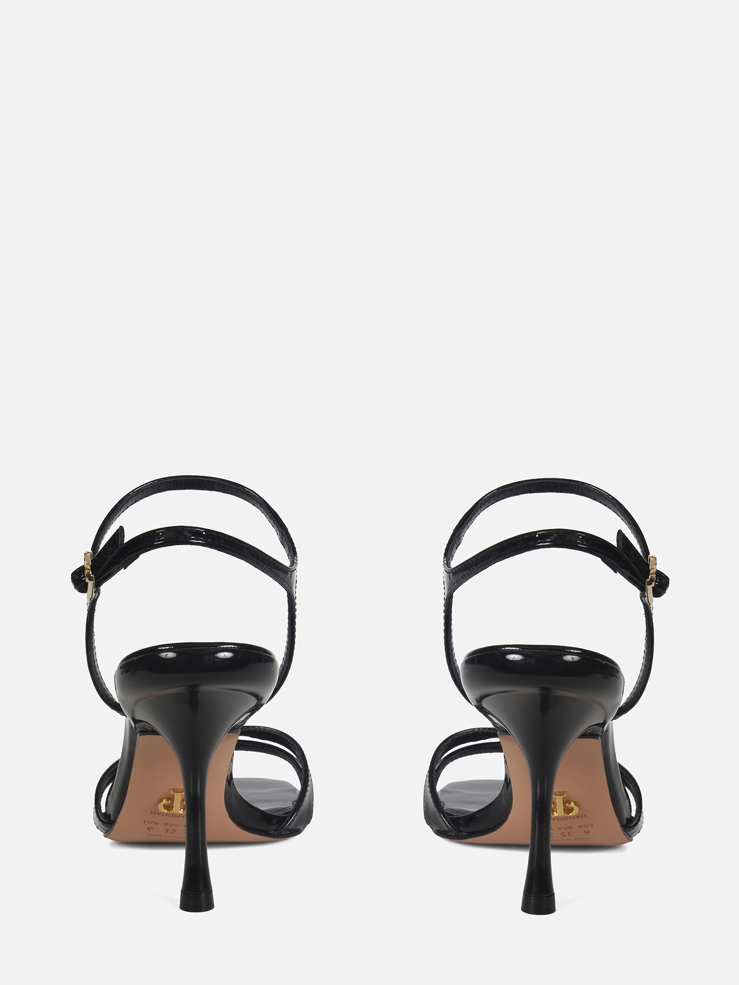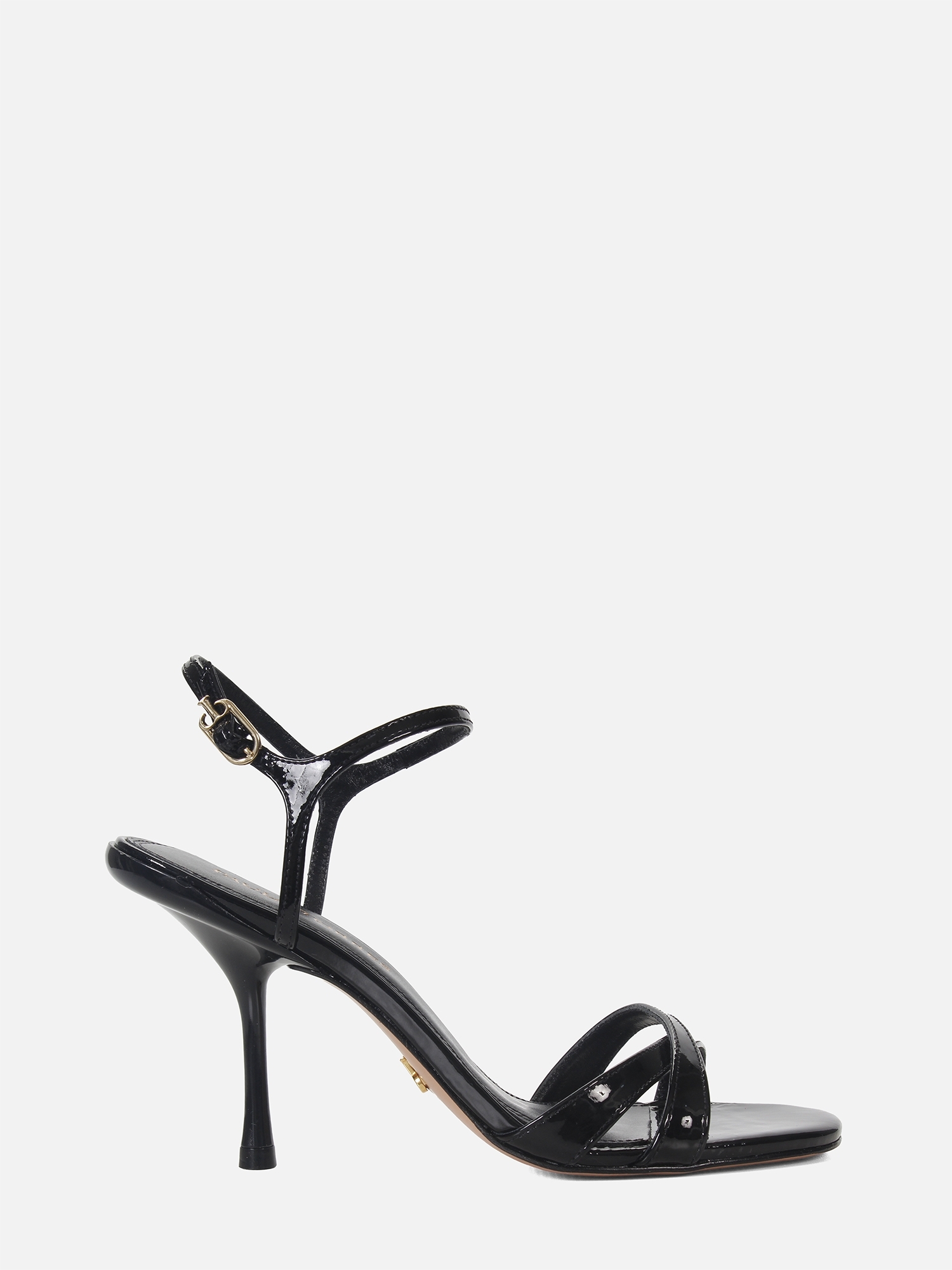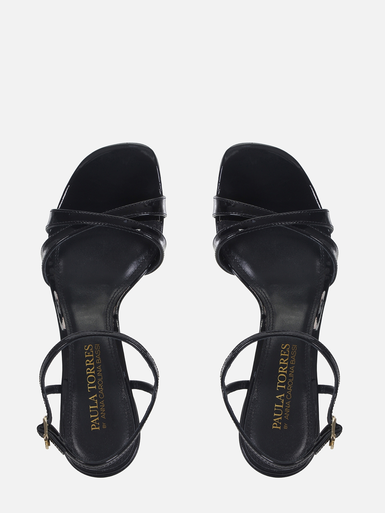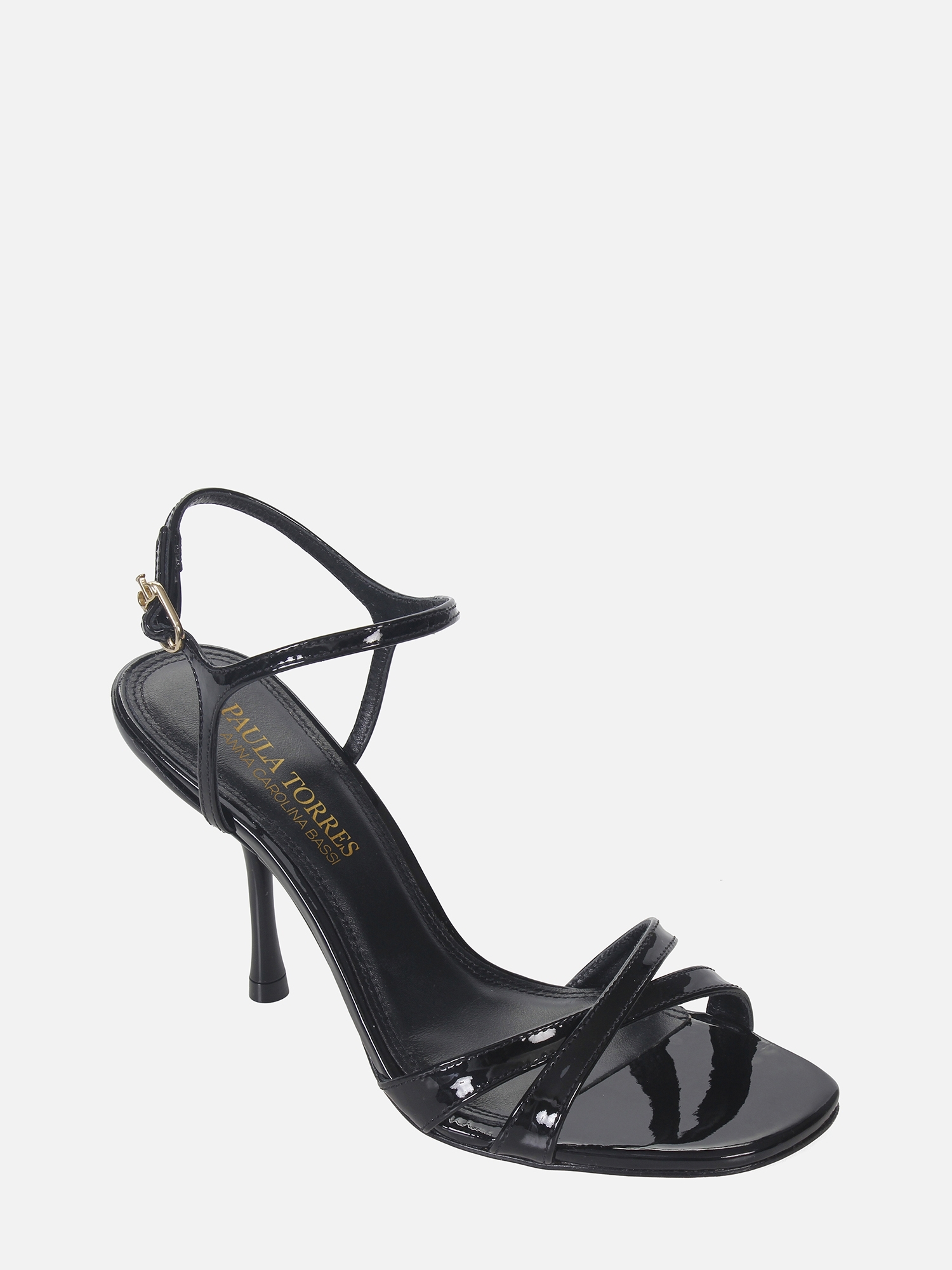 Essa sandália preta com salto fino de 9,7 cm confere altura ao caminhar sem abrir mão da delicadeza. O conjunto de tiras cruzadas, aliado ao brilho do verniz, valoriza o visual e oferece um toque moderno e elegante.